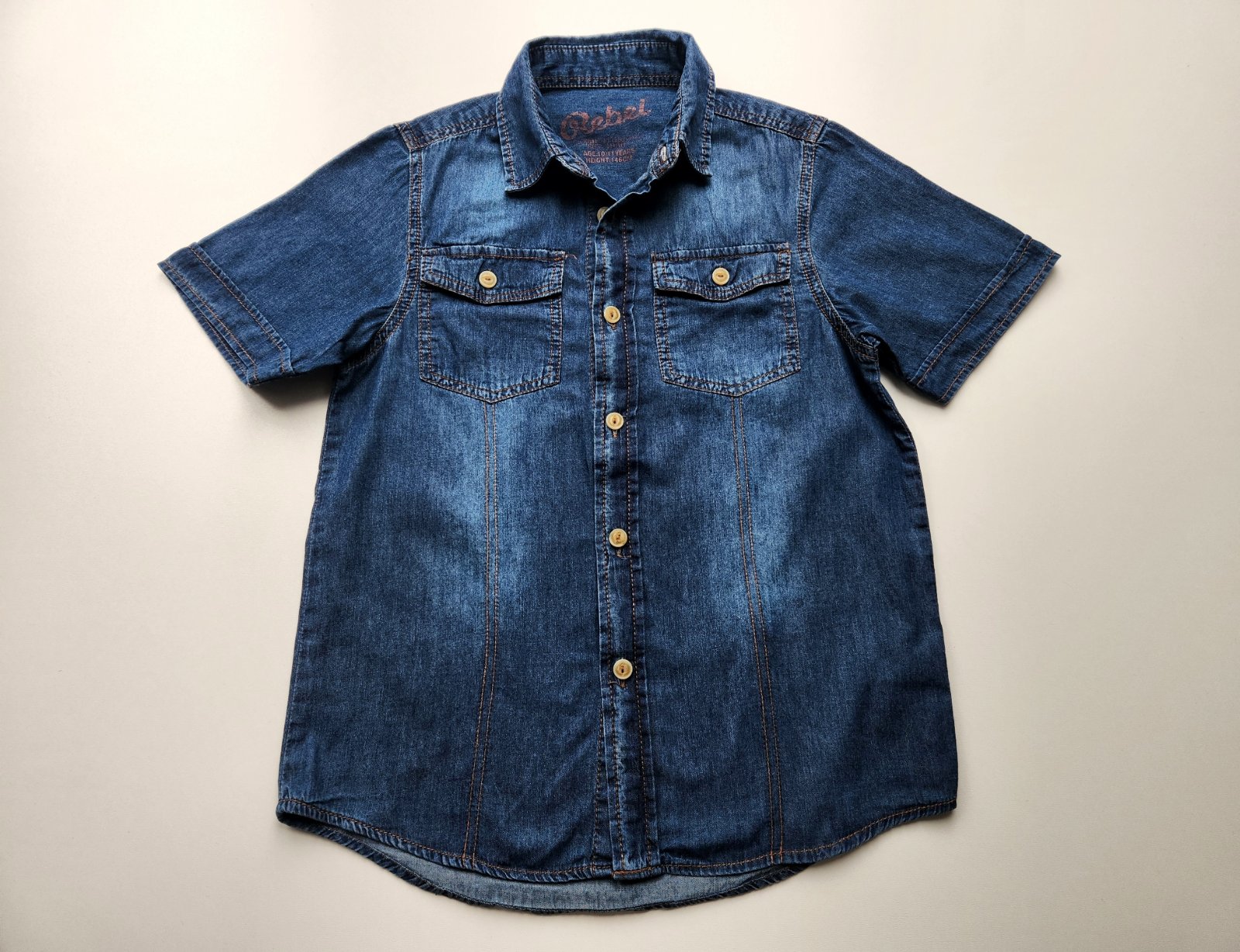 Modrá košile v riflovém vzhledu zn. REBEL, knoflíky, kapsy s klopou na knoflík, dvojité kontrastní prošívání.
