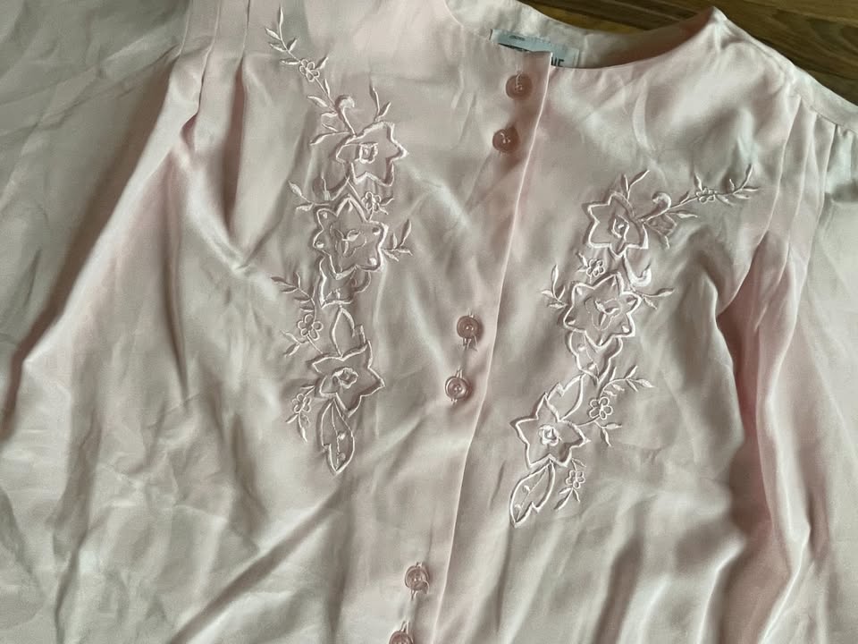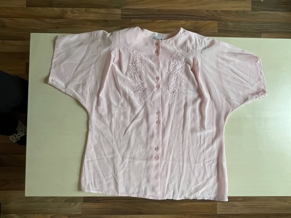 2362. nabízím k prodeji tuto tenkou světle růžovou halenku s výšivkou, vel 10/M, Anne Klein. Materiál umělý, tenoučký, 100% polyester. Na hrudník výšivka. V ramenou vycpávky, jsou přichycené z každé strany stehem uvnitř. U jedné se z jedné strany šití uvolnilo a drží jen z jedné. Vidět není a drží na tom druhém stehu - případně lze znovu došít. Nošená, až na uvedené bez vad, krásná. Barva více odpovídá, kde ji mám na sobě, foťák bere barvy.