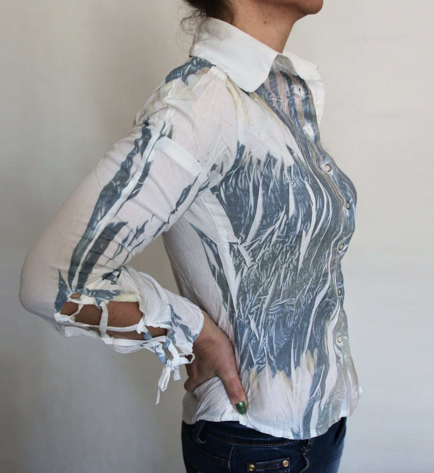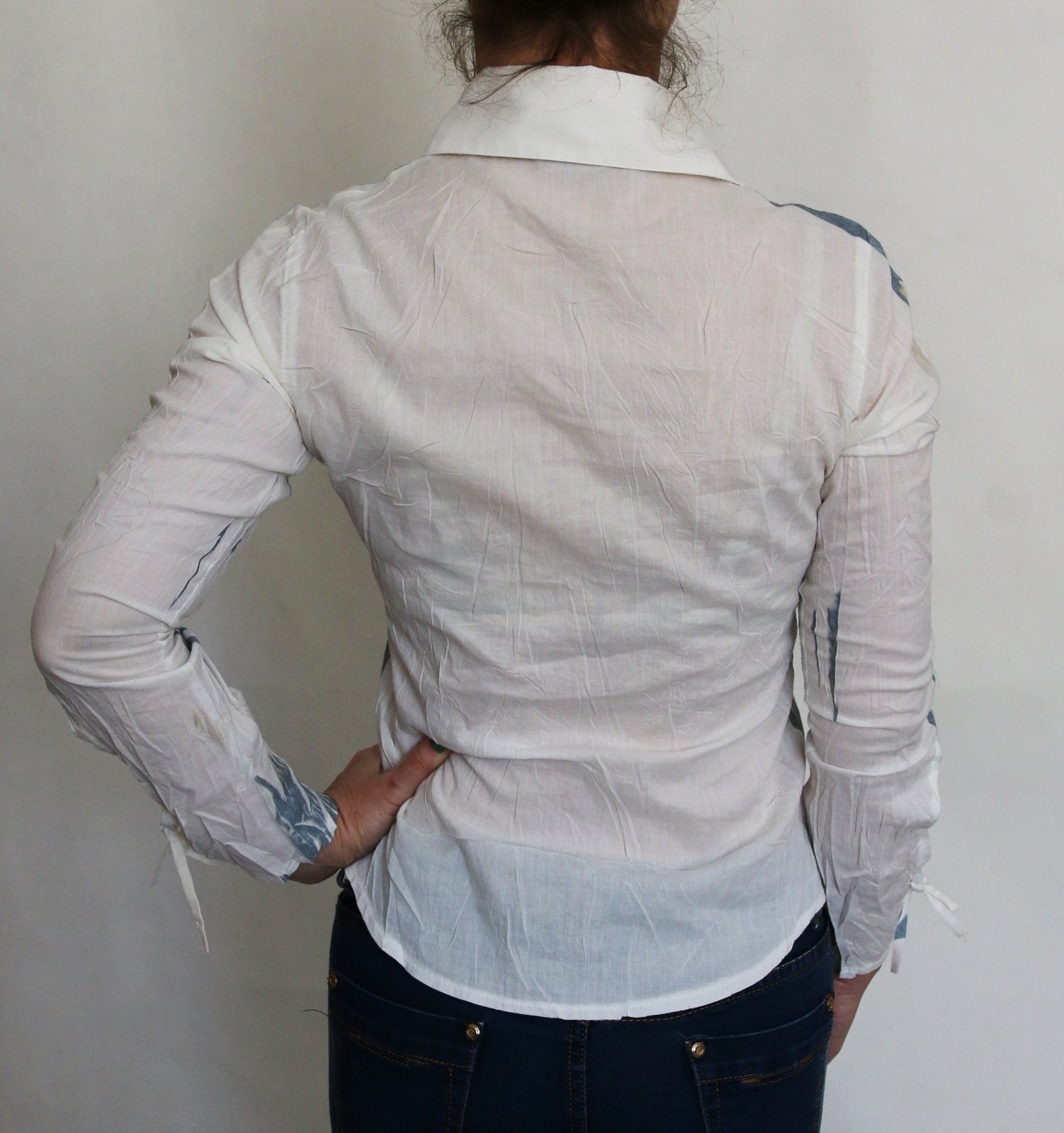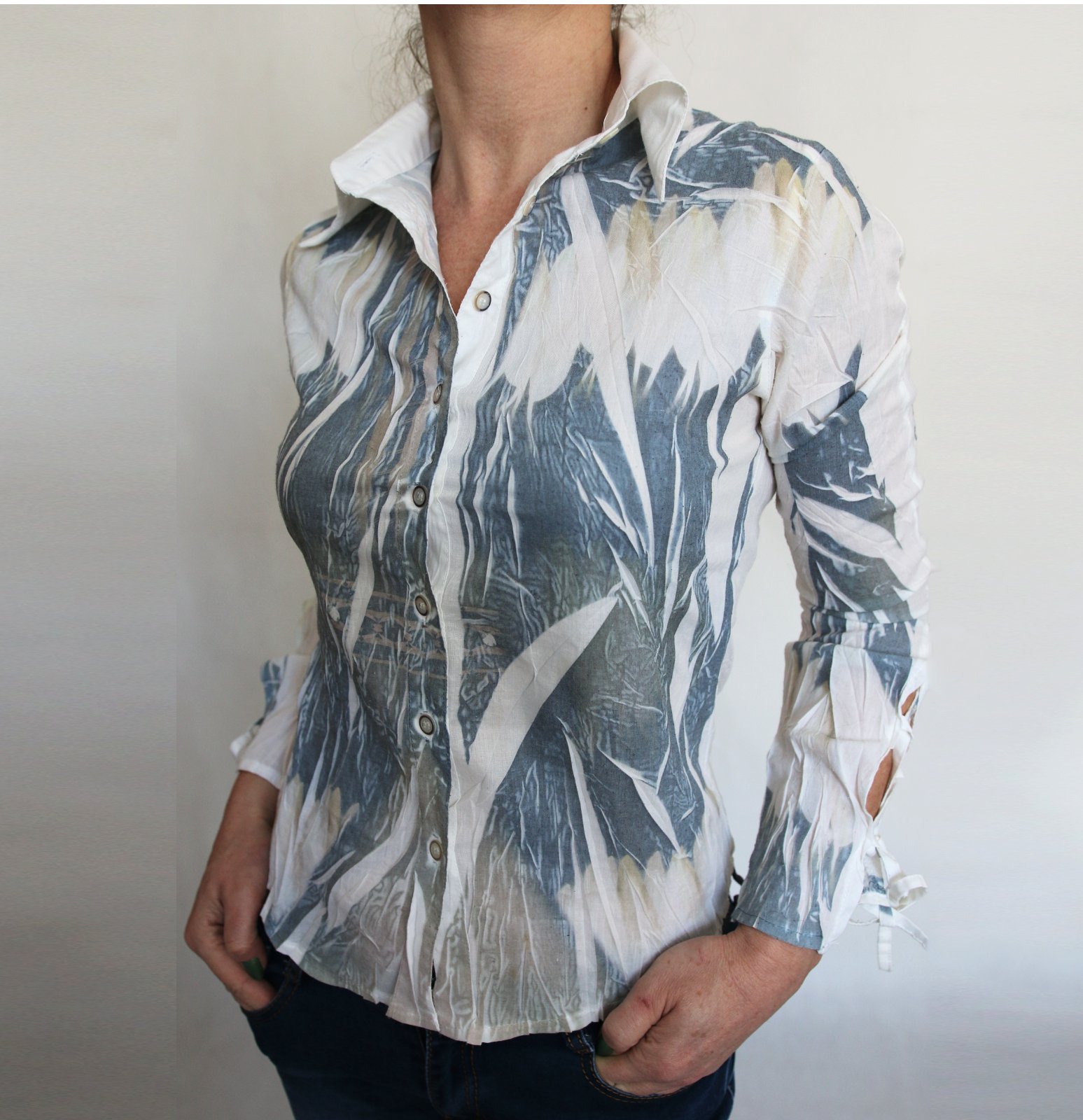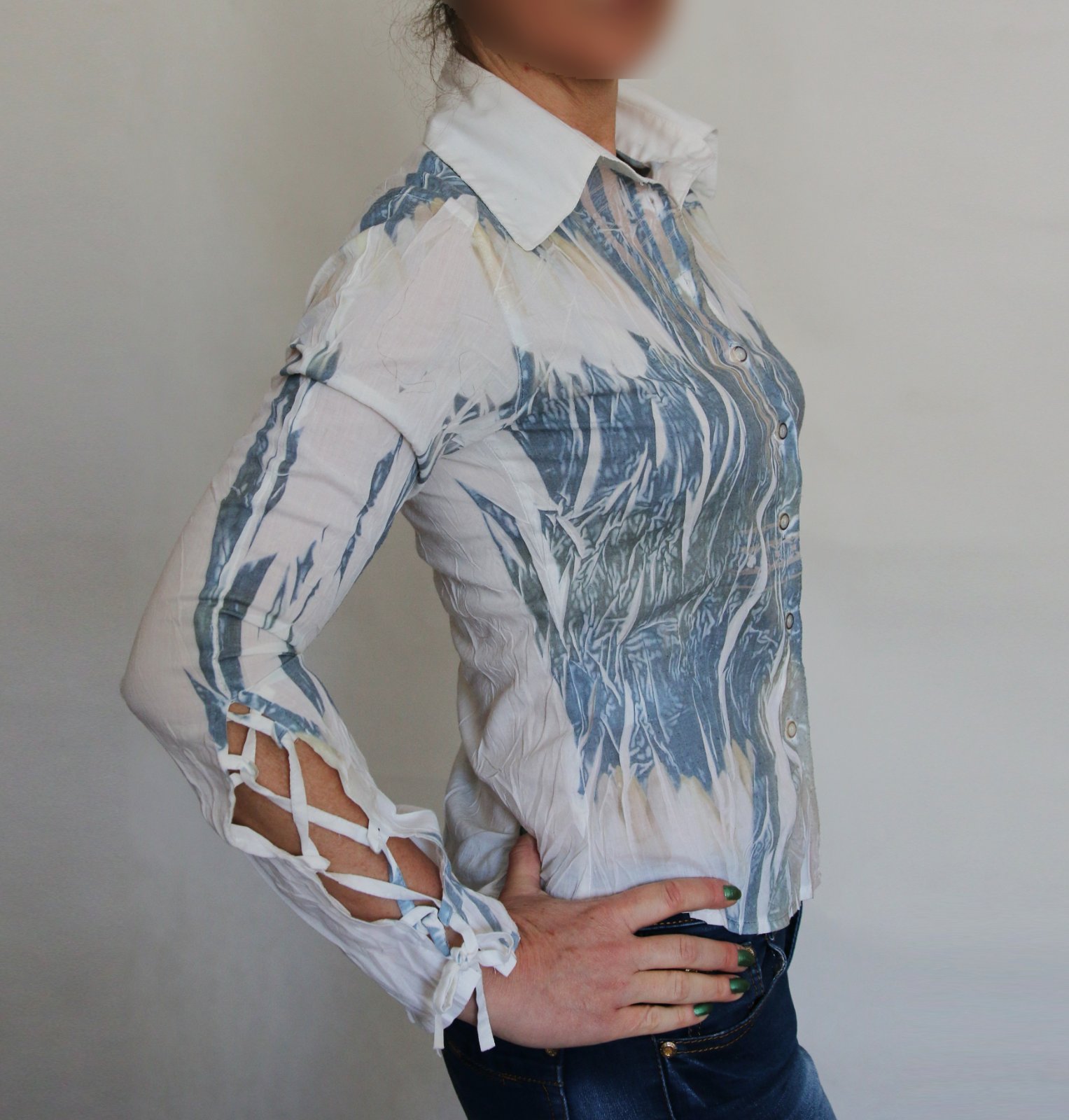 Zajímavá tenká košile Promod, bílá s modrým batikovým potiskem a krčeným efektem. Záda jsou bílá. Na rukávech od loktů je šněrování. Materiál košile je velmi jemný, působí jako tenká bavlna, ale jedná se o směs bavlny s polyesterem. Rozměrově sedí na S: šířka ramen 38 cm, přes prsa 88 cm, pas 76 cm, délka 58 cm, délka rukávu 59 cm. Košile vůbec nepruží. Oblečená pár krát, v perfektním stavu bez vad. Odeslání poštou, Balíkovnou nebo Zásilkovnou, cenu za odeslání sdělím předem.