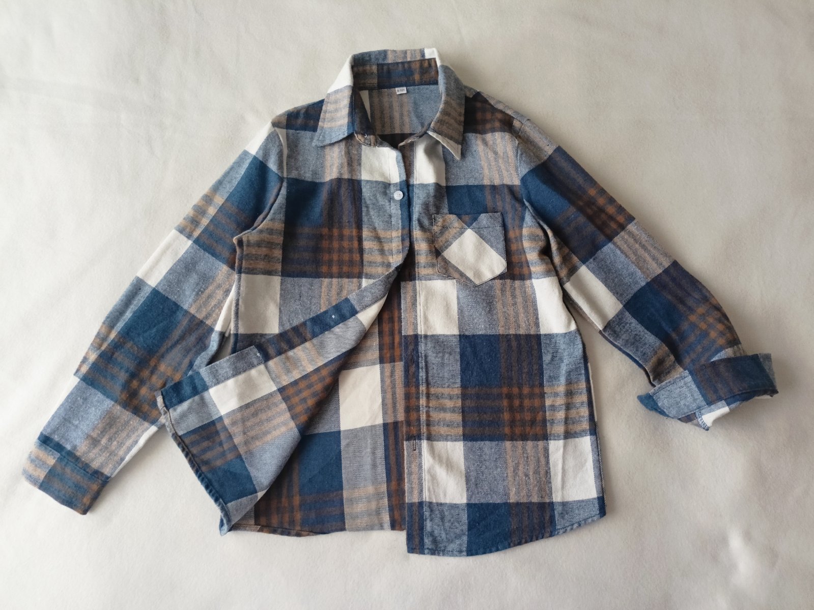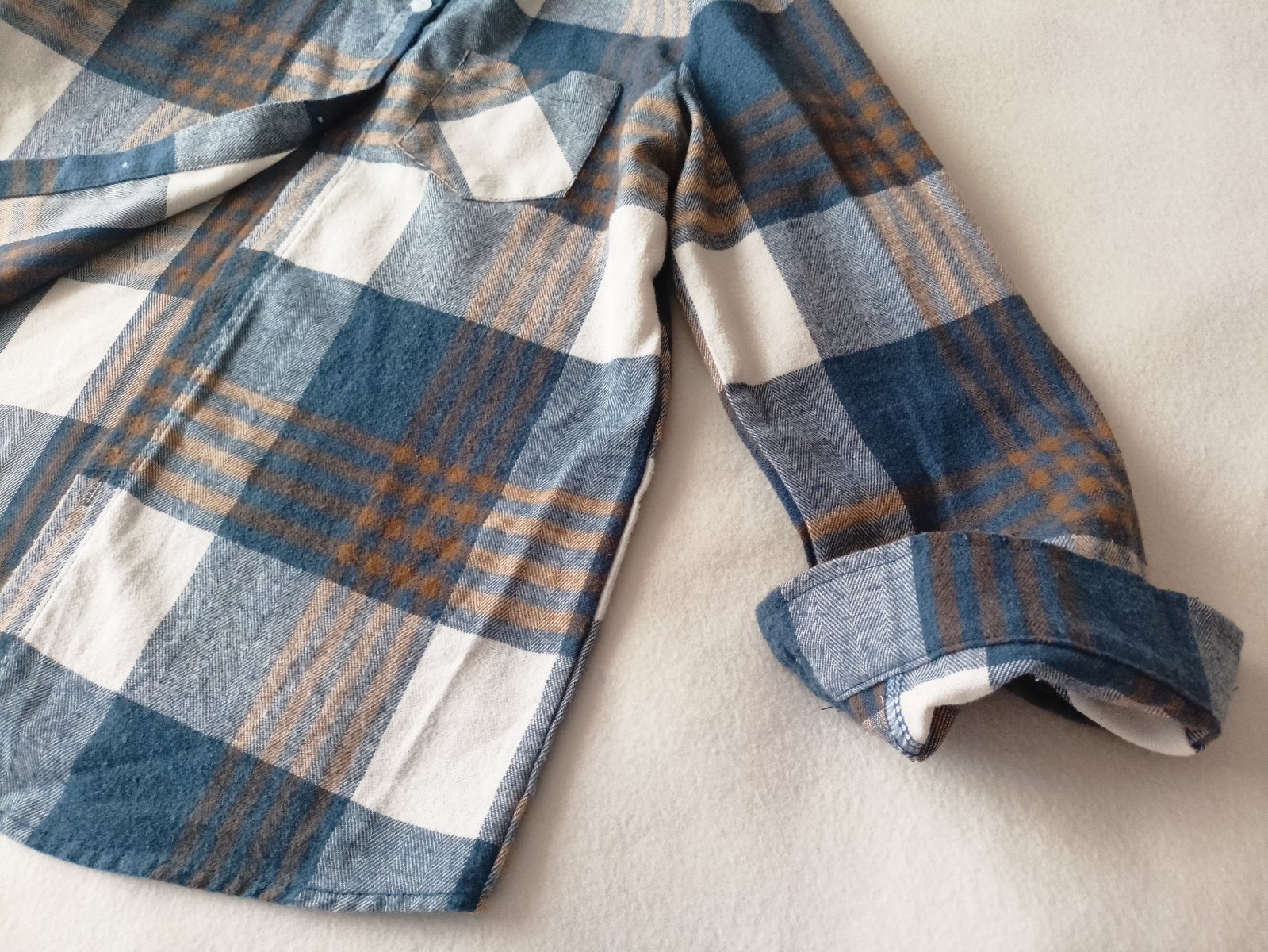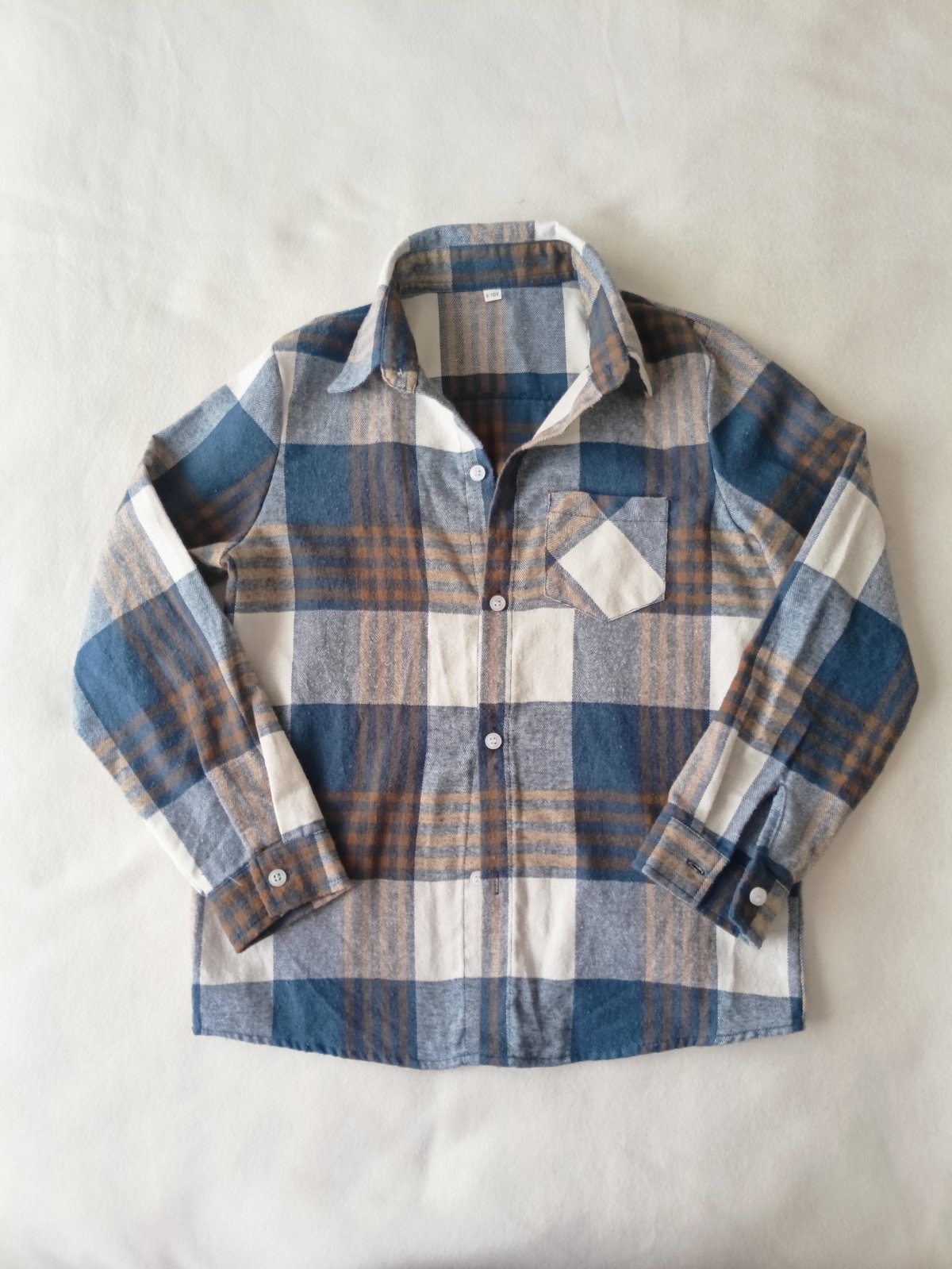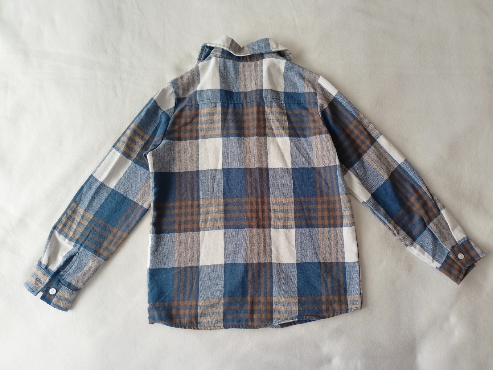 Prodám dětskou košili, vel. 128/134 s dlouhým rukávem v moderním kostkovaném vzoru (kombinace modré, hnědé a krémové barvy). Košile je vyrobena z příjemného a pevnějšího materiálu, ideální do školy i pro volný čas.