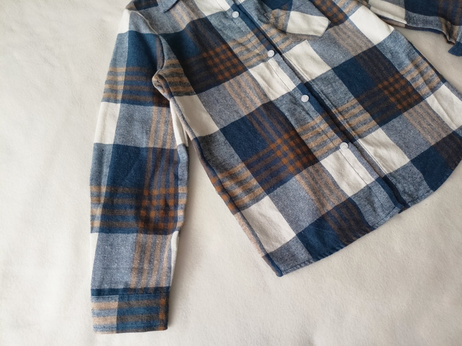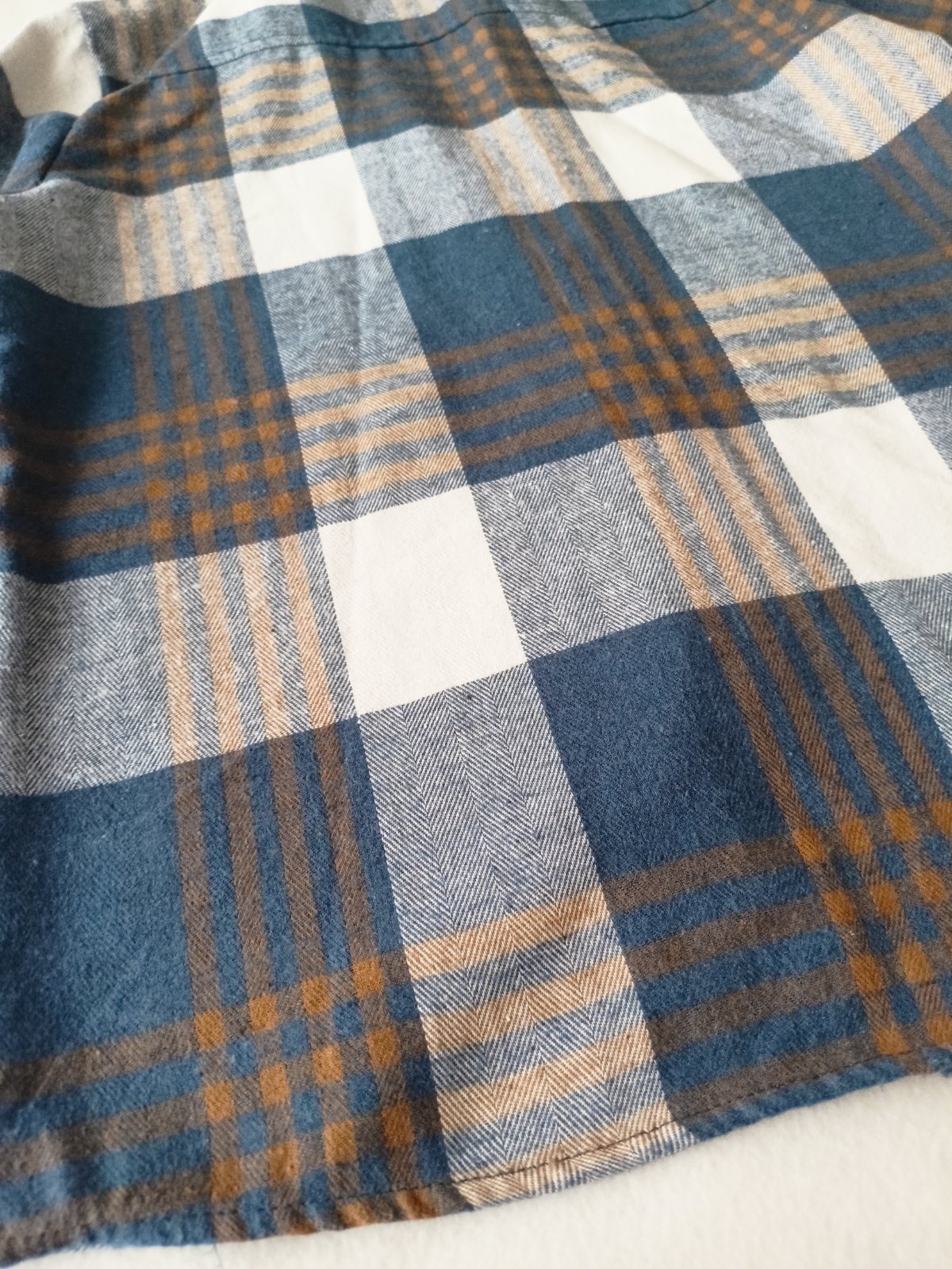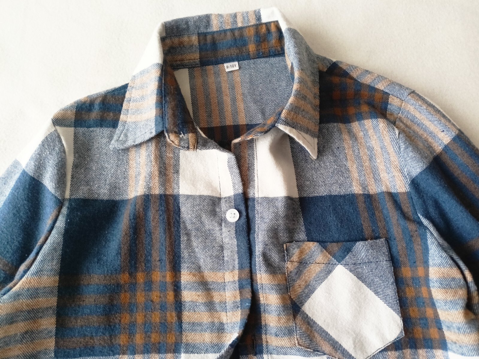 Prodám dětskou košili, vel. 128/134 s dlouhým rukávem v moderním kostkovaném vzoru (kombinace modré, hnědé a krémové barvy). Košile je vyrobena z příjemného a pevnějšího materiálu, ideální do školy i pro volný čas.