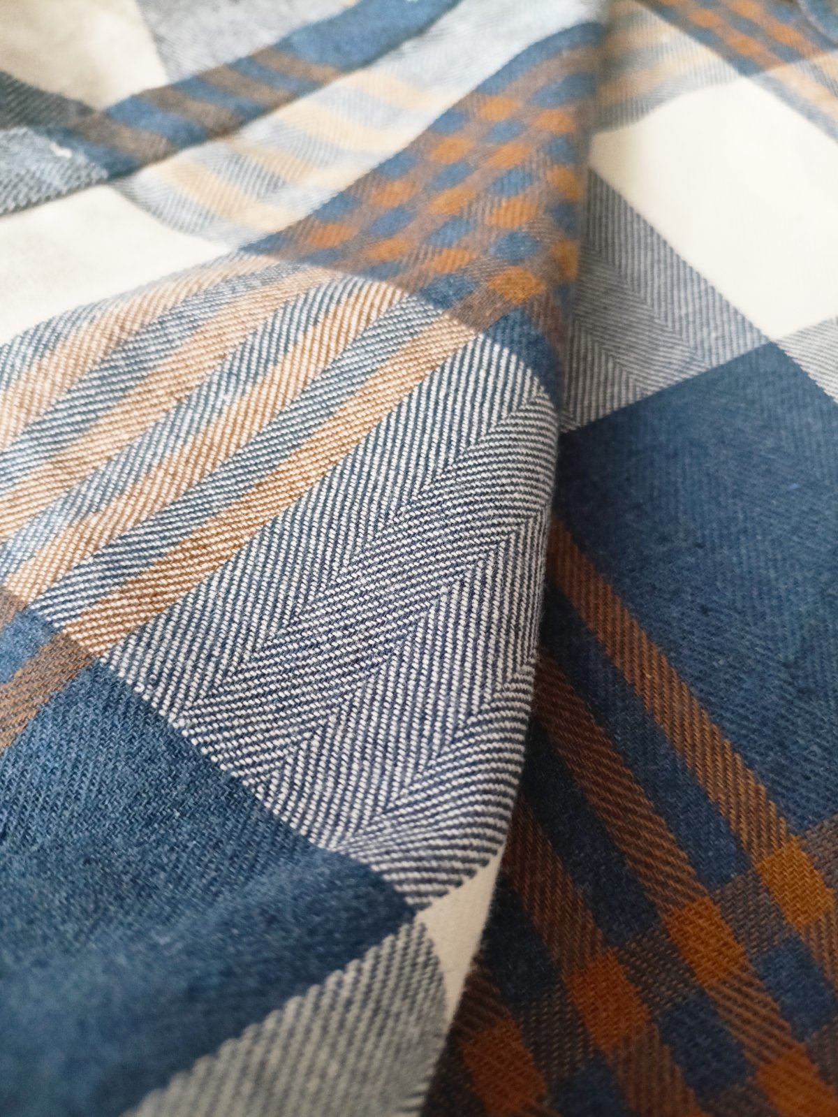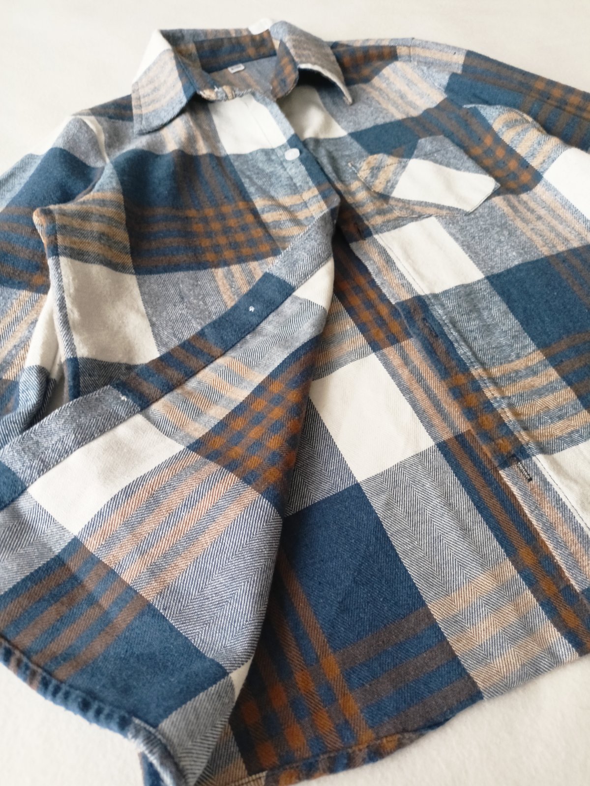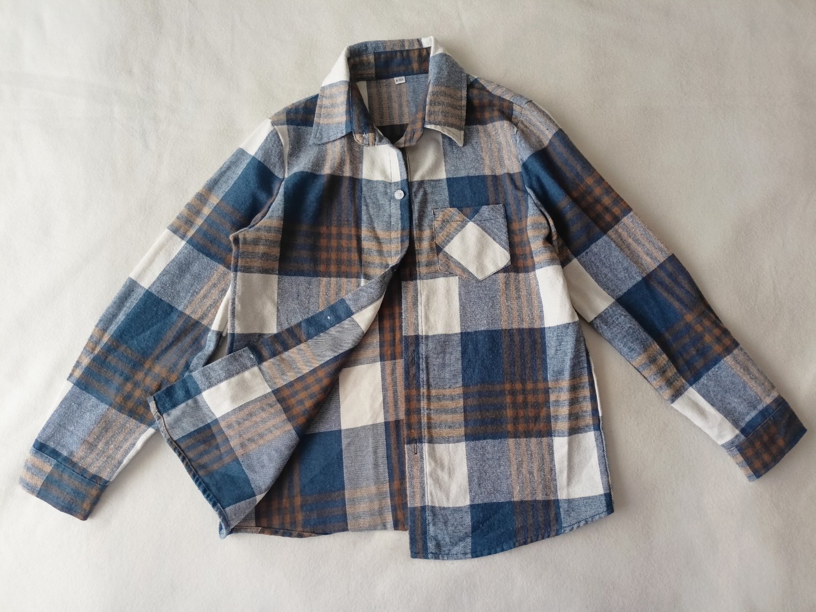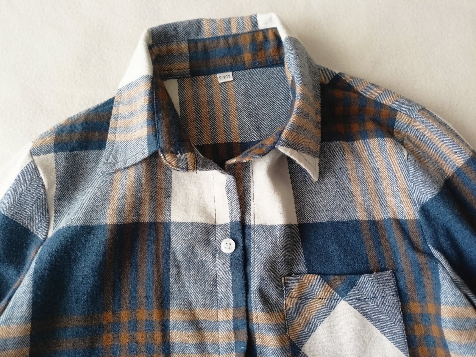 Prodám dětskou košili, vel. 128/134 s dlouhým rukávem v moderním kostkovaném vzoru (kombinace modré, hnědé a krémové barvy). Košile je vyrobena z příjemného a pevnějšího materiálu, ideální do školy i pro volný čas.