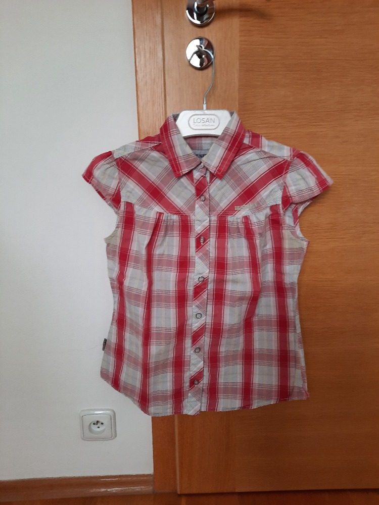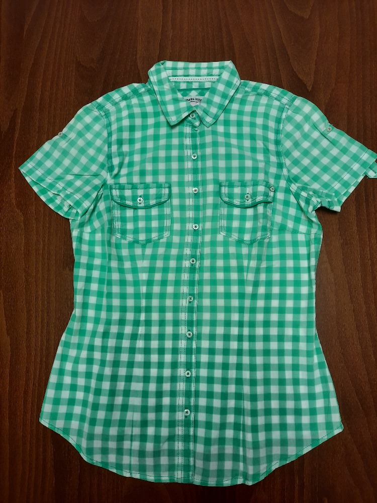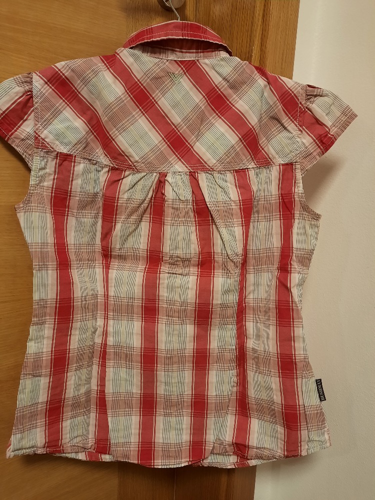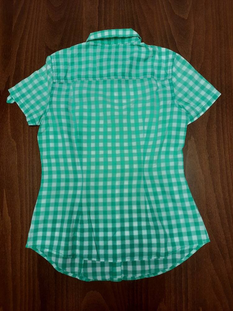 Dívčí košile s kr. rukávem, zapínání na ozdobné druky. Na předních dílech jsou dvě náprsní kapsičky, košile je mírně vypasovaná. Velikost je udána L, odpovídá věku 13-14let, délka předního dílu od ...