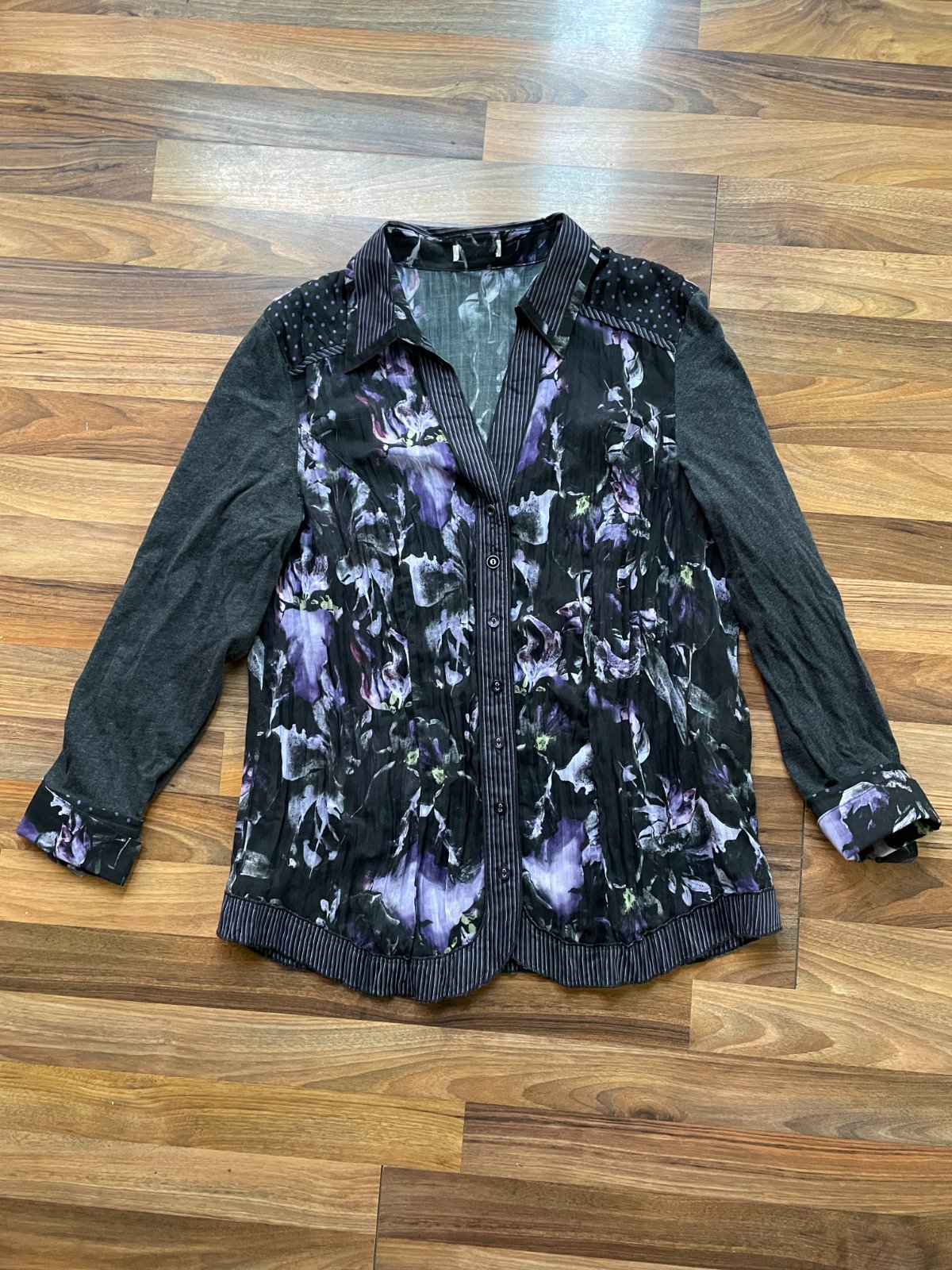 jar. nabízím k prodeji tuto novou halenku/košili z různých vzorů a materiálů, vel 46, tedy cca XXXL, Bonita. Nenošená, outlet a za krkem je ustřižená cedulka. Vnitřní zůstala i se sáčkem s náhradním knoflíky. Různé materiály, rukávy jako tenkýž úplet. Nenošená, bez vad, krásná