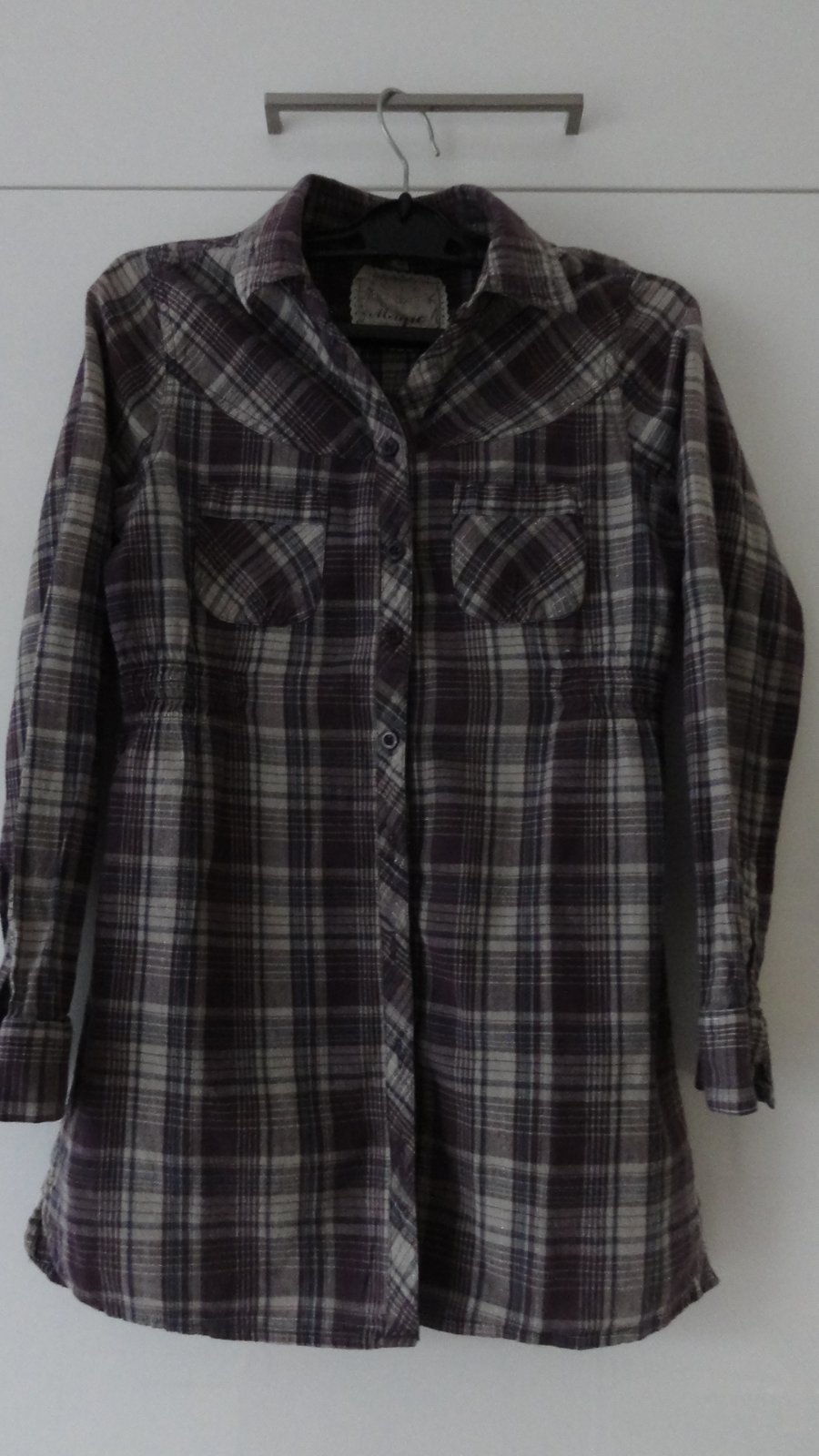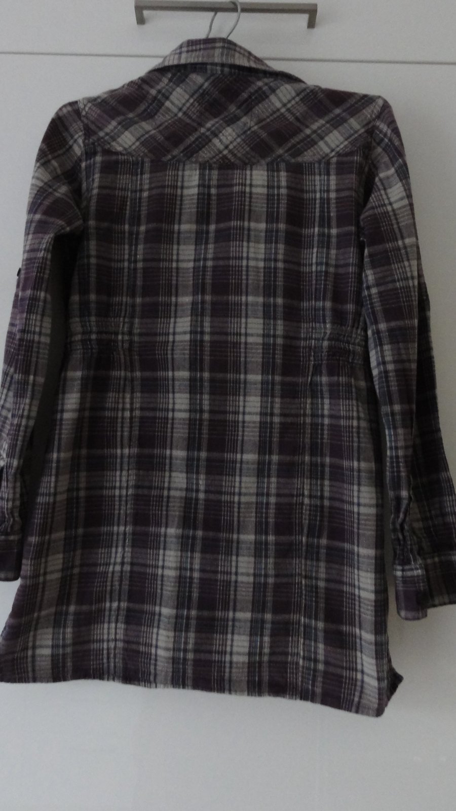 Delší košile s dlouhým rukávem, velikost 146/152, v pase po bočních stranách gumička, rukávy můžeme zkrátit a připnout knoflíkem.