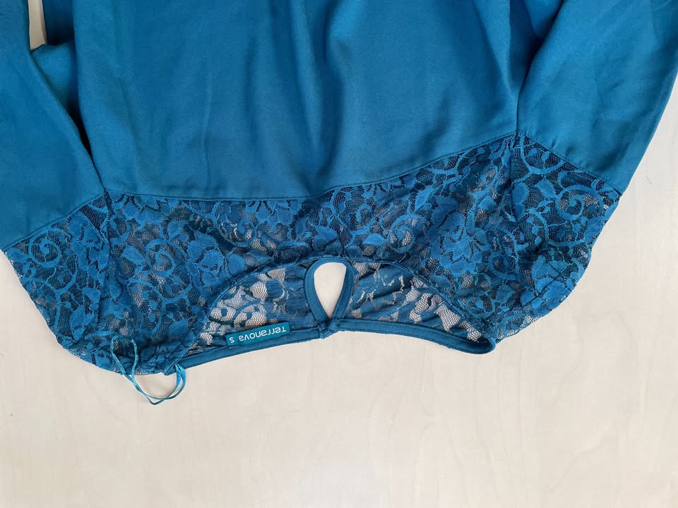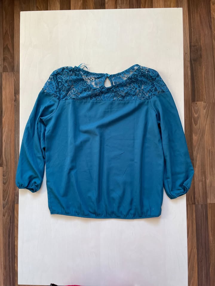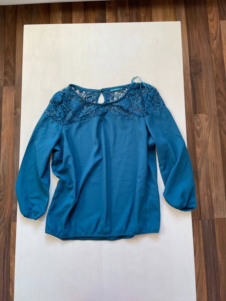 326. nabízím k prodeji tuto halenku s krajkou, vel S, terranova. Barva taková petrolojová, není čistě modrá, jak působí na fotu, nádech do zelena. 97% polyester, 3% elasten. Nošená, bez vad, krásná