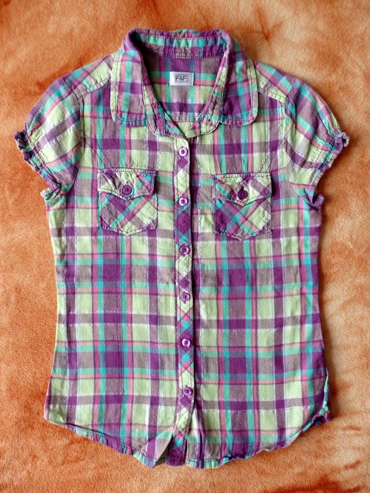 Pěkná halenka, kombinace fialové, růžové, zelené a tyrkysové, blýskavé nitky, dvě kapsičky, prodloužený zadní i přední díl. Dobrý stav.