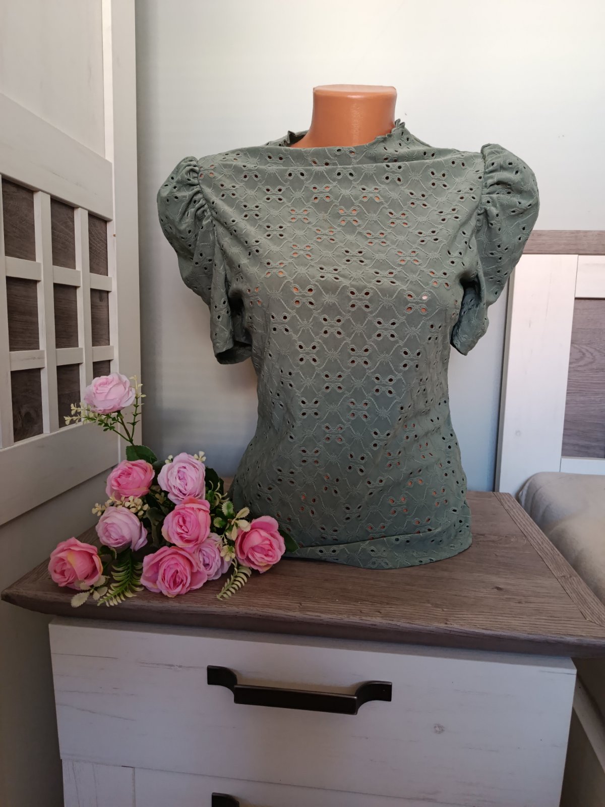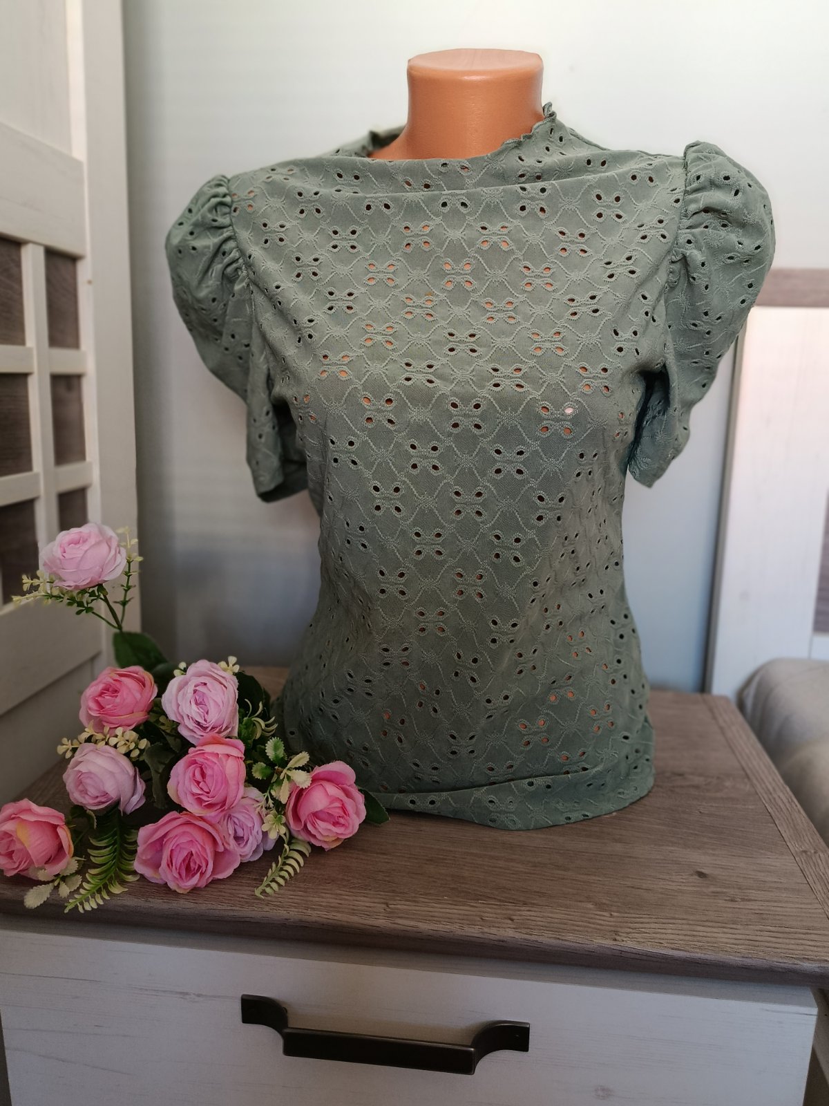 Super madeirová halenka s nabíranými rukávy ... Je v perfektním stavu, elastická....Míry : délka 61 cm, pas 2 x 39 cm, průramky 2 x 43 cm, délka rukávu od krku je 34 cm. Materiál : 95 polyester a 5 % elastanu.Poštovné - balíkovna za 85 Kč nebo zásilkovnou za 90 Kč.