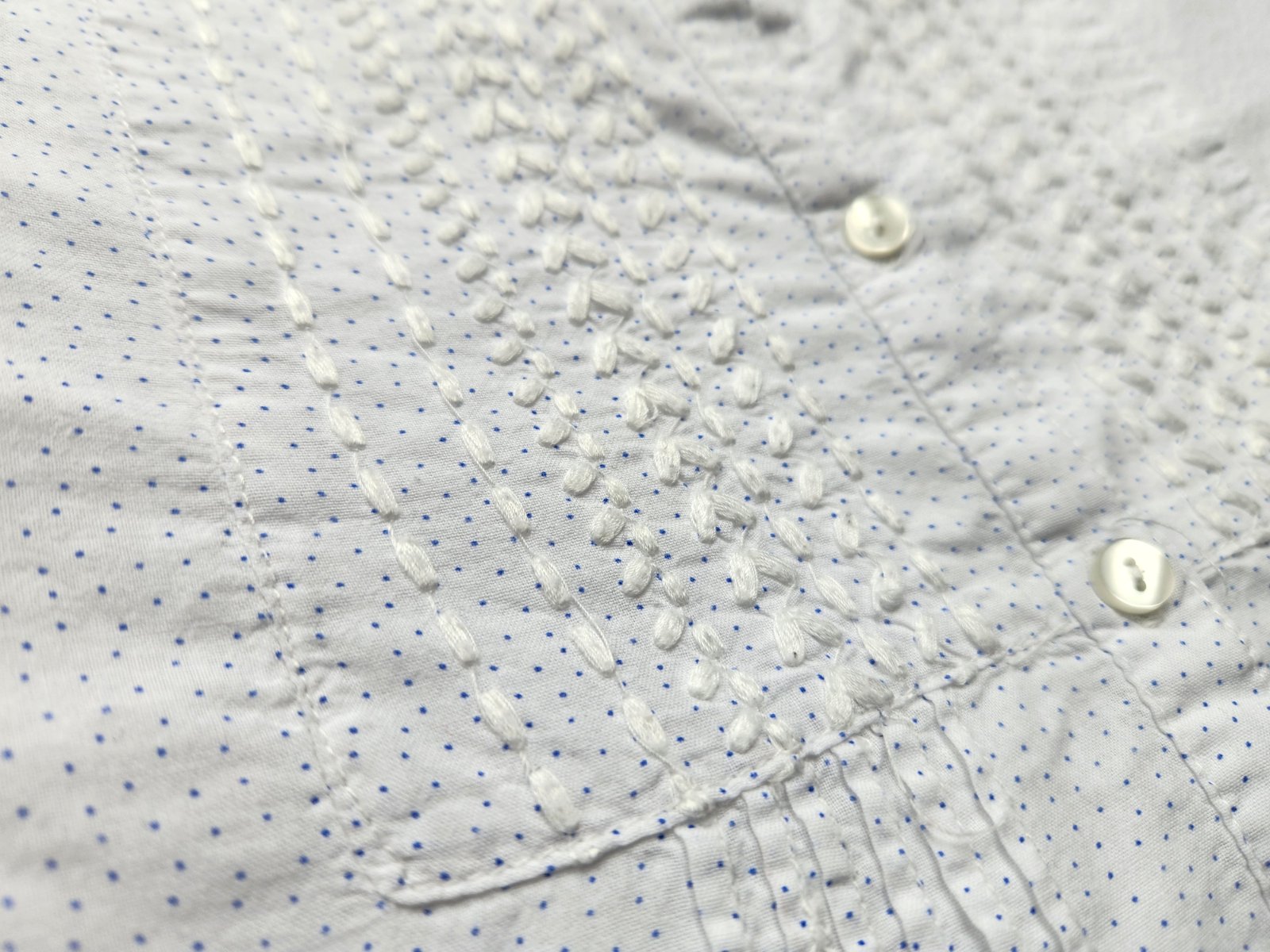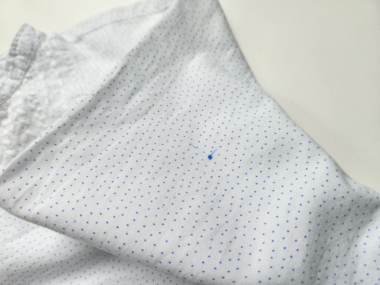 Bílá lehká košile s jemným modrým puntíkovaným vzorem zn. ZARA KIDS, výstřih na knoflíky, vyšívaný přední díl, jemně nabíraný střih, rolovací rukávy s manžetou na knoflík.