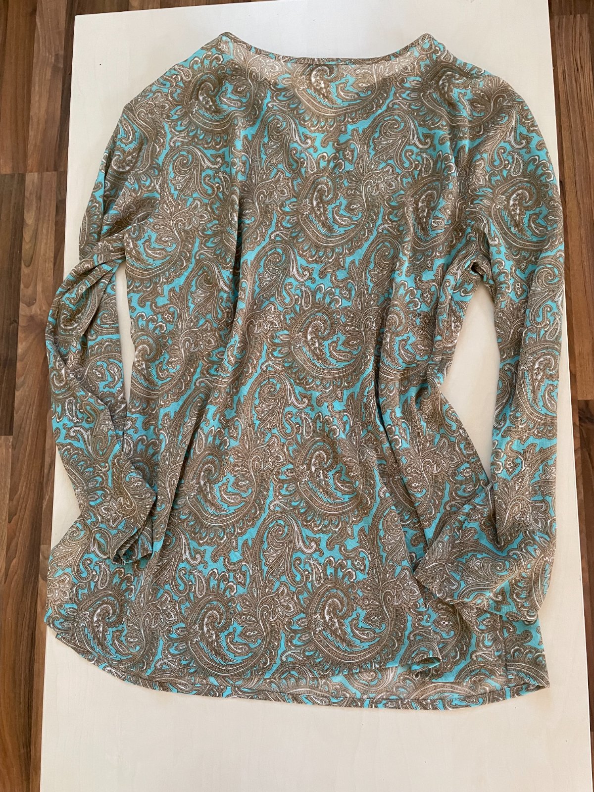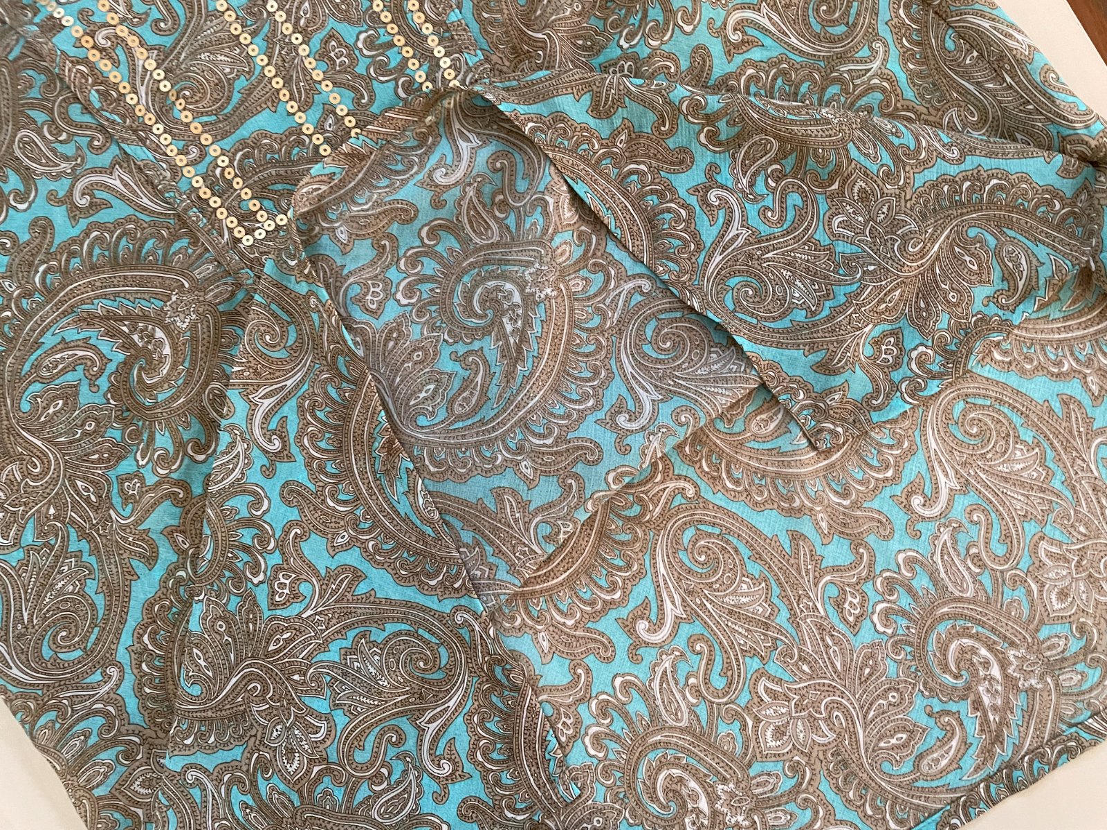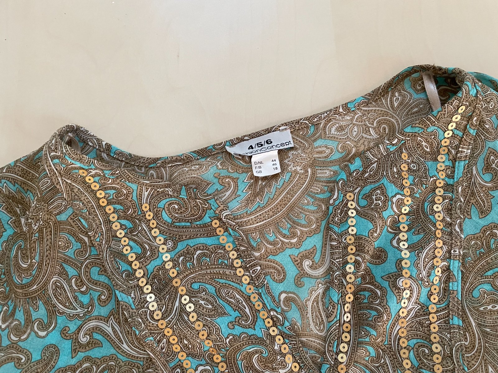 jar. nabízím k prodeji tuto tenkou halenu se vzorkem s flitříky, vel 44 a GB 18 cca XXL, má být volně, Fashion Concept. Umělý, lehce prosvítavý materiál, 100% poyletser. Nošená, bez avd, krásná