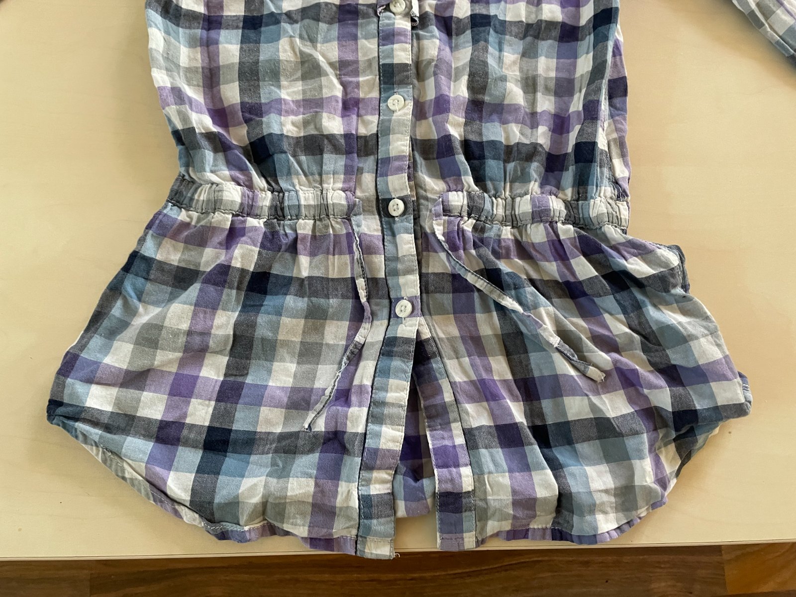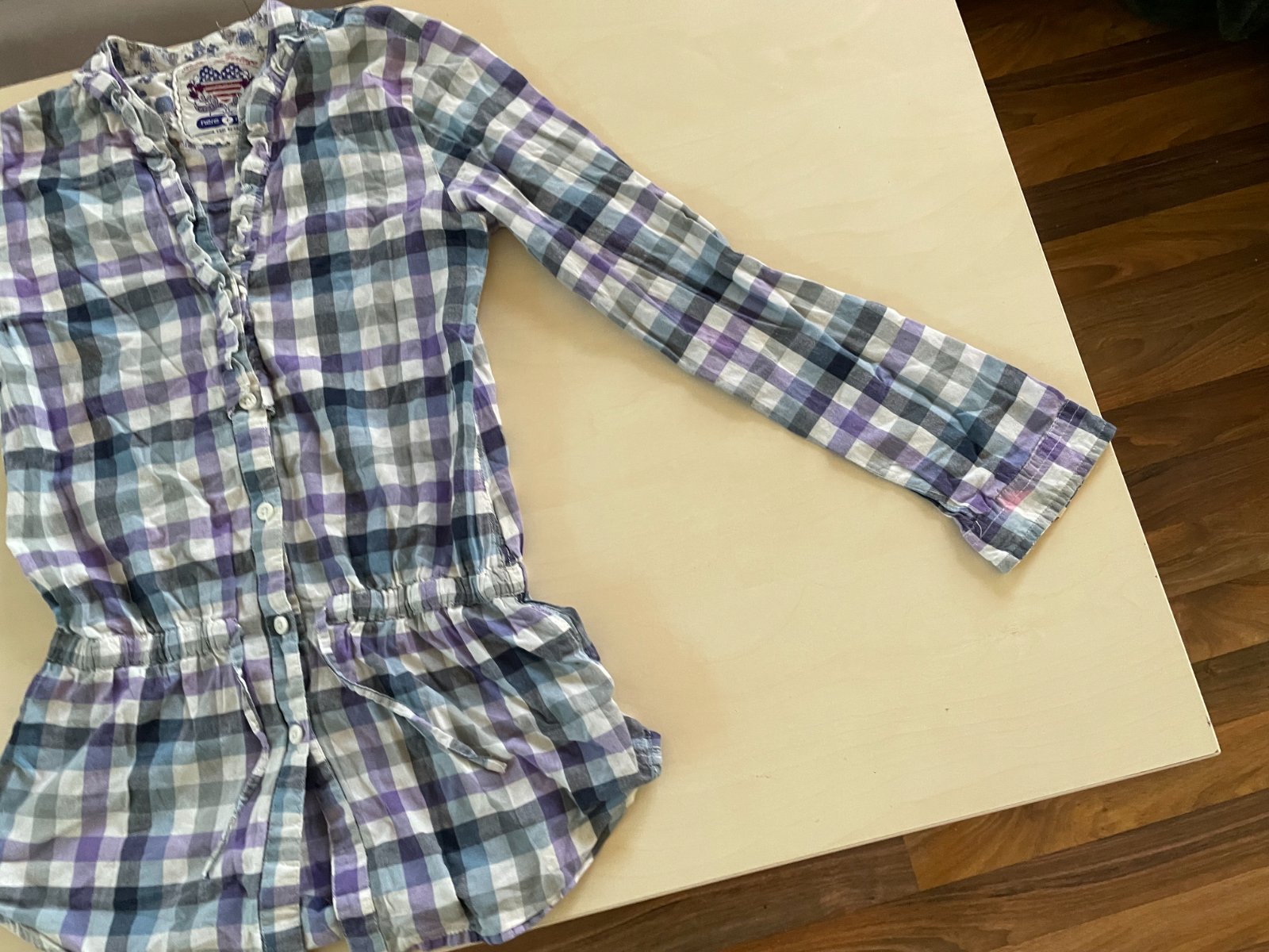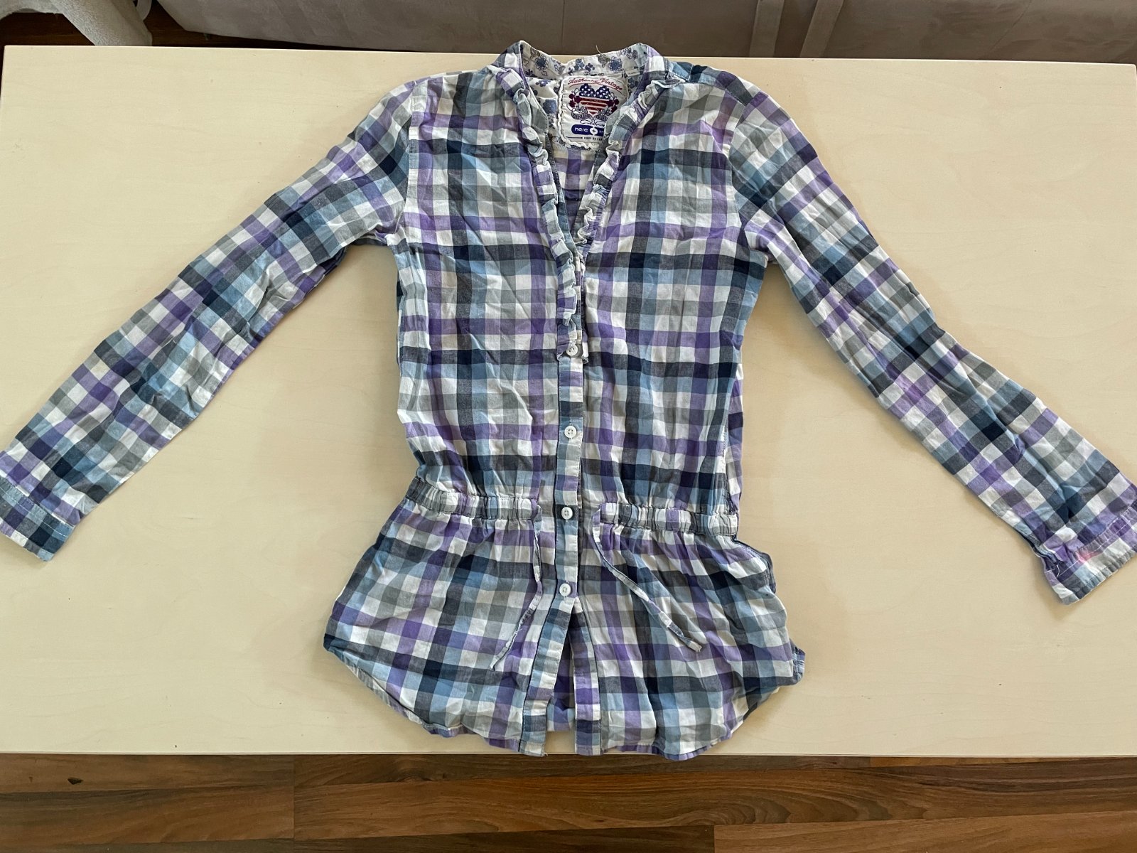 hol. nabízím k prodeji tuto károvanou halenku, vel 146 / 11 let, here + there. Tenké pláténko. 100% bavlna. Vintage styl, výstřih do "V "olemovaný volánkem. dole stažené a s tkanicí. Rukávy s možností zarolování. Nošené, bez vad - jen prací chloupek a na jednom místě jsou drobné žmolíky - viz foto, na nošení neruší, krásné