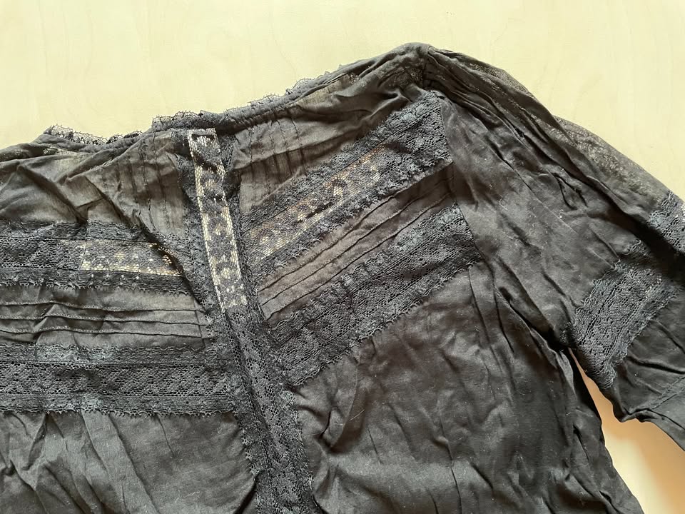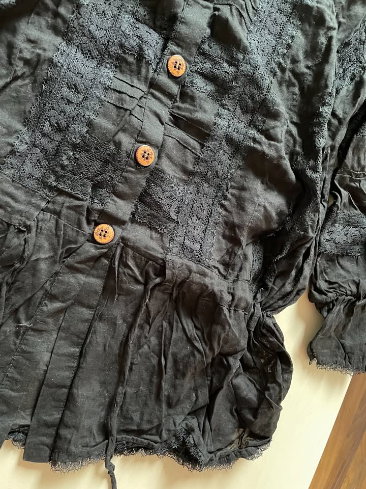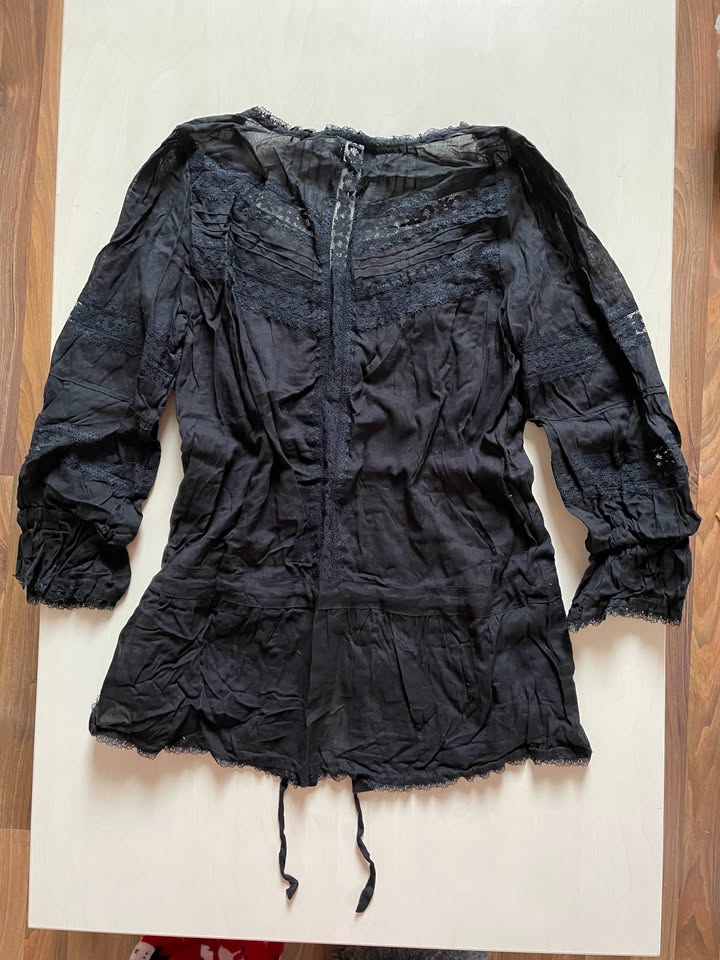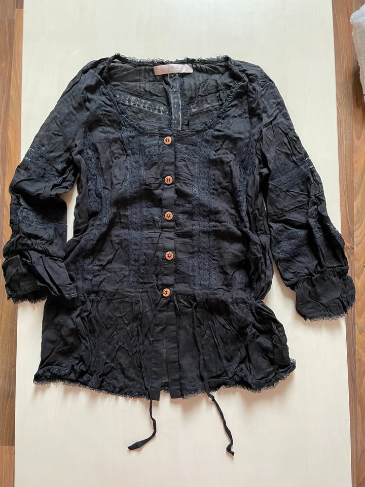 3370. nabízím k prodeji tuto černou halenku s krajkovými pruhy, vel S, Culture. Tenký, lehce prosvítavý materiál doplněný všitou prosvítavou jemnou krajkou. Dole tunýlek s tkanicí. Ozdobné knoflíky jako dřevo s vzorem. Materiál 100% bavlna. Nošen, bez vad, krásné