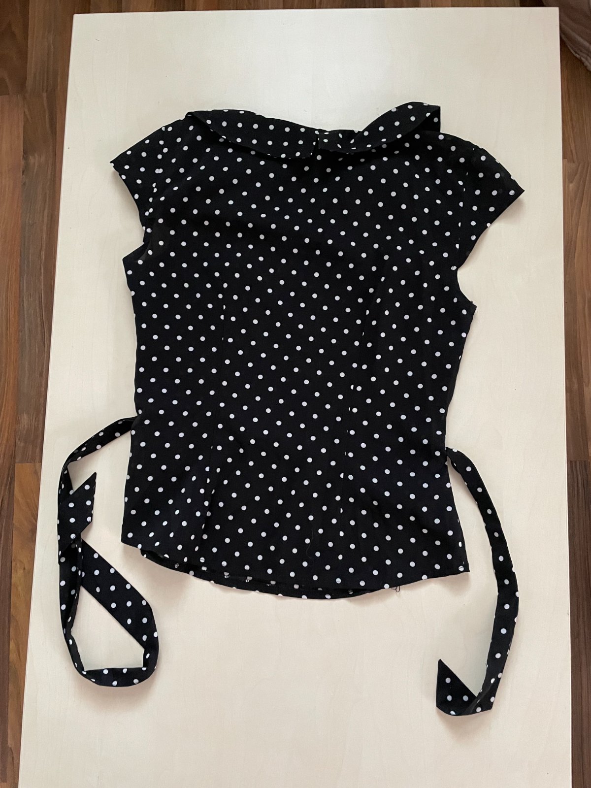 hol. nabízím k prodeji tuto černou halenku s bílými puntíky, vel 34/ tedy XS, HM. Materiál umělý, nepruží. Štítek se složením odstřižen aby neprosvítal, ale asi polyetser - takový jako šifon nebo silon/nylon - ne pláténko nebo viscoza. Postranní zapínání na zip, a v pase k uvázání do stuhy. Nošená, bez vad, krásná