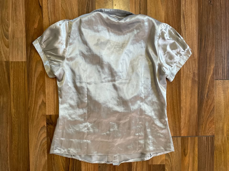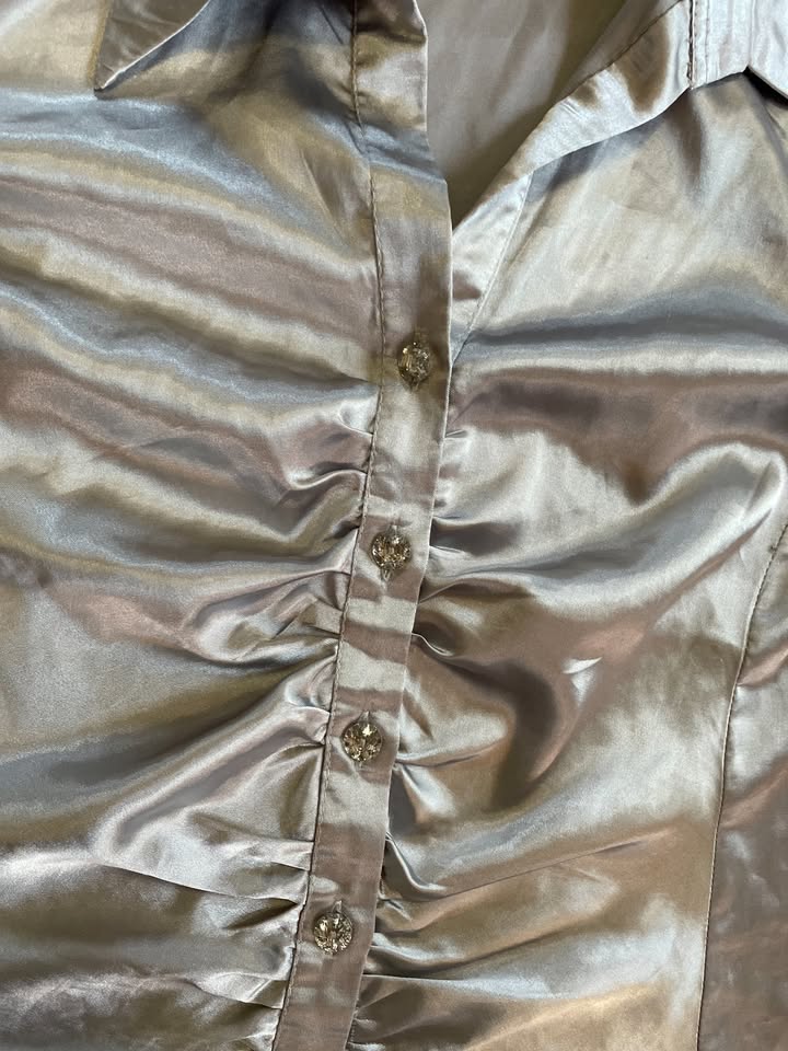 2998. nabízím k prodeji tuto stříbrnou halenku, vel 3/tedy M, Suzi. materiál jako lesklý satén, složení neuvedeno asi polyester. Do středu ke knoflíkům lehce řasená. Nošená, bez vad jen povolené zašití zevnitř u jednoho lemu - jde zapošít nebo neřešit, krásná