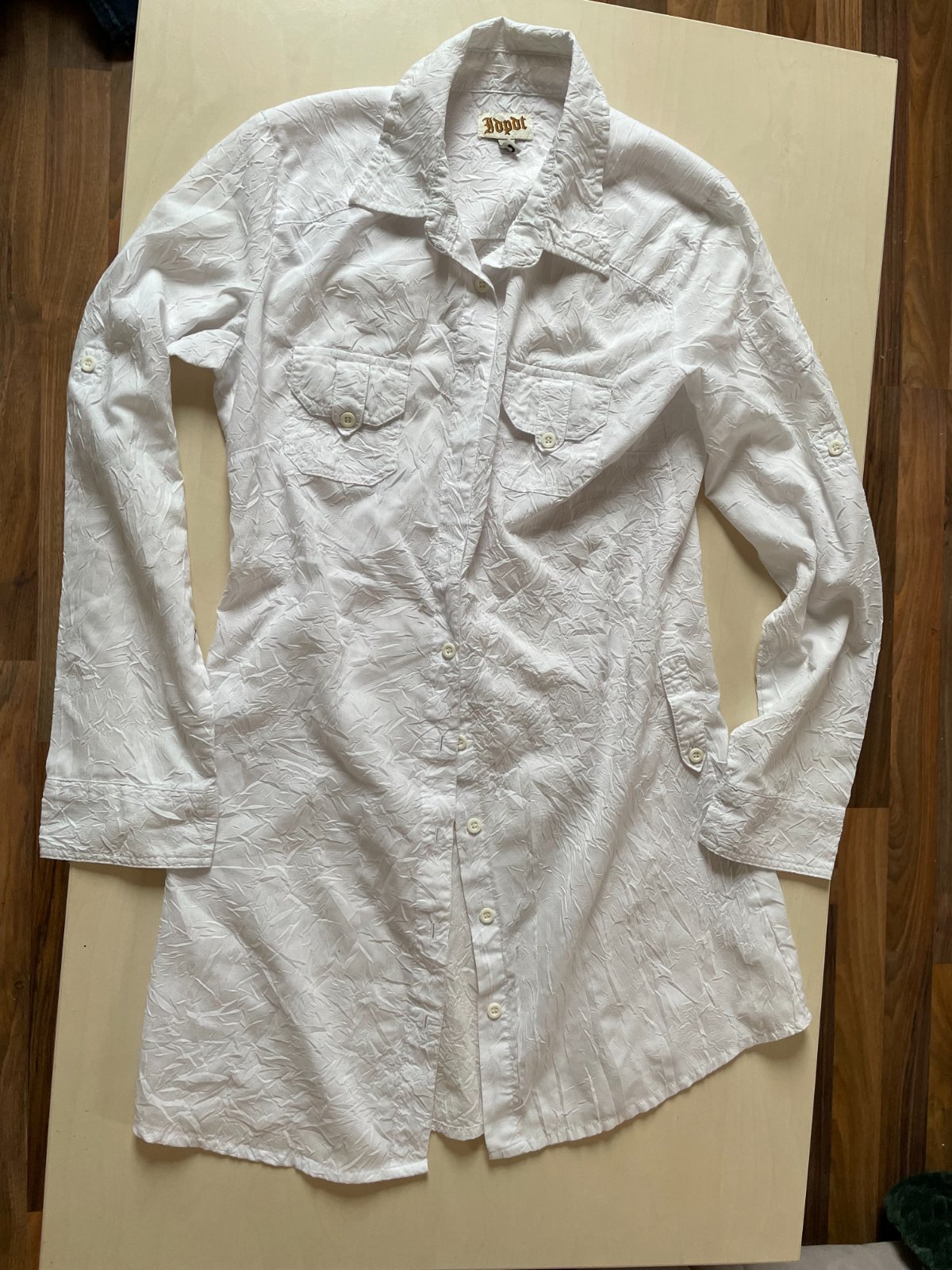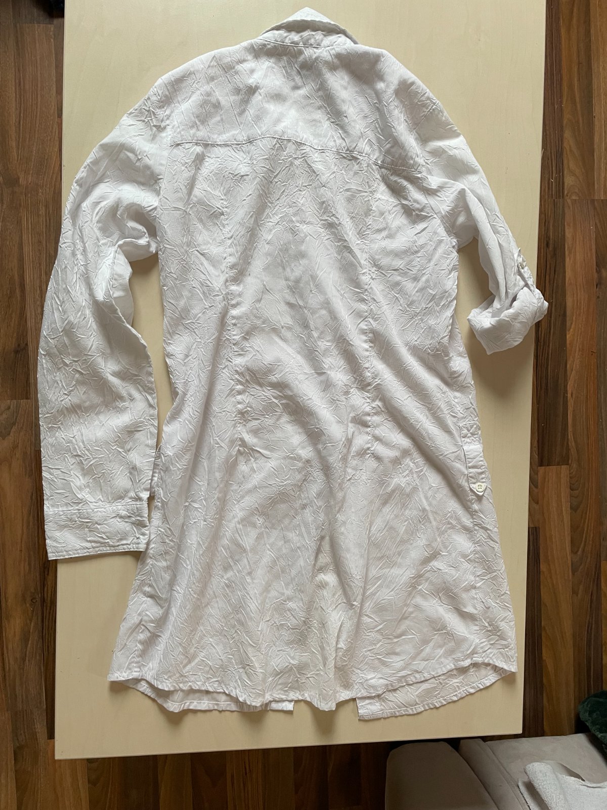 hol. nabízím k prodeji tuto dlouhou bílou halenku / košili, vel S. Rolovací rukávy. Na rukávu malinká kapsička, ozdobná, 2 větší na prsou . Poutka na pásek - není součástí. Materiál tenoučká mačkaná látka -80% polyetesr, 20% bavlna. Nošená, bez vad, krásná