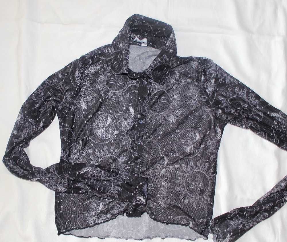 Vyřazeno z přeplněného šatníku naší Viki, vel. XXS. Velmi málo nošená, jako nová, ve velmi dobrém stavu, může být i "společenská", černý podklad s bílými ornamenty slunce, moderně průhledná, krátkýkošilový střih, zapínání na knoflíčky.