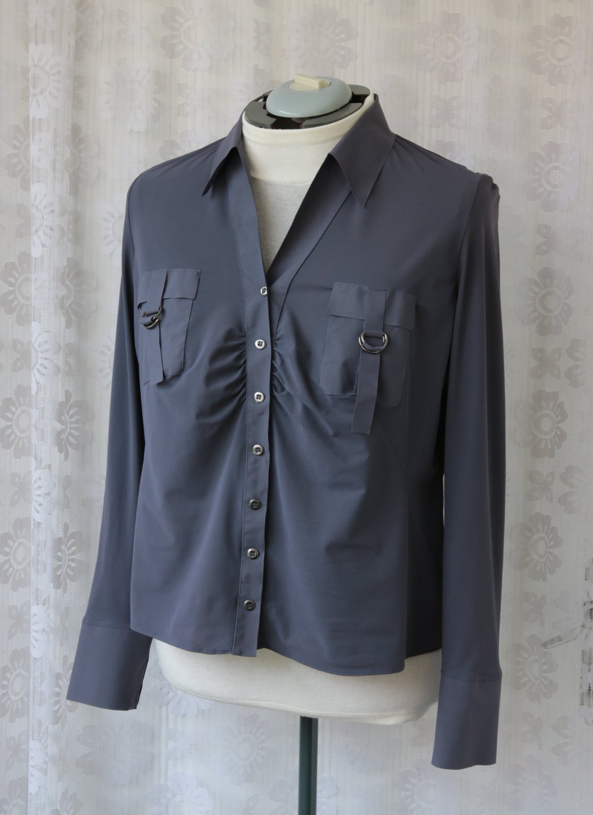 Šedomodrá dámská košile Marks&Spencer, ze zvláštního materiálu, který se elasticitou vyrovná skoro punčocháčům :-) 72% polyamid, 28% elastan-lycra. Pruží v obou směrech, kromě manžet, límce a légy, které jsou naopak podložené tužším jakoby papírovým materiálem aby byly hezky rovné. Zapínaní na malé kovové knoflíčky, dírky na knoflíčky jsou neobšité, pouze vyražené do materiálu - velmi zvláštní. Košile je na figuríně větší - volná, počítá se s tím, že bude upnutá. Velikost 48, rozměry v klidu bez natažení: ramena 44 cm, prsa 116 cm, pas 104 cm, délka košile 60 cm, délka rukávu od ramena 63 cm, z toho manžeta 10 cm. Stav bez jediné chyby. Odeslání poštou, Balíkovnou nebo Zásilkovnou, cenu za odeslání sdělím předem.