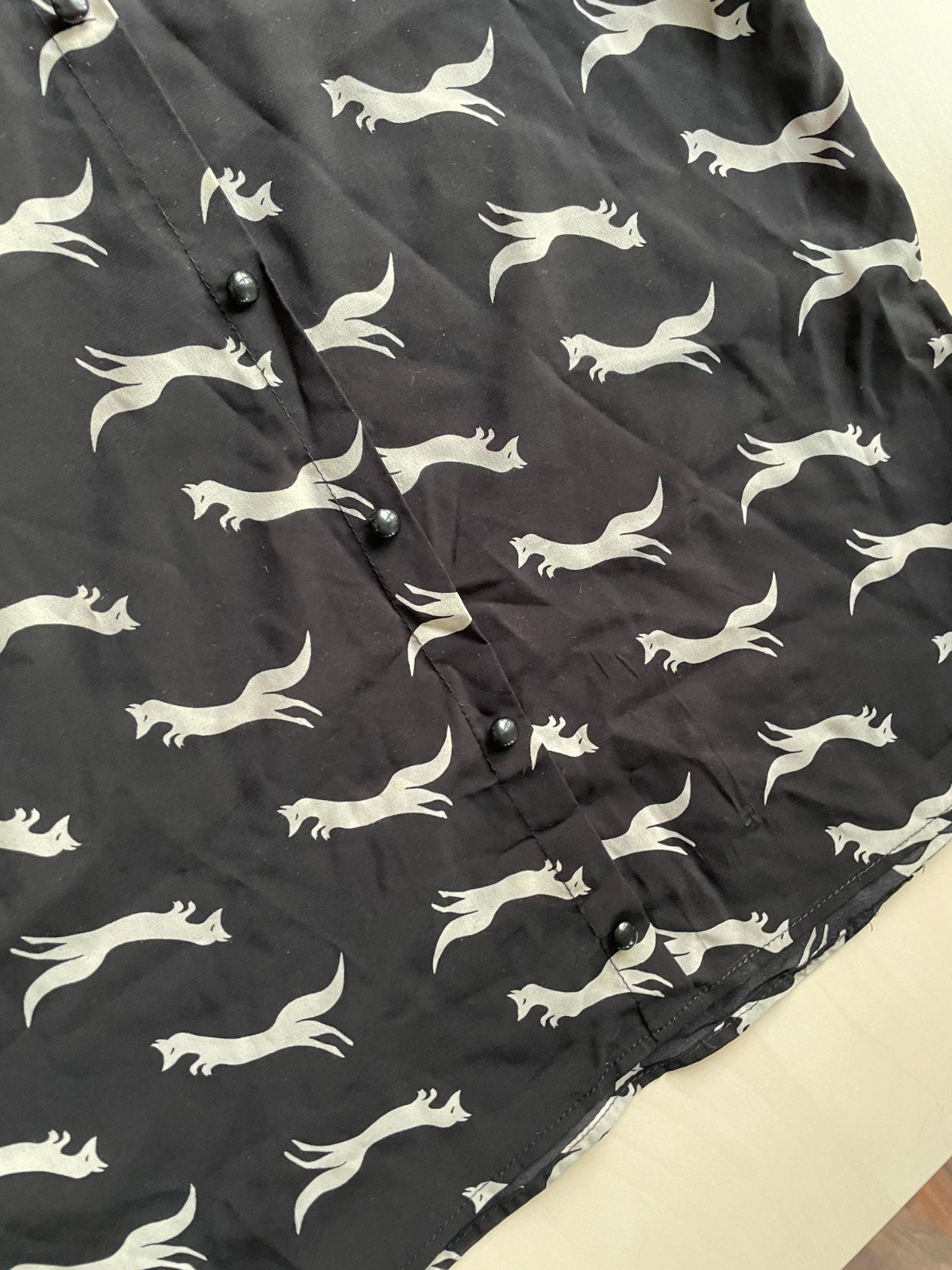 hol. nabízím k prodeji tento top s límečkem a potiskem - asi lišek, vel 36/S, Gate. tenký, jemný podobný jako silonový saten materiál - asi polyester. Přední díl dozdoben falešnými knoflíky. Ty lišky nejsou úplně kontrastní bílá, ale už tak myslím bylo, ten materiál drží barvy. Nošená, bez vad, může být někde malá nitka - nic viditelného - krásná viz fota.
