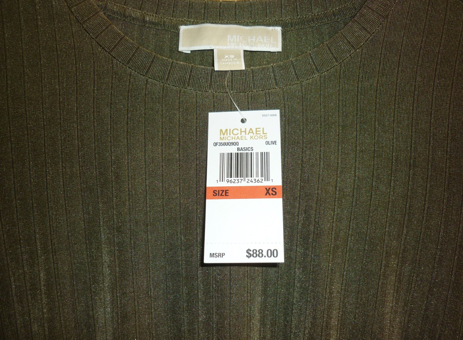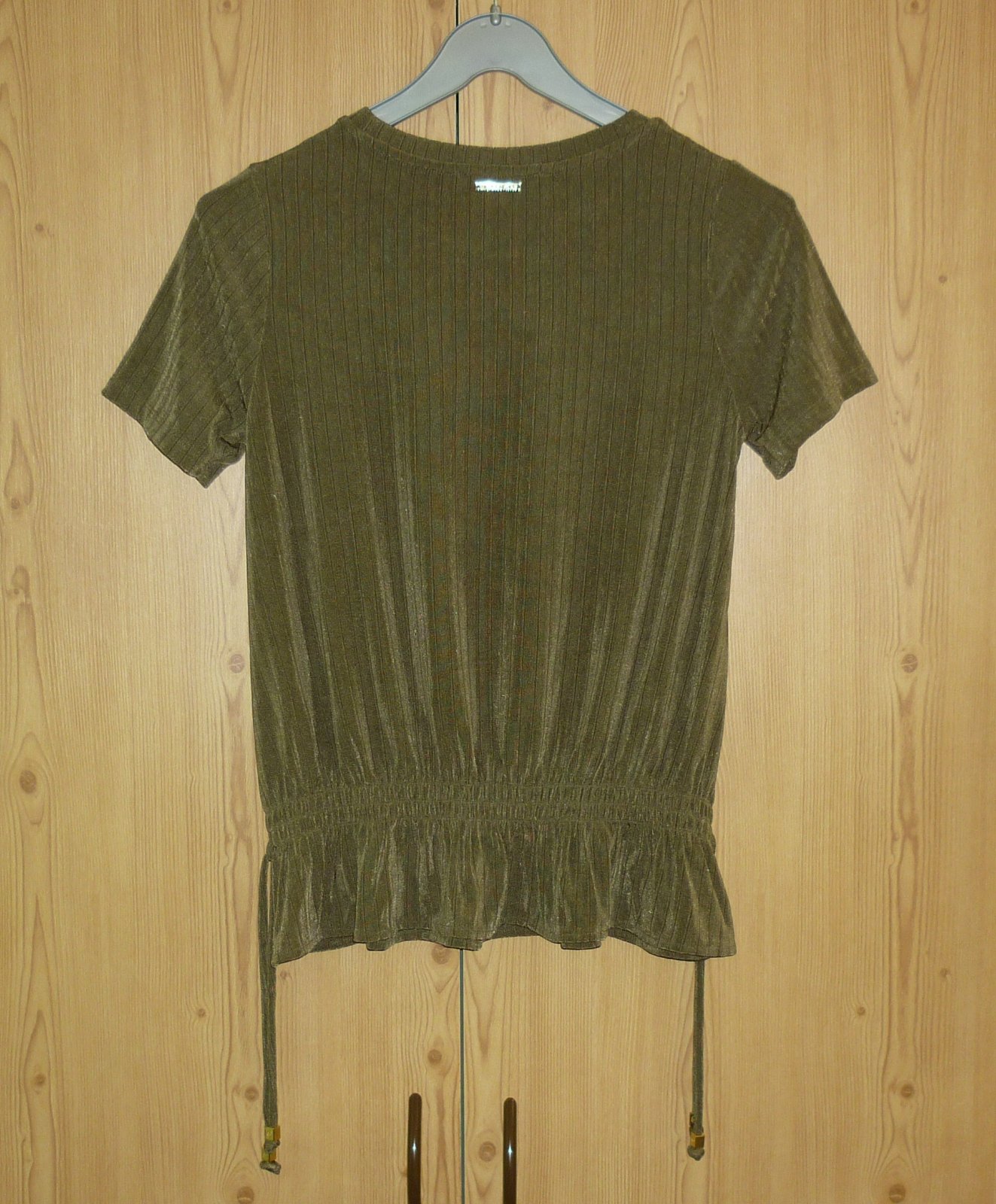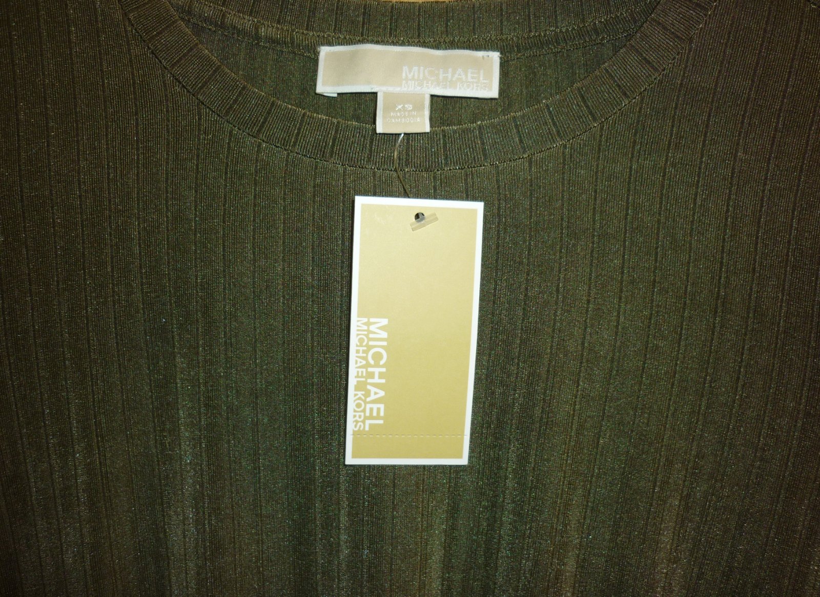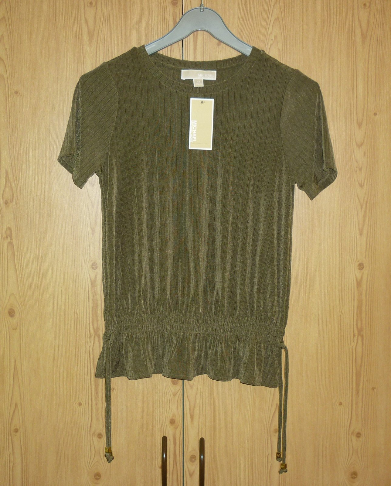 Prodám khaki halenku Michael Kors, novou s visačkou. Krátký rukáv, v pase gumička, na bocích ozdobné zavazování, zlaté kovové detaily (vzadu za krkem kovové logo, na koncích šňůrek ozdobné kovové kostky s logem), lehce žebrovaný vzor. Materiál je vzdušný, velmi pružný a nekrčivý: 93% polyester a 7% elastan. Velikost: XS. Rozměry: šířka v místě podpaží v klidu 43cm x 2, šířka v místě podpaží v natáhnutém stavu 65cm x 2, celková délka 59cm. Cena: 1050,-Kč + poštovné. Koukněte na moje další inzeráty, třeba si něco vyberete a ušetříte na poštovné. Tel.: 728 455 567