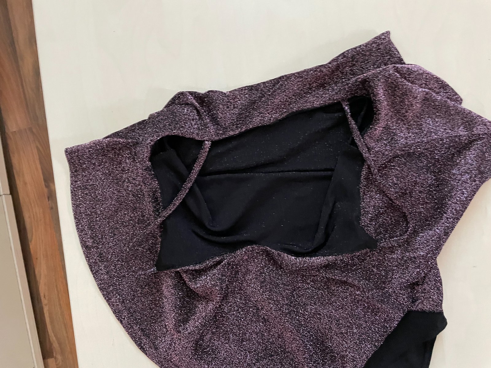 let. nabízím k prodeji toto spolenské body s fialovým vrchem se třpytem a volánem, velikostz není uvedena, ale kopované při XS. Zpomenuté v šatníku, nošené málo, krásné