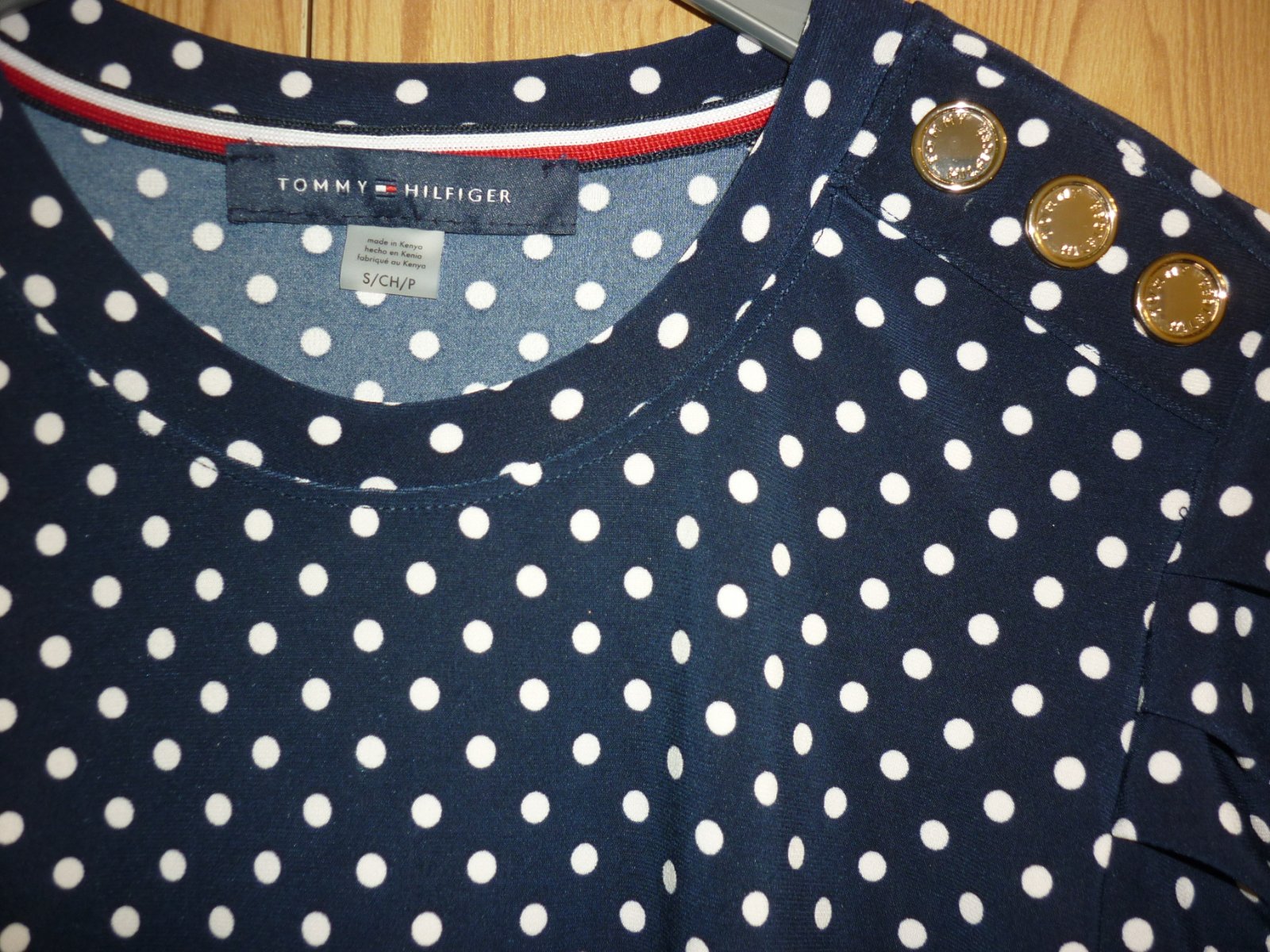 Prodám nádhernou dámskou puntíkovanou halenku Tommy Hilfiger, novou s visačkou. Na tmavě modrém podkladě bílé puntíky. Na jednom rameni falešné zapínání se zlatými knoflíky. Rukávy jsou lehce nabírané, na koncích lem. Vpředu dole našitá kovová vlaječka. Materiál je velmi pružný, vzdušný, nekrčivý: 95% polyester a 5% spandex. Velikost: S. Rozměry: šířka v místě podpaží v klidu 46cm x 2, šířka v místě podpaží v natáhnutém stavu 62cm x 2, celková délka 59cm. Cena: 1099,-Kč + poštovné. Koukněte na moje další inzeráty, třeba si něco vyberete a ušetříte na poštovném. Tel.: 728 455 567