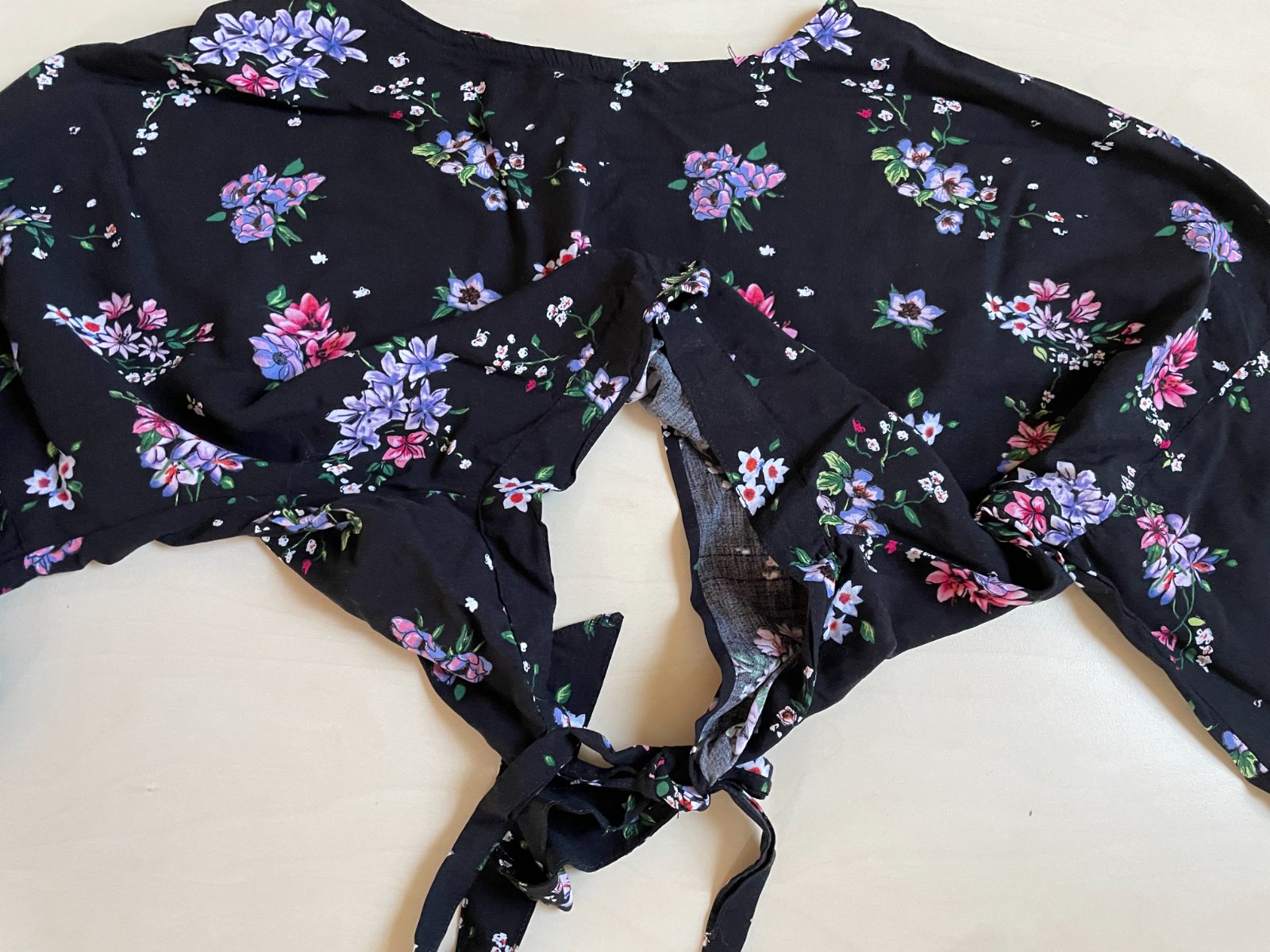 hol. nabízím k prodeji tuto krátkou halenku / crop top s květinovým motivem a do zad prostřiženou a k úvazdu do tkanice. Vel XS, SInasay. Materiál jako plátěné halenky, složení neuvedeno, ale asi to bude viscoza. Nepruží. Nošená, bez vad, krásná