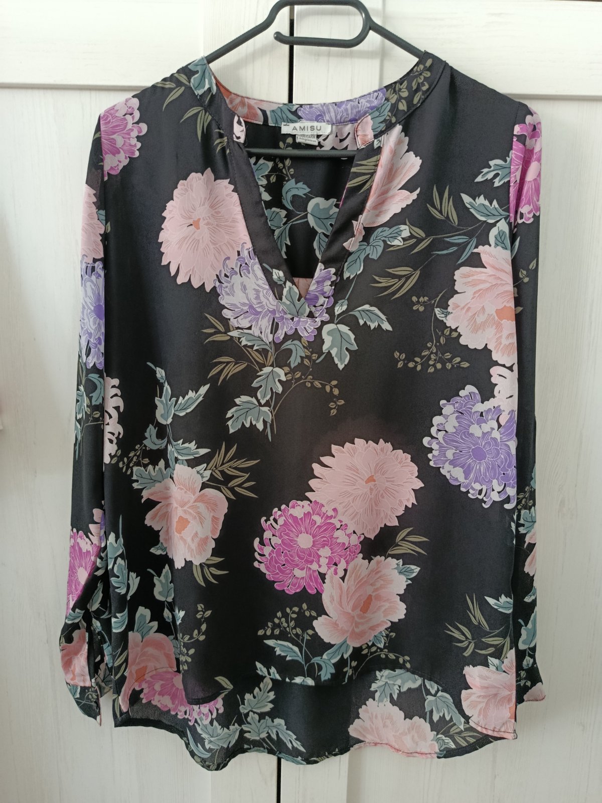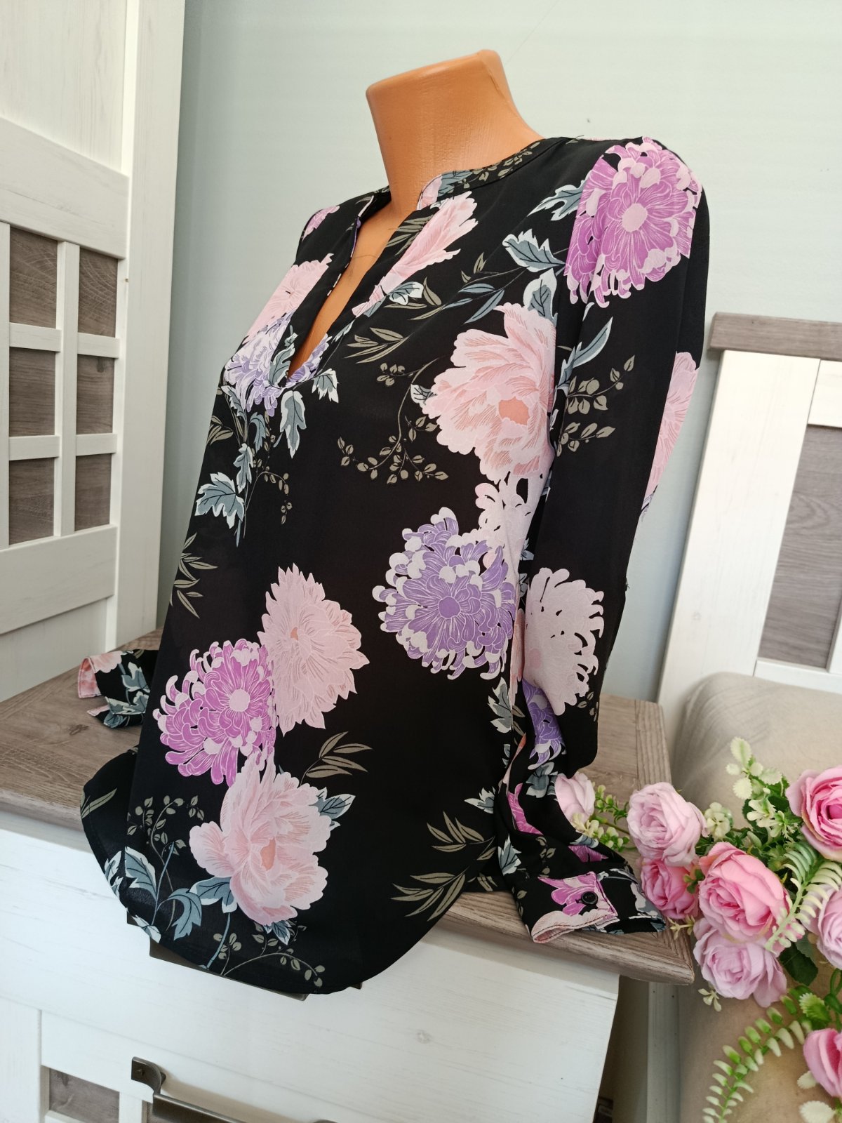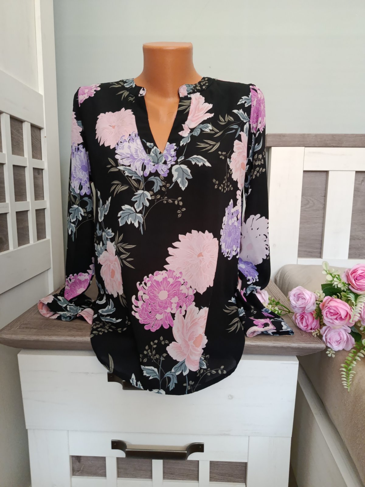 Super lehká květinová košilová halenka....Véčkový výstřih. Rovného střihu. Konce rukávů jsou do manžety, zapínání na knoflíček. Přední strana je o kousek kratší než zadní :-) Je v perfektním stavu. Velikost XS, v pohodě nositelná i při velikosti S. Míry : délka přední díl 68 cm a zadní díl 73 cm, pas 2 x 49 cm, průramky 2 x 49 cm a délka rukávu od krku je 68 cm. Materiál : 100 % polyester. Poštovné - balíkovna za 85 Kč nebo zásilkovnou za 90 Kč.