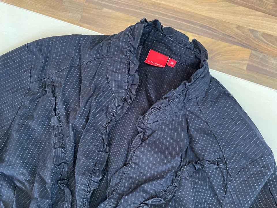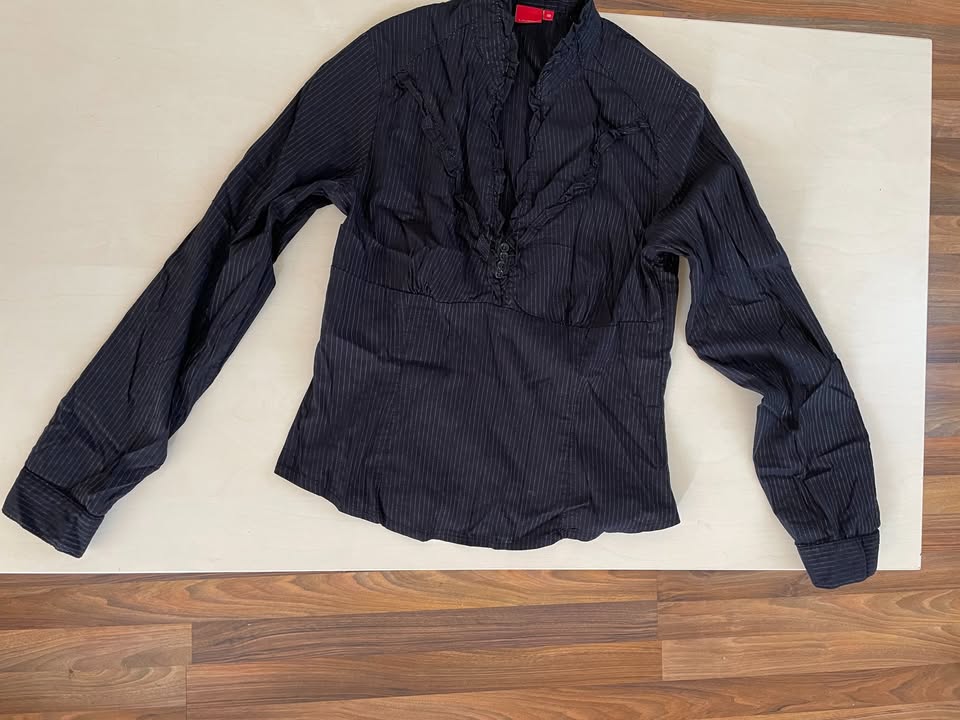 šk1. nabízím k prodeji tuto černou halenku s jemným stříbrným proužkem a výstřihem lemovaným volánkem, vel 38/tedy M, Livre. Materiál jako pružící umělé pláténko, Složení neuvedeno. Nošená, bez vad, krásná