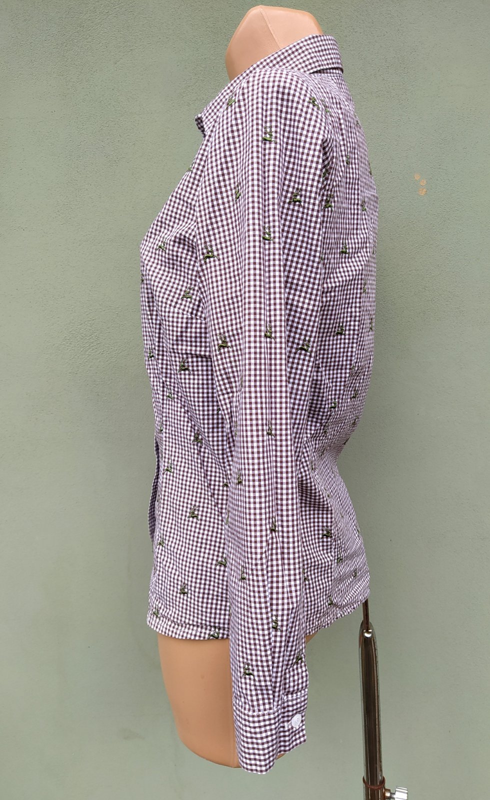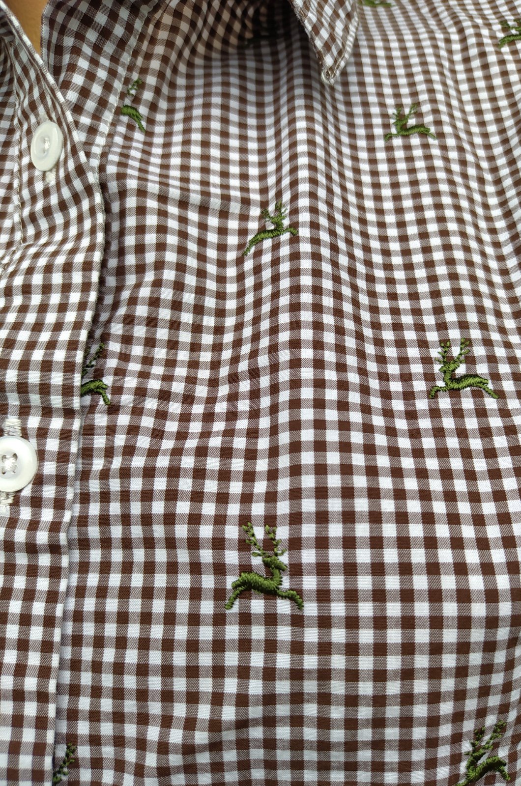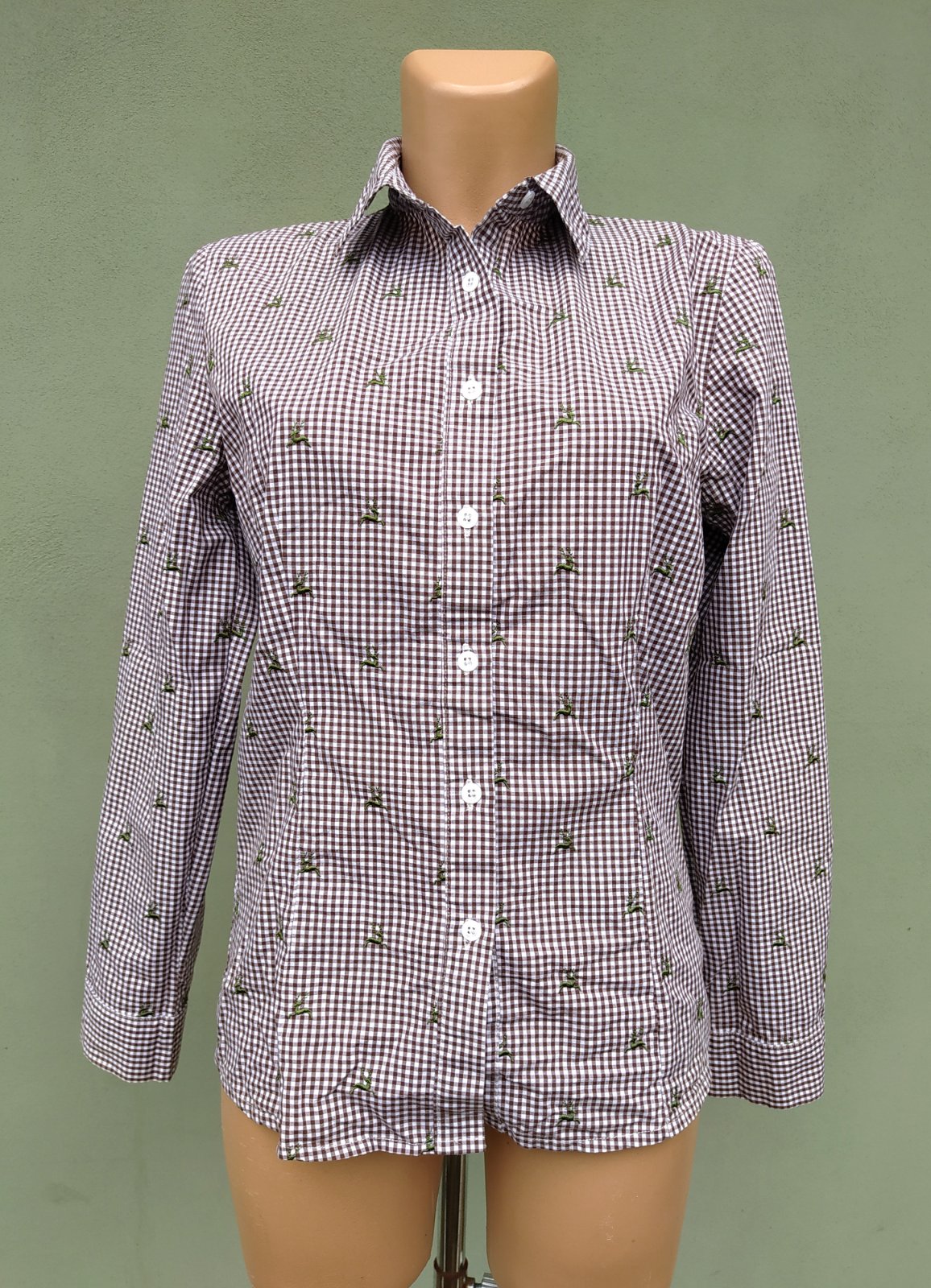 Jako nová. Krásný stav. Bez známek nošení (nenošená). Káro - hnědo/bílé, vyšití jeleni - zelení. košile je vypasovaná, záševky na prsa.