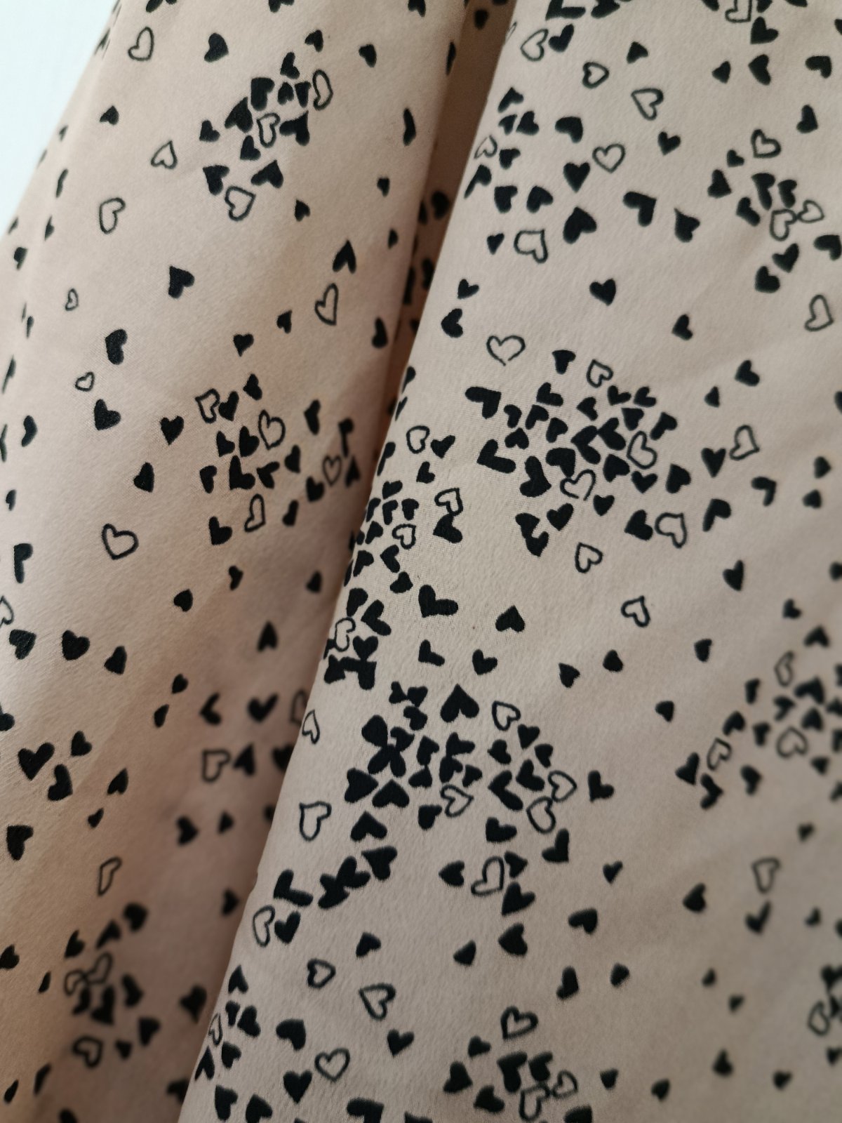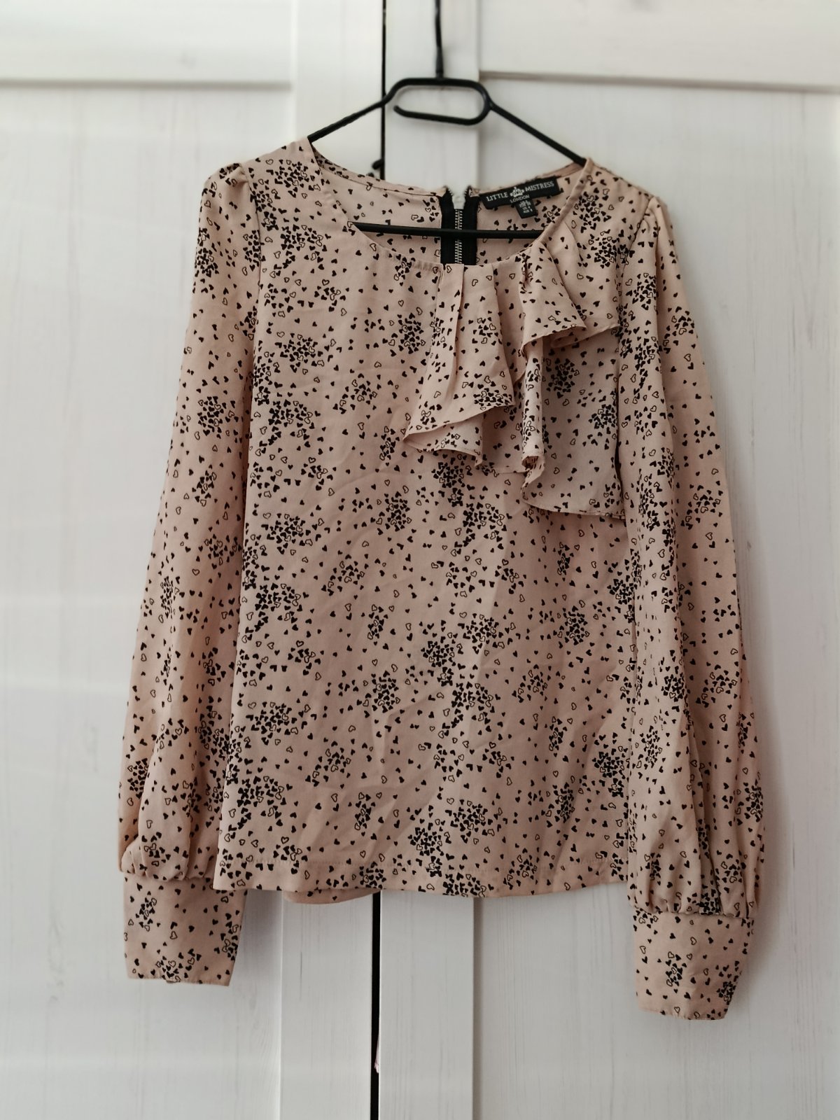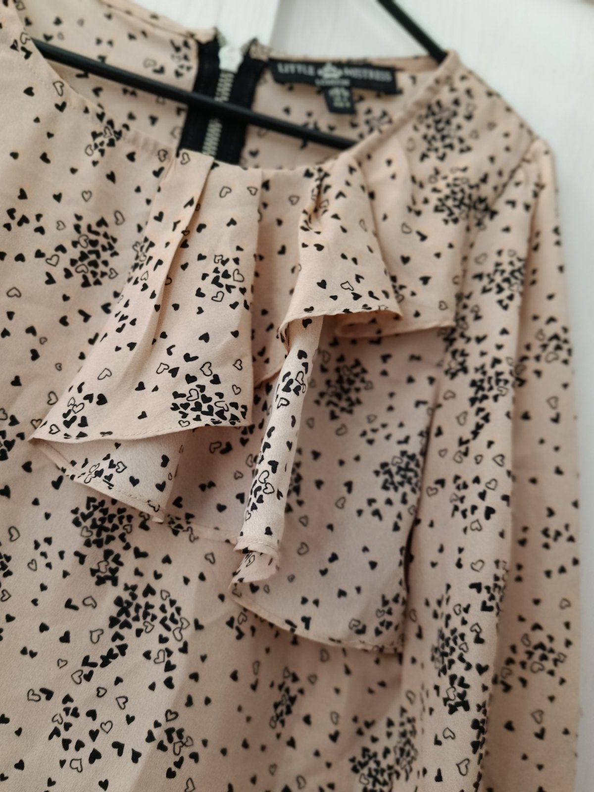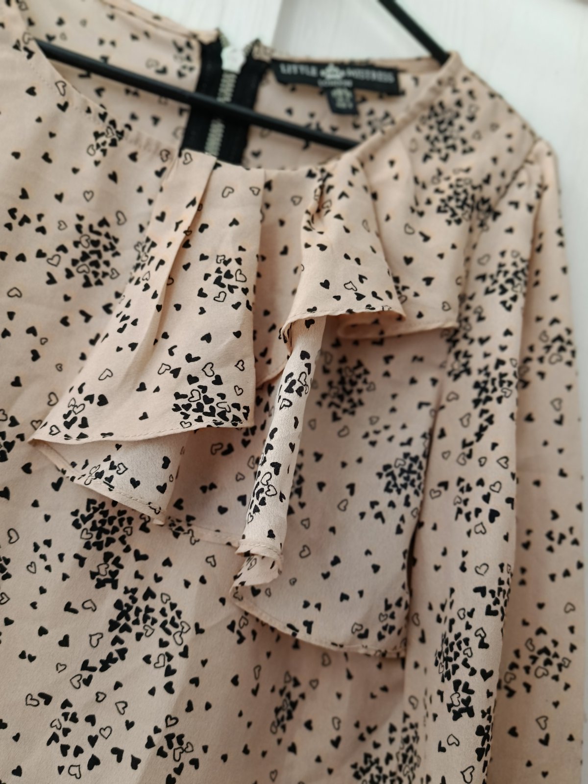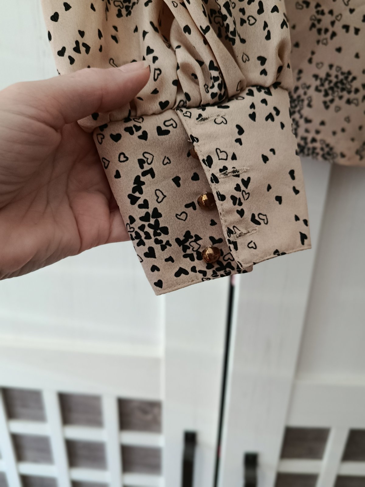 Pěkná halenka s černými srdíčky na béžovém podkladu...Na levé straně pod krkem je volánkové nabírání ...Za krkem na zip...Dlouhé rukávy jsou do manžety se 3 knoflíčky....Halenka je v perfektním stavu...Míry : délka 63 cm, pas 2 x 42 cm, průramky 2 x 45 cm a délka rukávu od krku je 75 cm. Materiál : 100 % polyester....Poštovné - balíkovna za 85 Kč nebo zásilkovnou za 90 Kč.