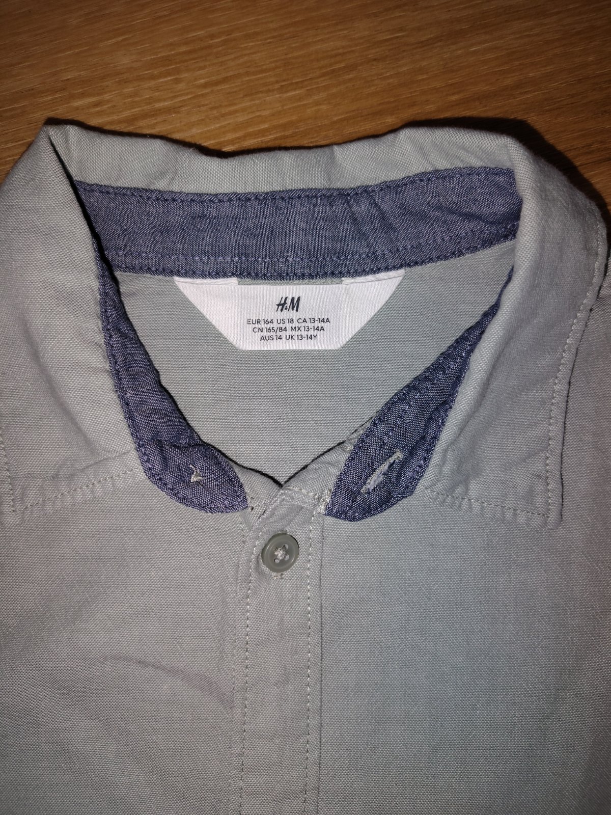 Chlapecká společenská košile H&M 164 (13-14 let) ze 100% bavlny, barva světle zelenkavá s látkou imitující riflovinovou légu uvnitř límečku. Top stav, syn měl pouze do divadla a na koncerty