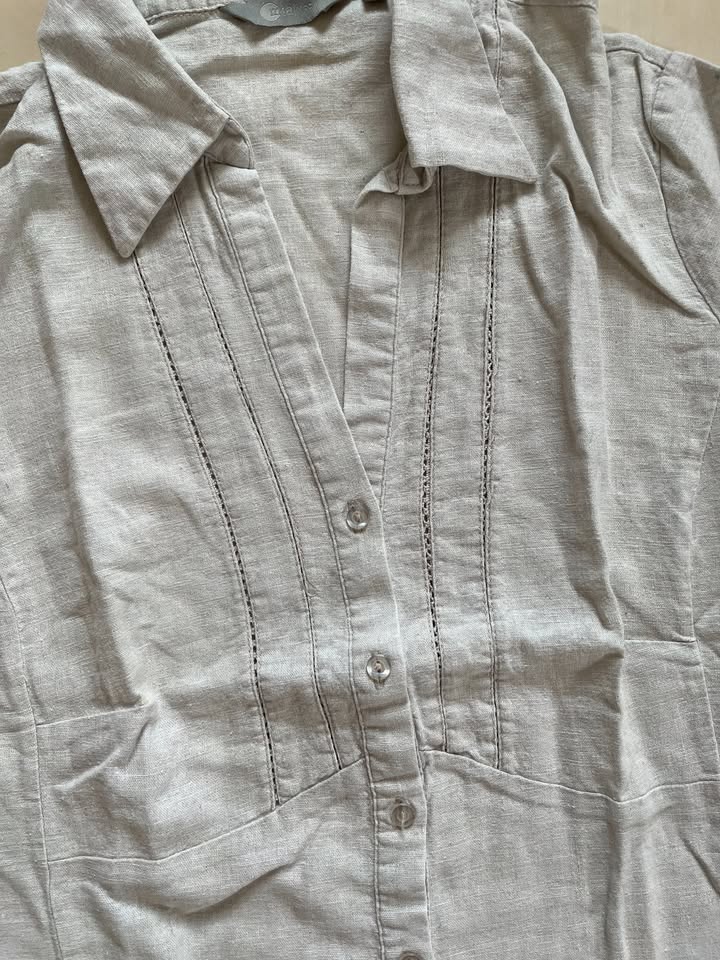 402. nabízím k prodeji tuto halenku s podílem lnu, vel 16 tedy XXL a myslím možno i XL, prosím měřte. Mia moda. Barva není béžová ani bílá, je taková přírodní, spíše studený odstín. Materiál55% len,45% viscoza. Nepruží moc. Na hrudník průstřihy s děrováním - tenké. Nošena, bez vad jen je to len tak má strukturu a občas uzlíky, krásná