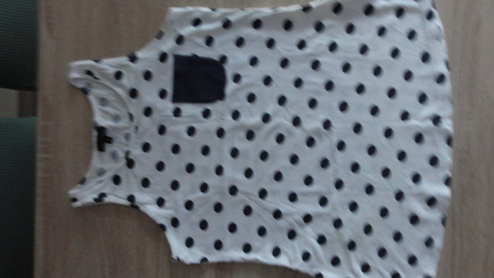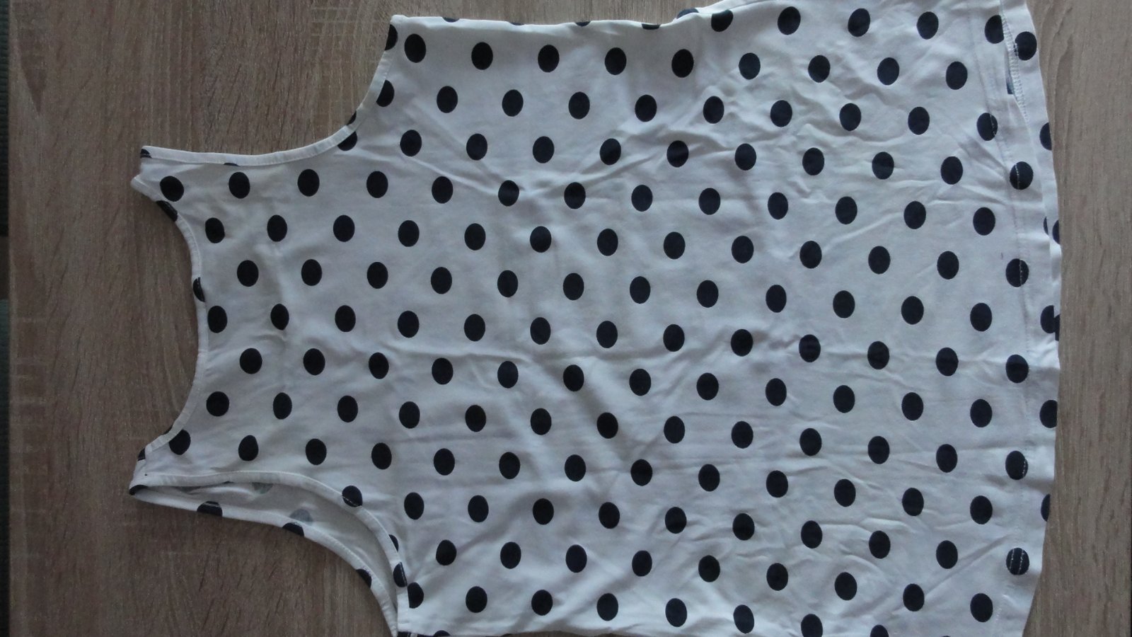 Bílá halenka bez rukávu s černými puntíky. Velikost 146/152, délka halenka 58 cm, 95 % bavlny a 5 % elastan.