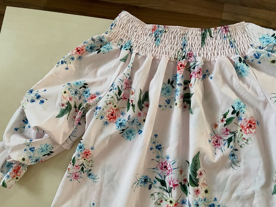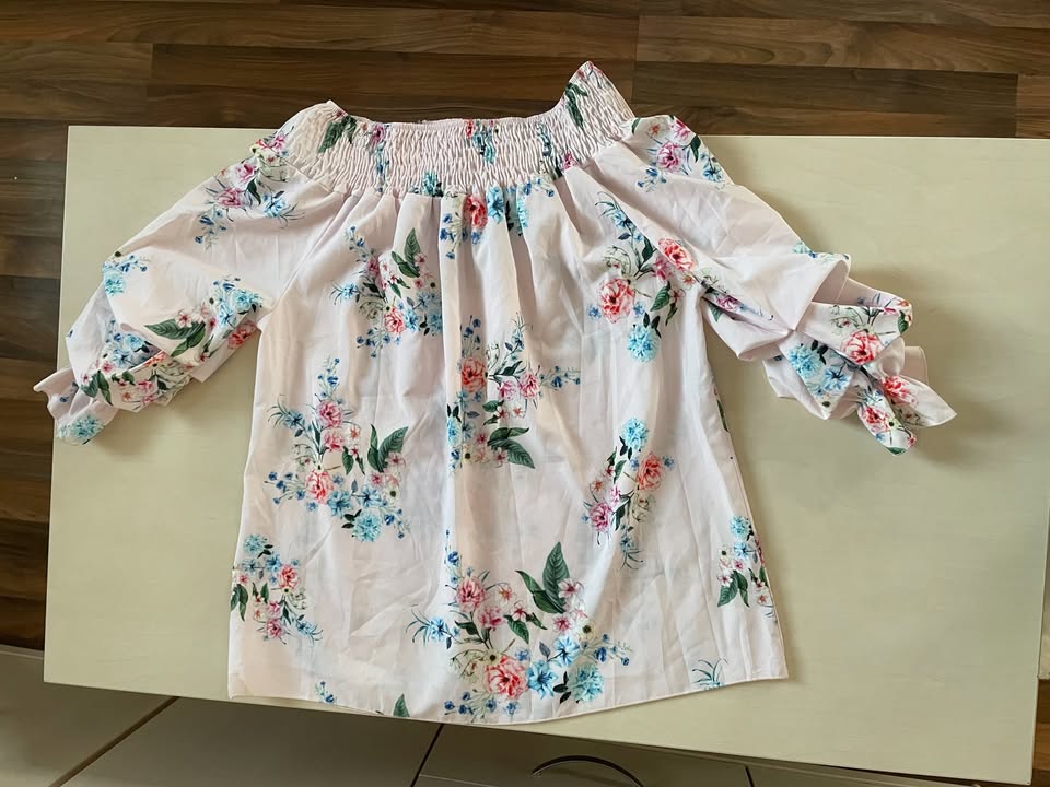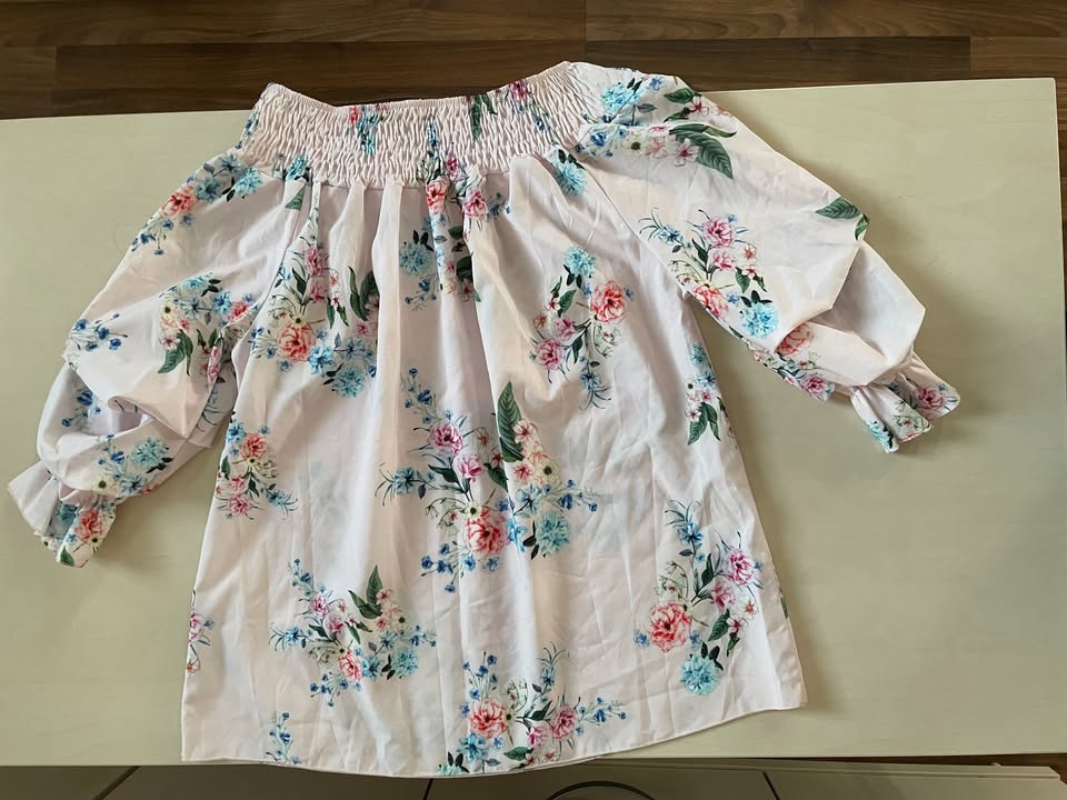 316. nabízím k prodeji tuto tenkou halenku s gumou a možností stáhnout na ramene. Velikost není uvedena, nošena volně při M, ale je celkem univerzální a lze i více - měřte prosím. Materiál umělý, takový silonový, 95% polyester, 5% elasten. Krásně řešené rukávy nabírané prošitím. Základní barva není bílá, ale světle růžová. Nošená, bez vad, krásná
