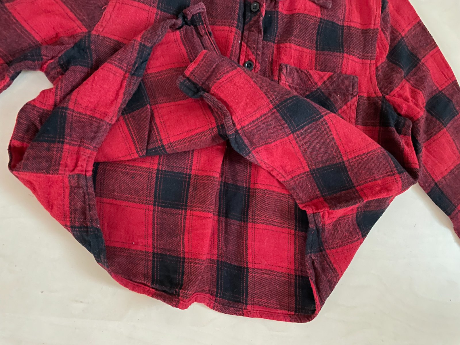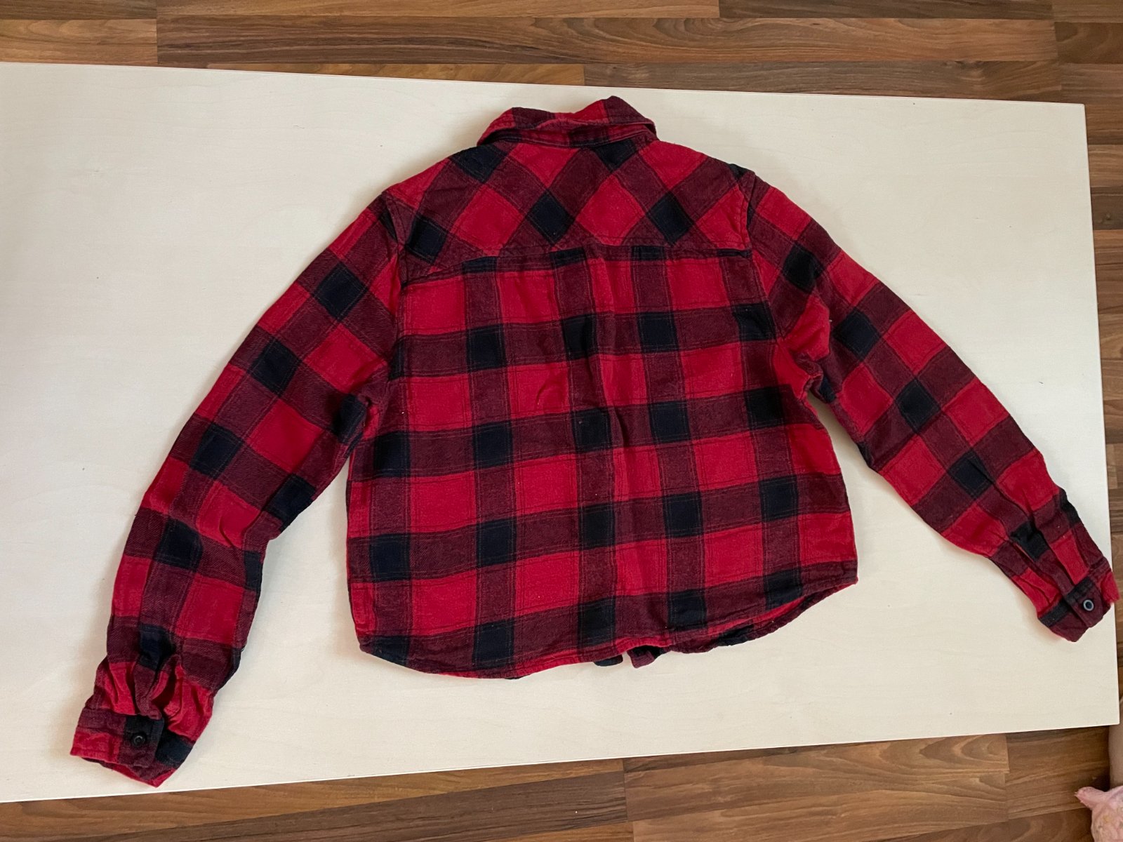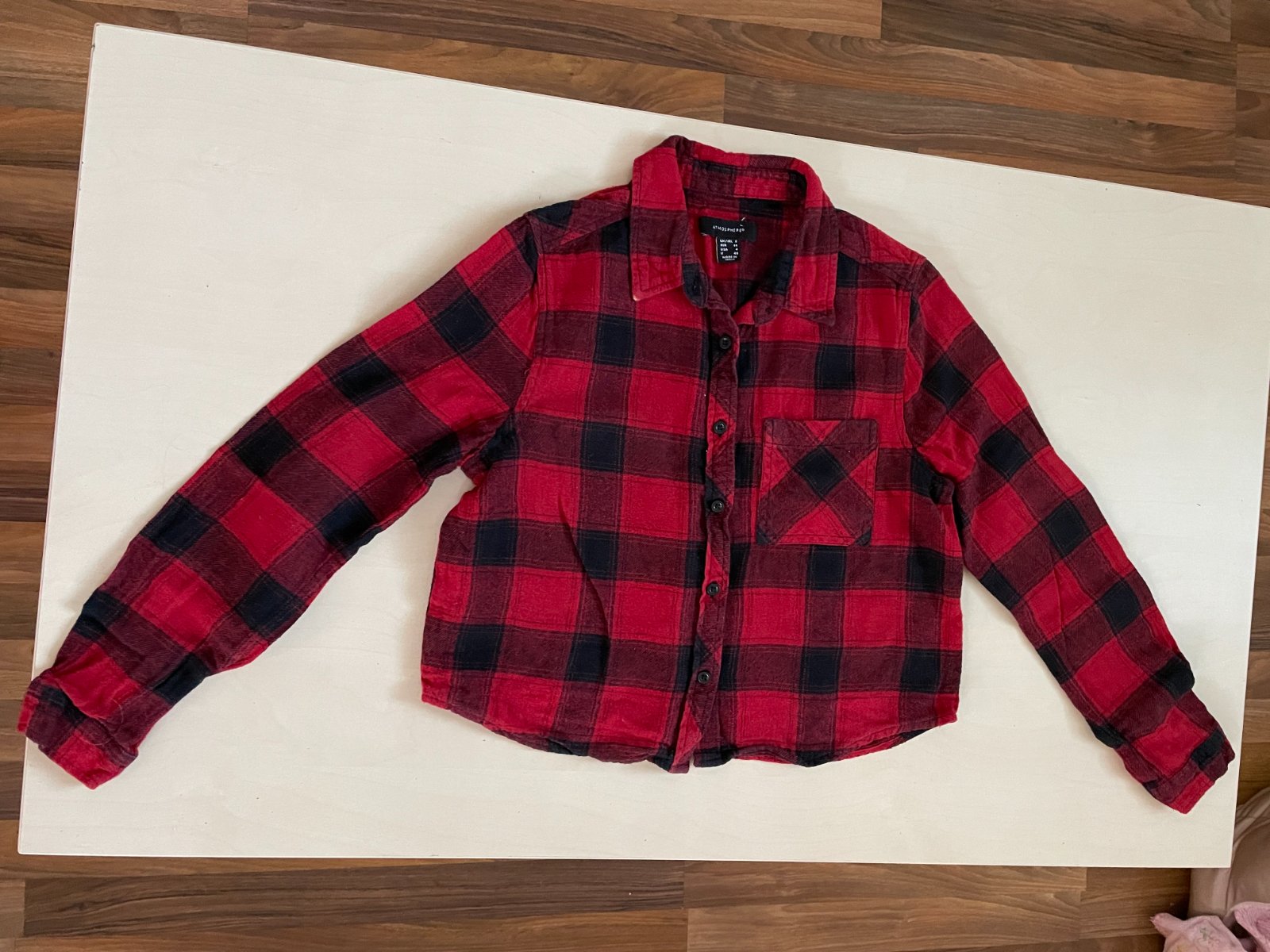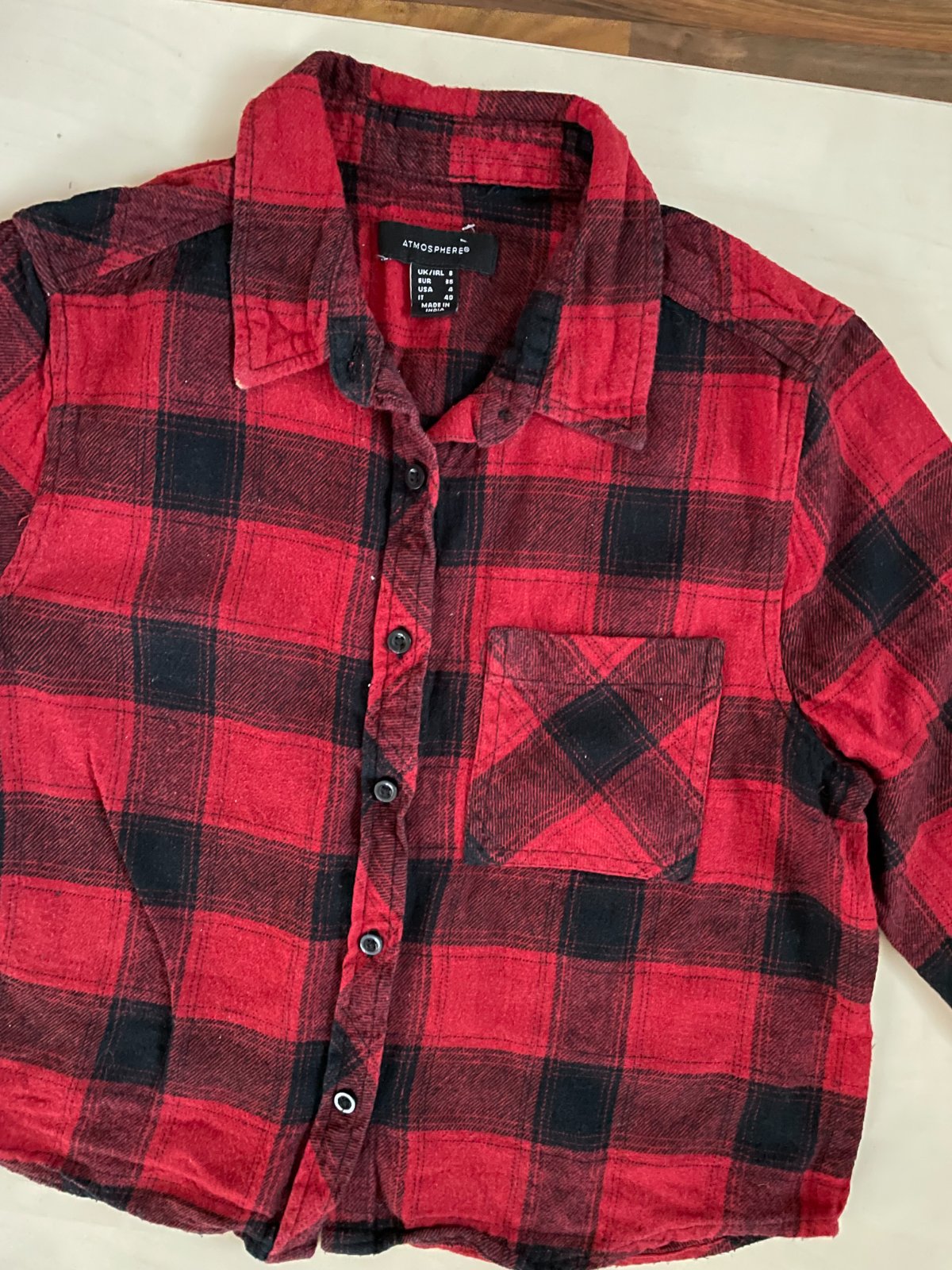 hol. nabízím k prodeji tuto crop košili, vel 8/36/tedy S, Atmosphere. Materiál jako flanel, měklý s chloupkem, ale takový ten šisovaný vzhled. 100% bavlna. Nošená, až na prací chloupek, ale ten patří i k tomu materiálu,na hraně límece lehce opraná barva, nic hrozného, bez vad, krásné