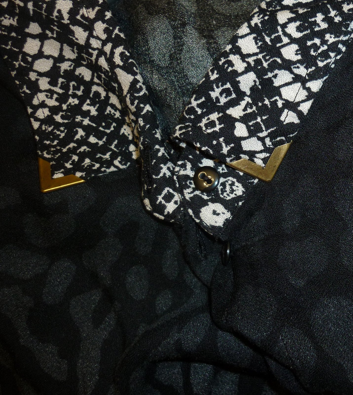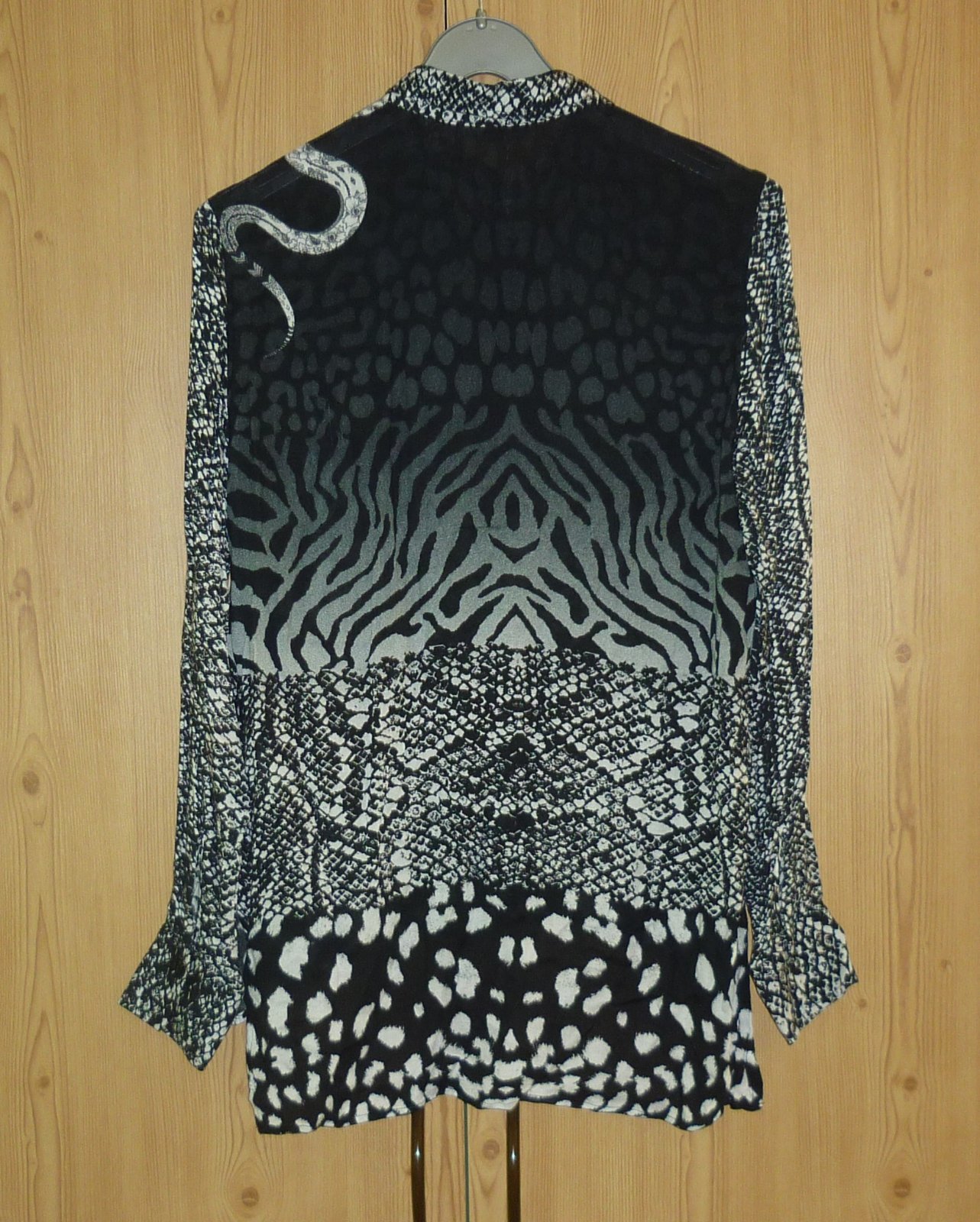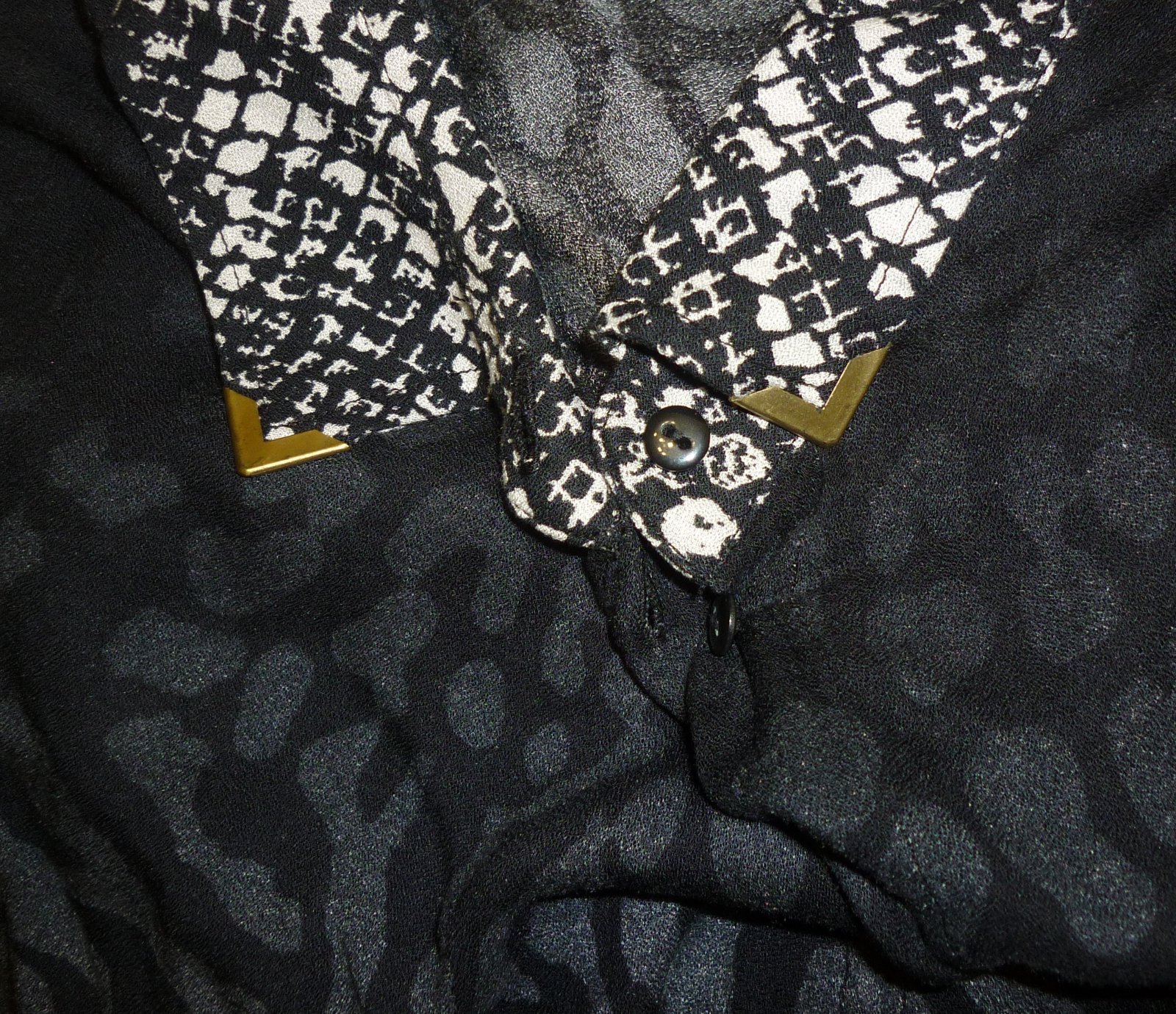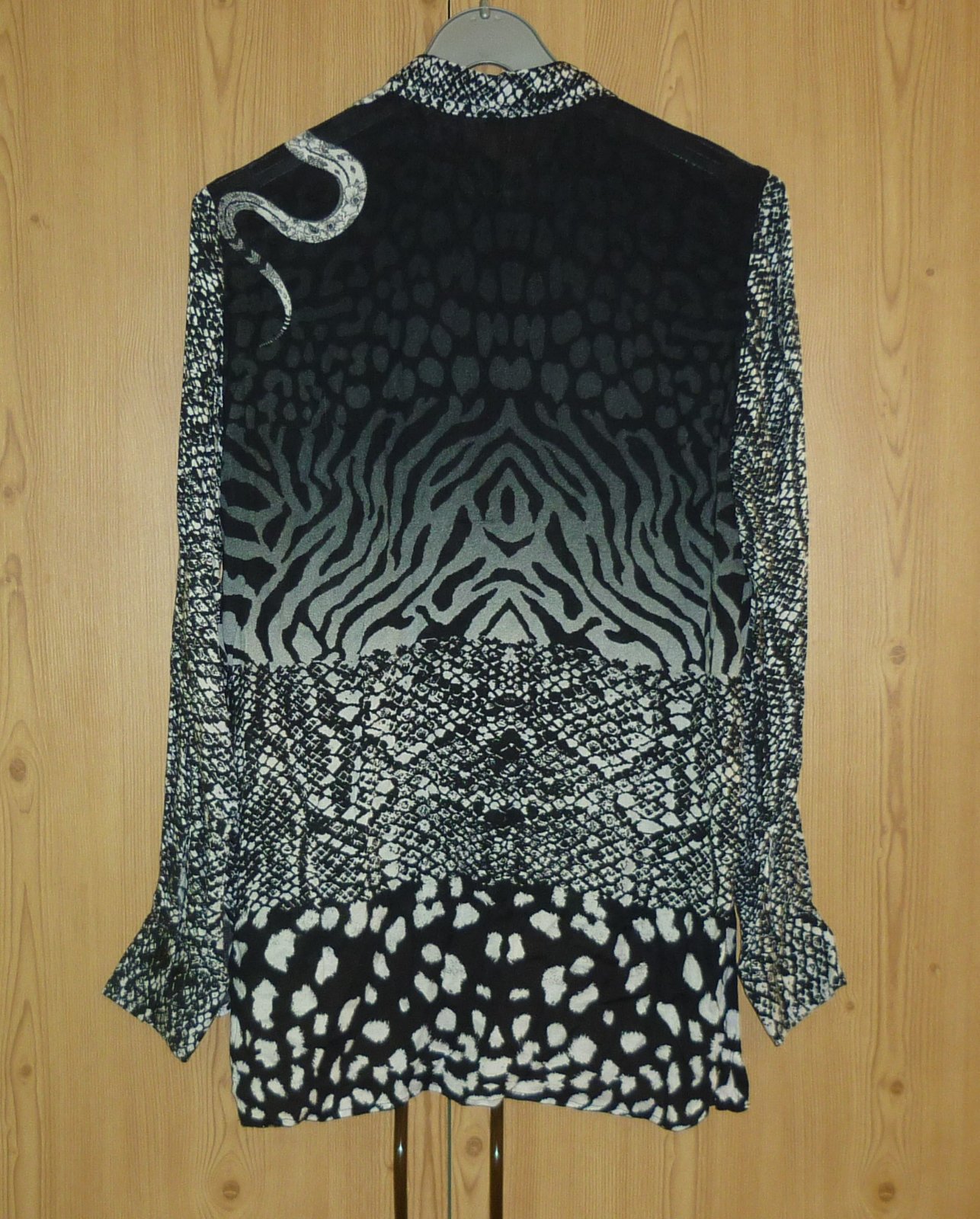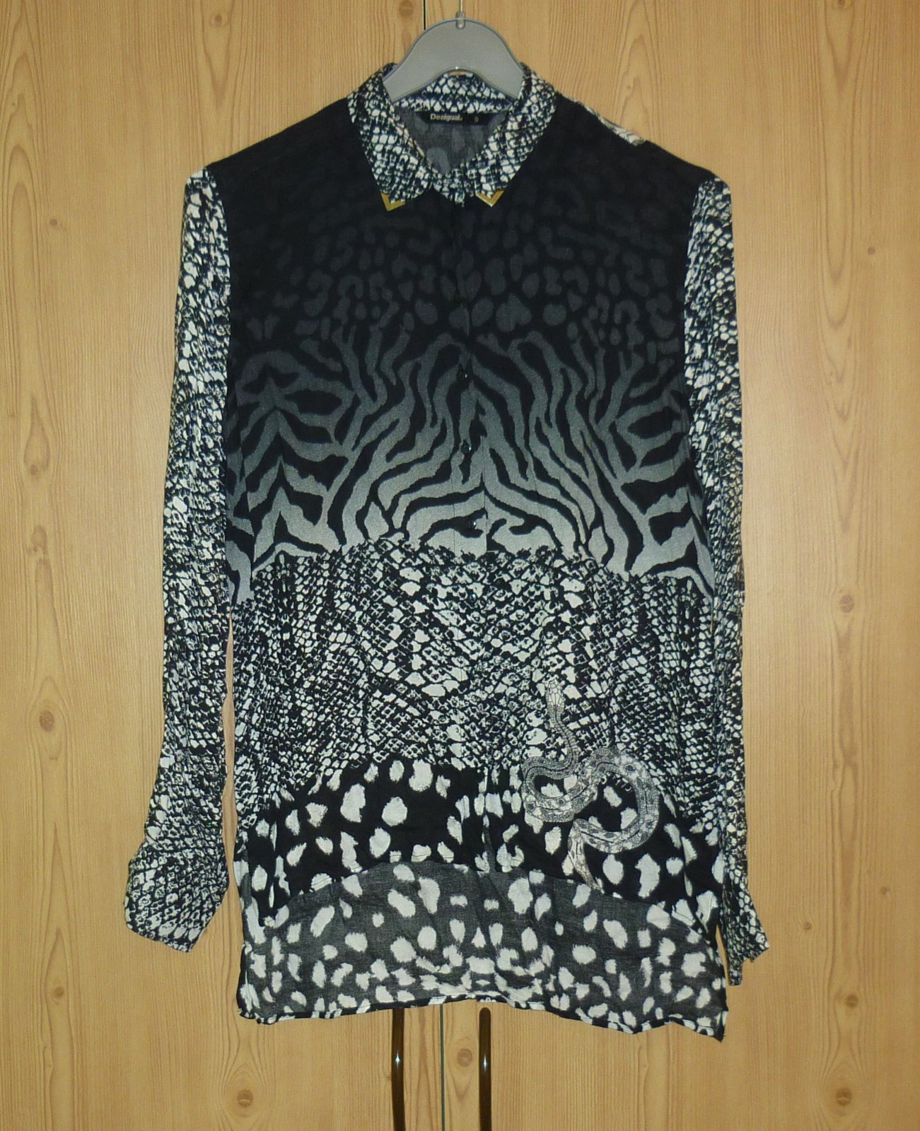 Prodám parádní dámskou černobílou delší košili Desigual, 1x na sobě, ve velmi dobrém stavu. Límeček (v obou rozích zlaté kovové lemování), celopropínací, dlouhý rukáv (dole se zapnutím na knoflík), přední díl je kratší než zadní díl, dole po bocích od spodu rozparky o délce 10cm. Materiál velmi příjemný a vzdušný: 100% viskóza. Velikost: S. Rozměry: šířka v místě podpaží 50cm x 2, délka rukávu od ramene 61cm, celková délka předního dílu 63cm, celková délka zadního dílu 75cm. Cena: 350,-Kč + poštovné. Koukněte na moje další inzeráty, třeba si něco vyberete a ušetříte na poštovném. Tel.: 728 455 567