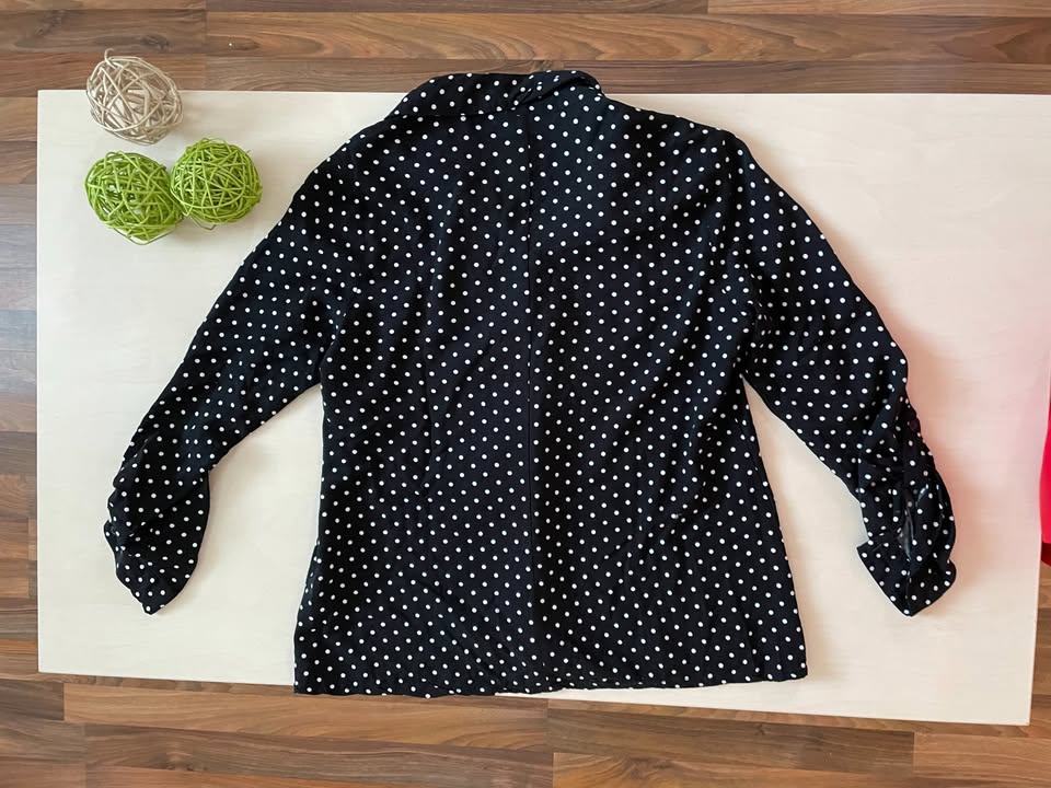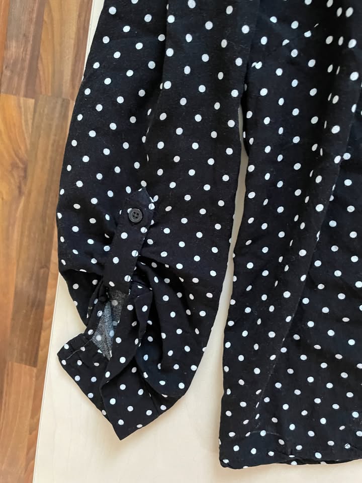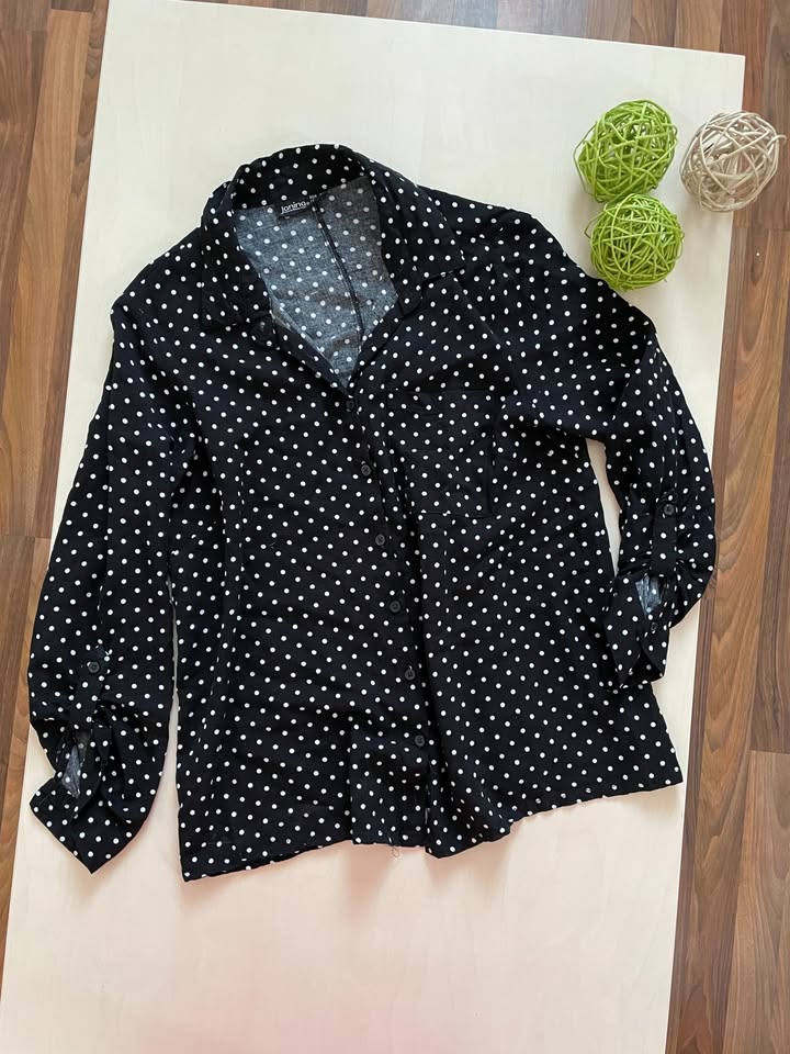 1041. nabízím k prodeji tuto volnou pohodlnou košili s bílým puntíkem, vel 38/M, Janina. Materiál příjemný, takový měkčený, nemačkavý. Na prsou kapsička, jinak klasika - rozepínací na knoflíky.Složení materiálu neuvedeno, takové měkčené pláténko. Nošena, bez vad jen uložením pomačkaná, krsáná