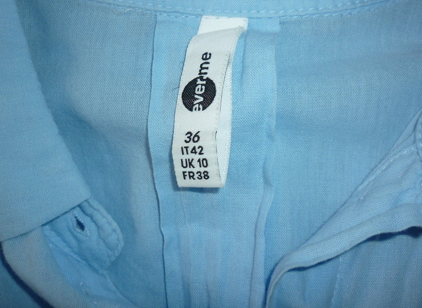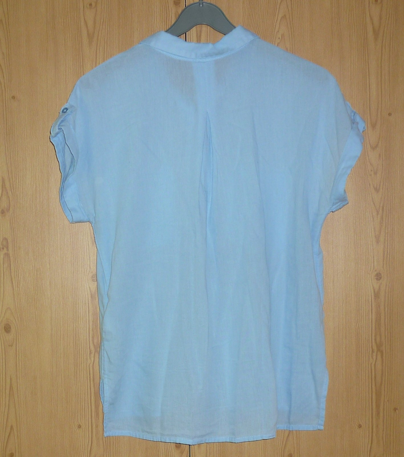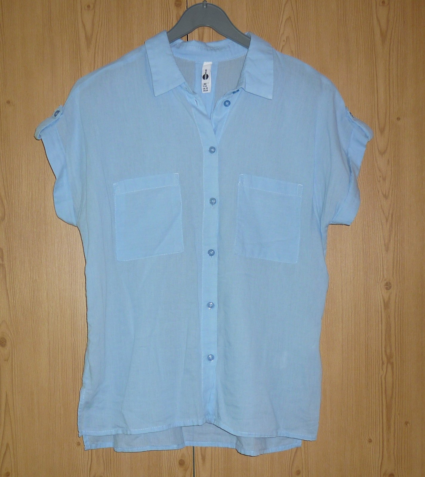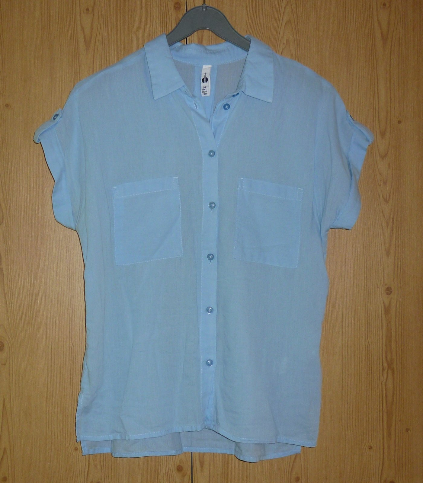 Prodám světle modrou dámskou košili Takko Fashion, 2x na sobě, ve velmi dobrém stavu. Límeček, celopropínací na knoflíky, vpředu nahoře 2 našité kapsy, spadené krátké rukávky s ohrnutím, na bocích ve švech rozparky, přední díl je kratší než zadní díl. Materiál: 100% bavlna. Velikost: 36. Rozměry: šířka v místě podpaží 52cm x 2, celková délka předního dílu 62cm, celková délka zadního dílu 69cm. Cena: 60,-Kč + poštovné. Koukněte na moje další inzeráty, třeba si něco vyberete a ušetříte na poštovném. Tel.: 728 455 567