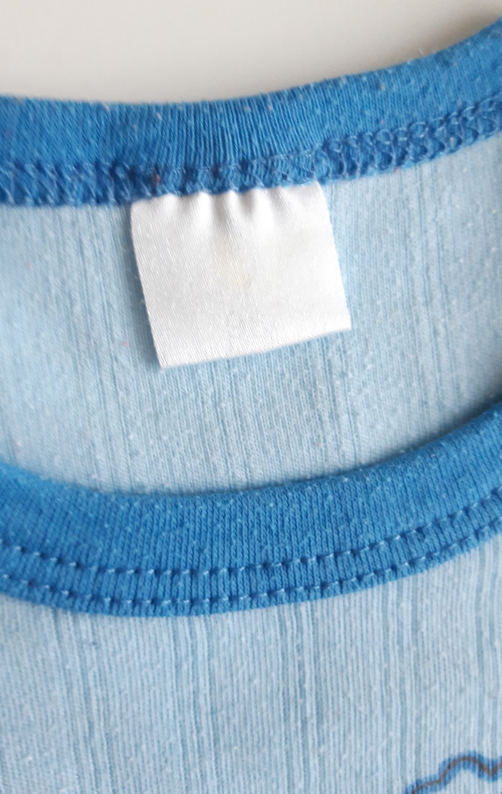 Světlounce modré body, na rameni rozepínací. Po jednom dítěti. Uvedená velikost je 98, ale dle rukávů nám vyšlo nejlíp jako 86.