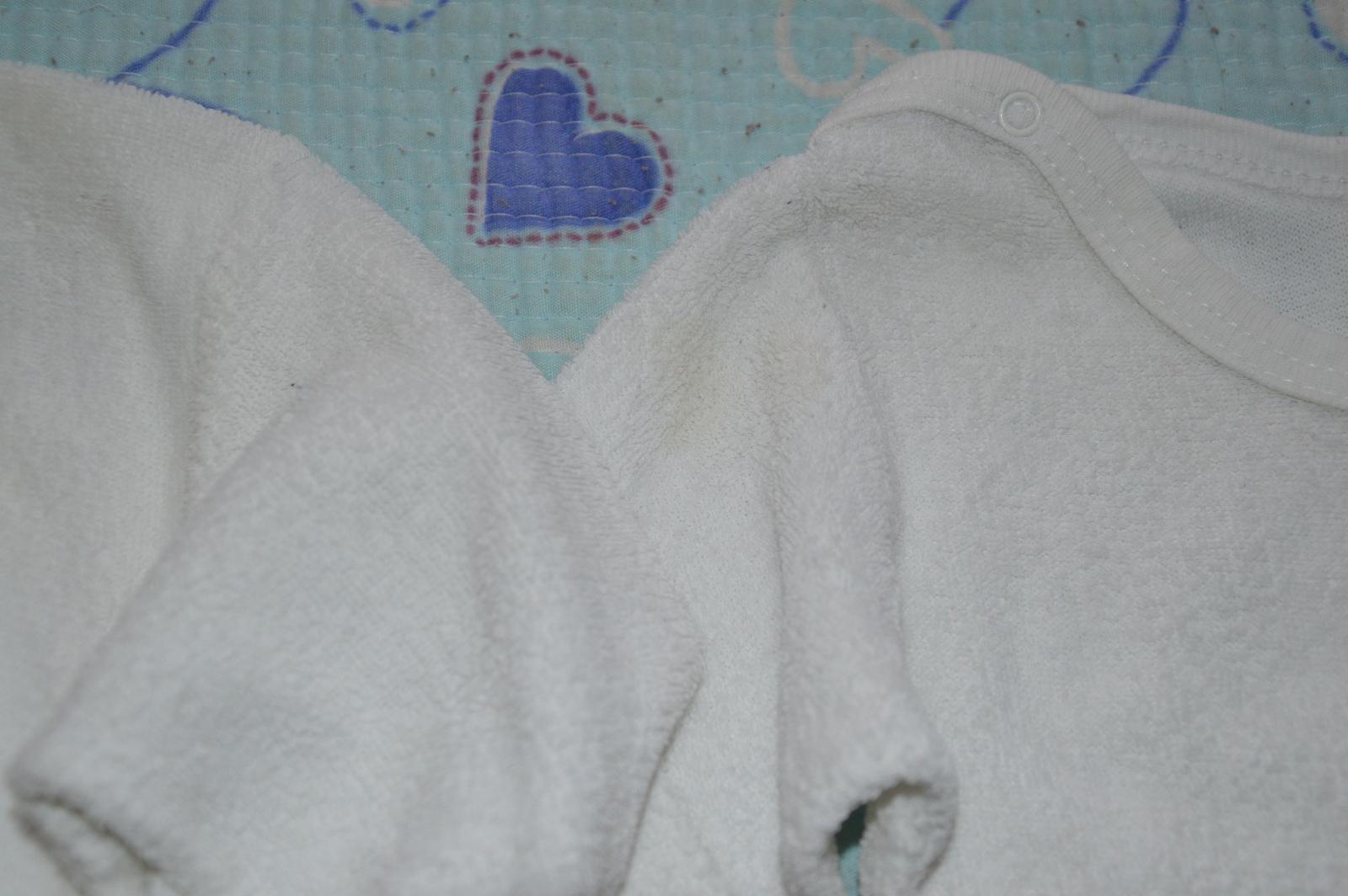 teplé, froté bodýčka s dl. rukávem, praktická, příjemná, bílá, našla jsem jeden flíček od mléka, třeba doperete, já nebělila, práno v dětském prášku. délka 39 cm, cena za obě