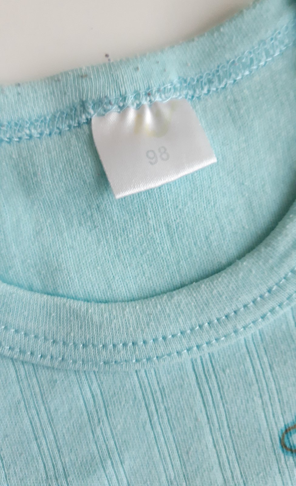 Světlounce tyrkysové body, na rameni rozepínací. Po jednom dítěti. Uvedená velikost je 98, ale dle rukávů nám vyšlo nejlíp jako 86-92, délka rameno rozkrok je 47 cm.