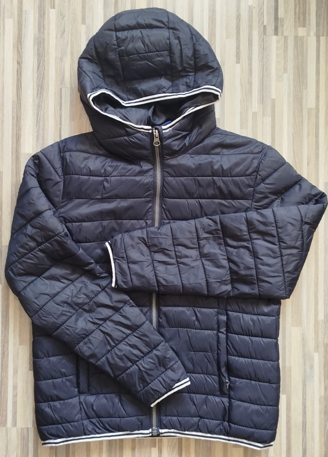 Přechodná bunda vel. 146, zn.Pepperts. 100 % polyester. Tmavě modrá ze spoda přechází do šedé nahoře. Pěkný stav! PD vč.stojáčku 57cm, ZD 62,5cm, bez stojáčku 51 a 55. Šíře 2x45 cm, rukáv od krku 6...