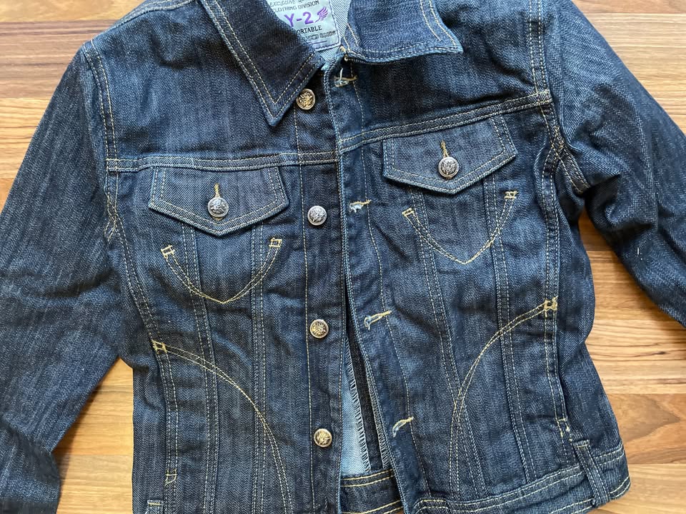 1078. nabízím k prodeji tuto džínovou bundu, vel neuvedena ale měla by odpovídat XS, v prsou je úzká tak klidně i XXS - prosím měřte. Nošená párkrát jako nová, tmavší šisovaná džínovina (maličko tmavší než na fotu) prošívaná žlutou nití., kapsičky na prsou s prošitím do úsměvu. Menší boční kapsy. Zapínání na ozdobné knoflíky. Materiál 97% bavlna 2% bavlna. Nošené málo, bez vad, krsáné