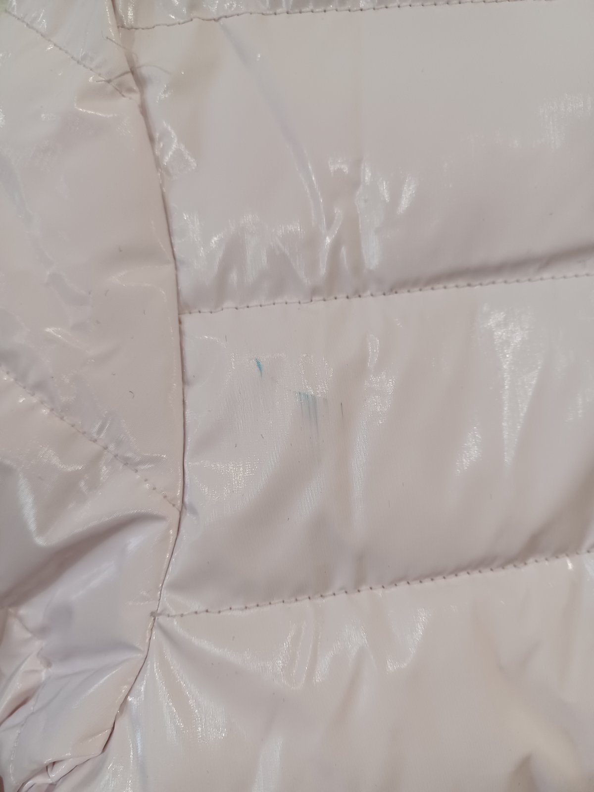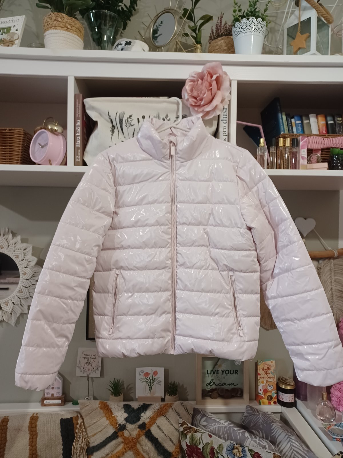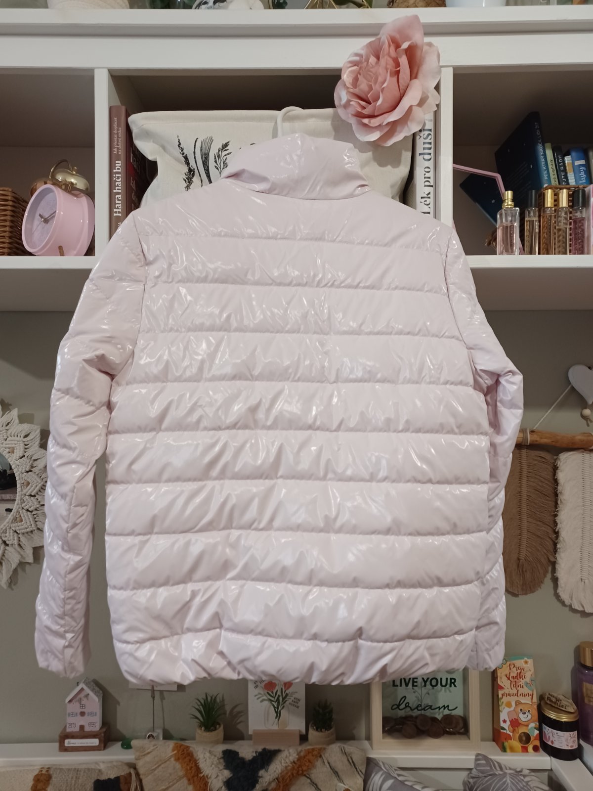 Luxusní lesklá bunda, barva hodně světlounce růžová, jednou praná. Nepatrné namodralé zašpinění od nějaké barvy viz foto, zohledňuji v ceně. Vel. 164, sedí S.