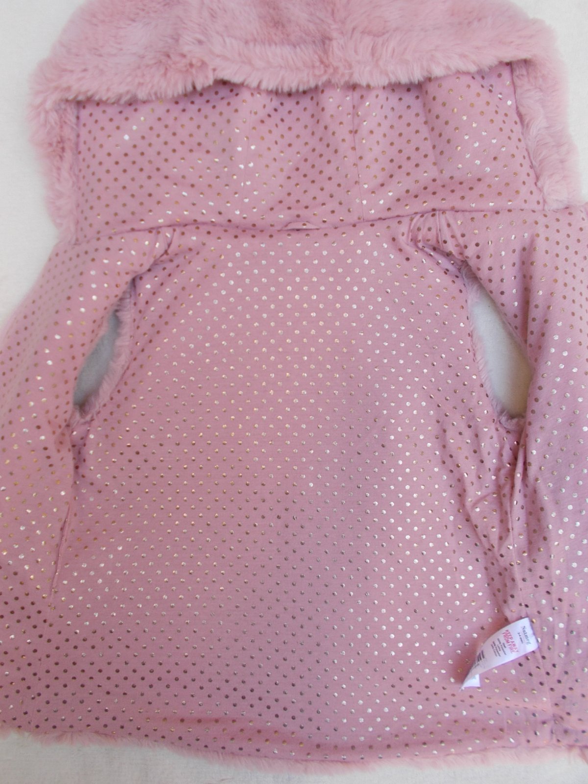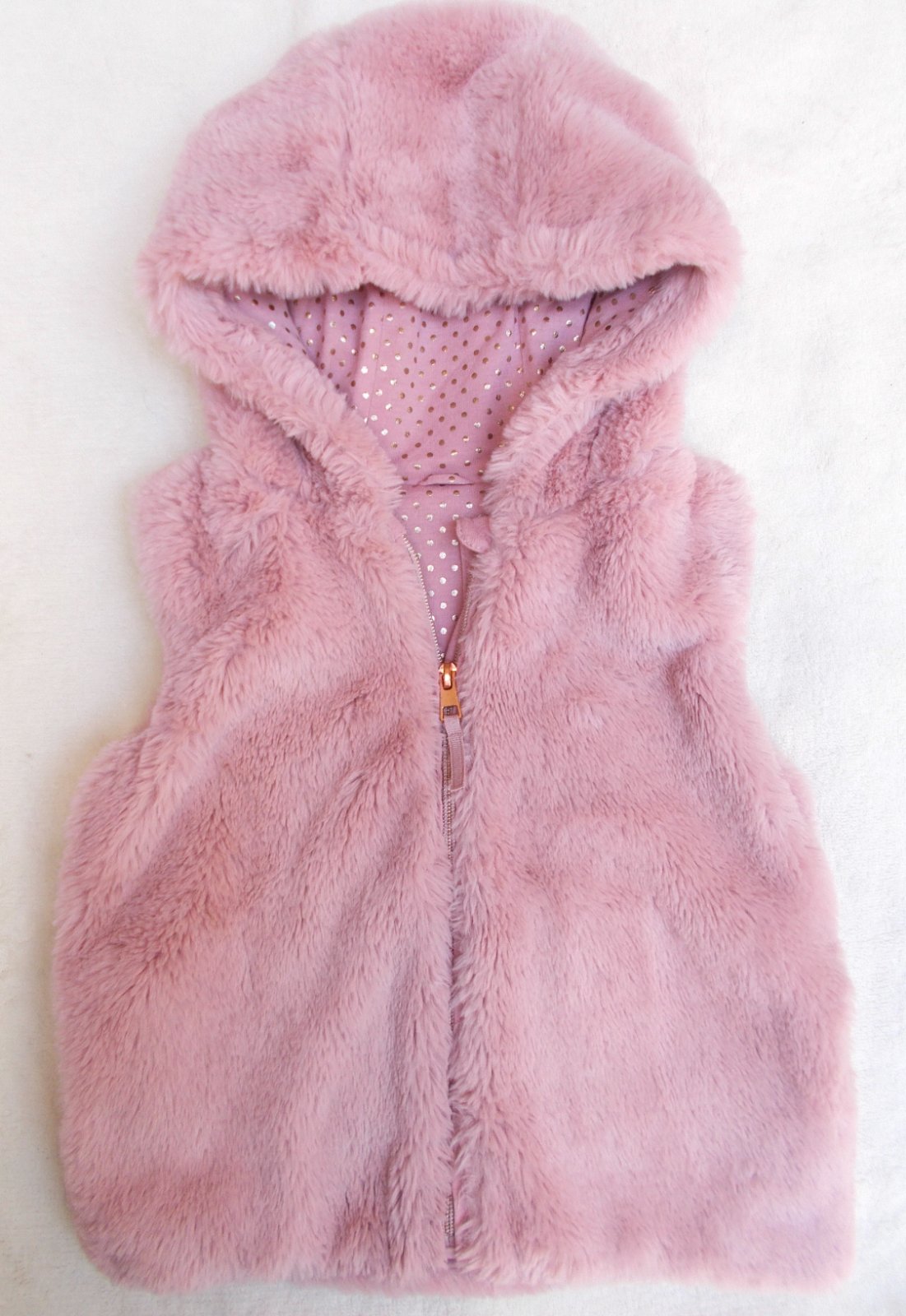 2. Nádherná chlupatková jarní vesta v super stavu. Světle růžová, nadýchaná, hřejivá, podšitá růžovou bavlnou se zlatými puntíky. Zapínání na zip, dvě boční kapsičky.