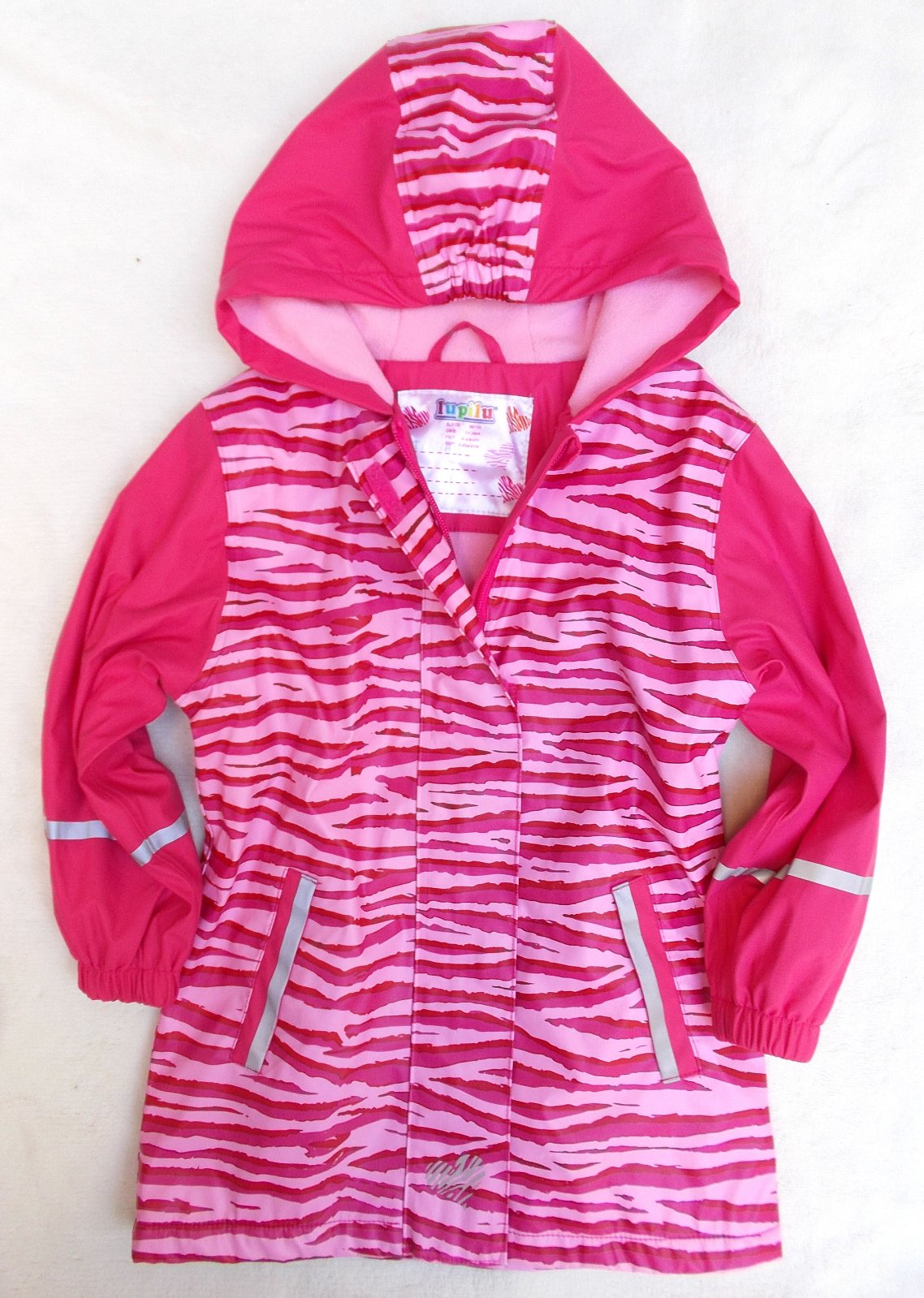 1. Krásné jarní nepromokavý kabátky / delší bundičky - pogumované, podšité hřejivým fleecem, zapínání na zip + léga, reflexní prvky. Na kapuci je gumička - kapuce tak dobře drží na hlavě a nepadá.
