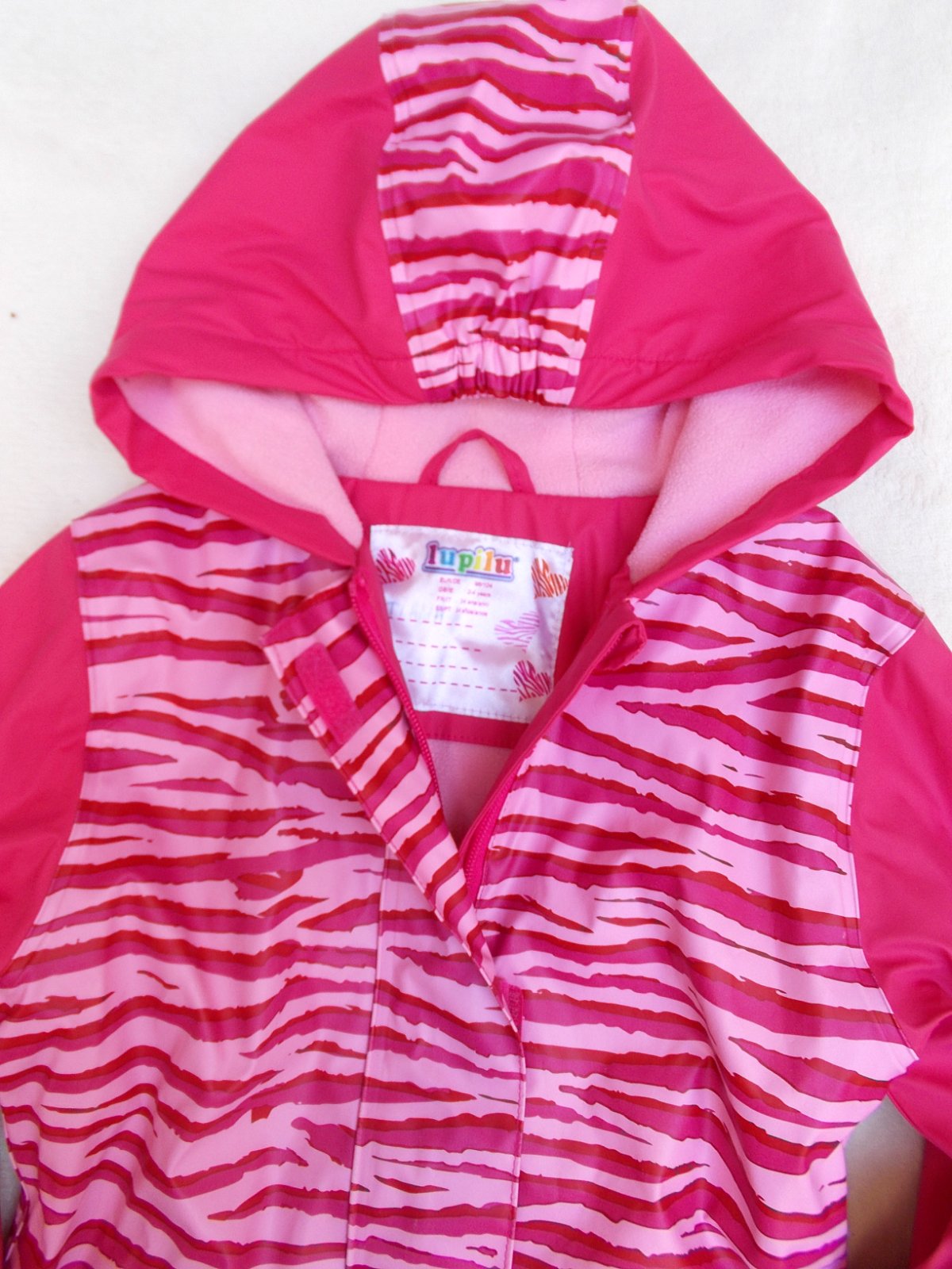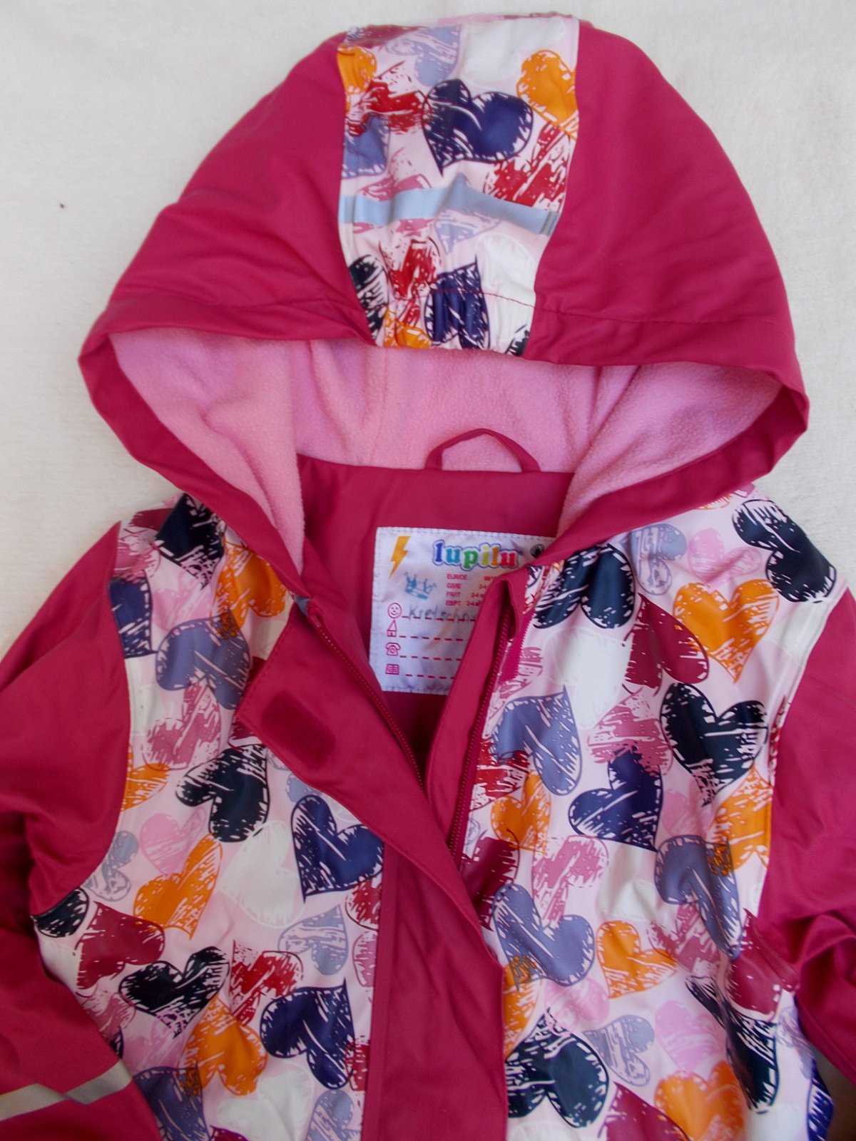 Sytě růžový: Délka 54 cm, šířka 38 cm (cca v polovině kabátku), rukáv od kapuce 44,5 cm. Srdíčkovaný: Délka 54 cm, šířka 38 cm pod prrůamky, rukáv od kapuce 43,5 cm.