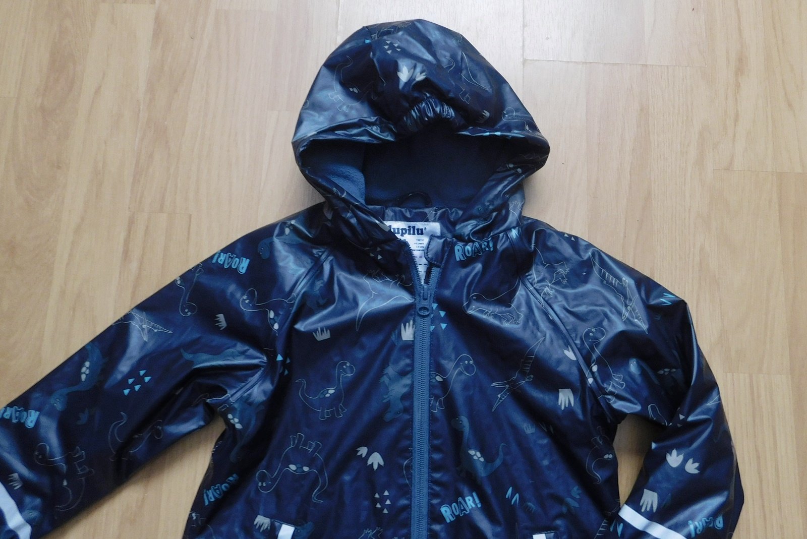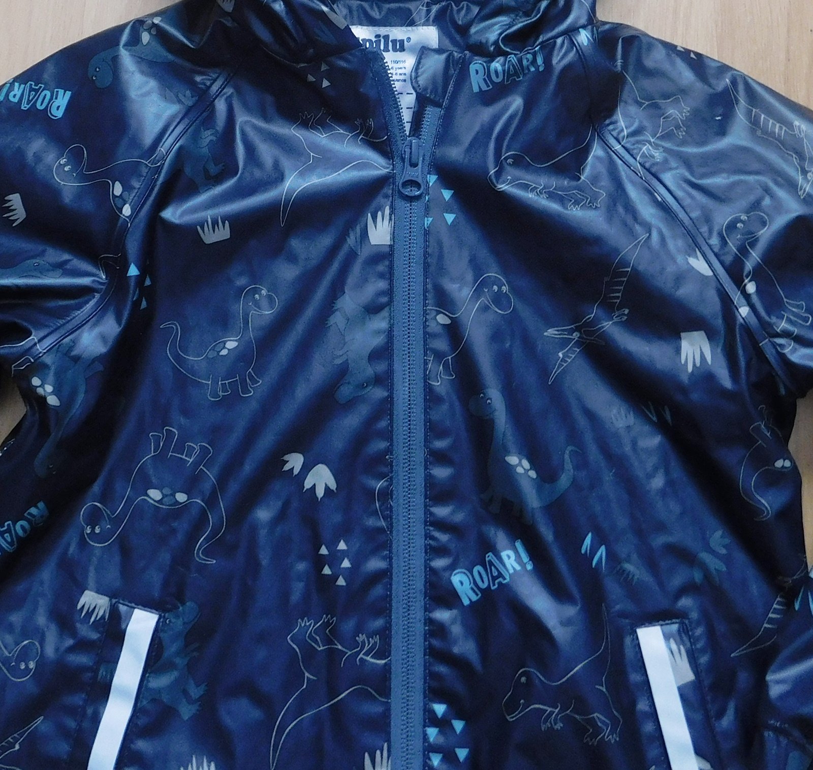 s dinosaury,pogumovaná,podšitá flís. podšívkou,kapsy,zapínání na zip,kapuce,refl.prvky,d.47cm,š.38cm,ruk.od krku 45cm,vhodná k běžnému nošení,do města,na turistiku