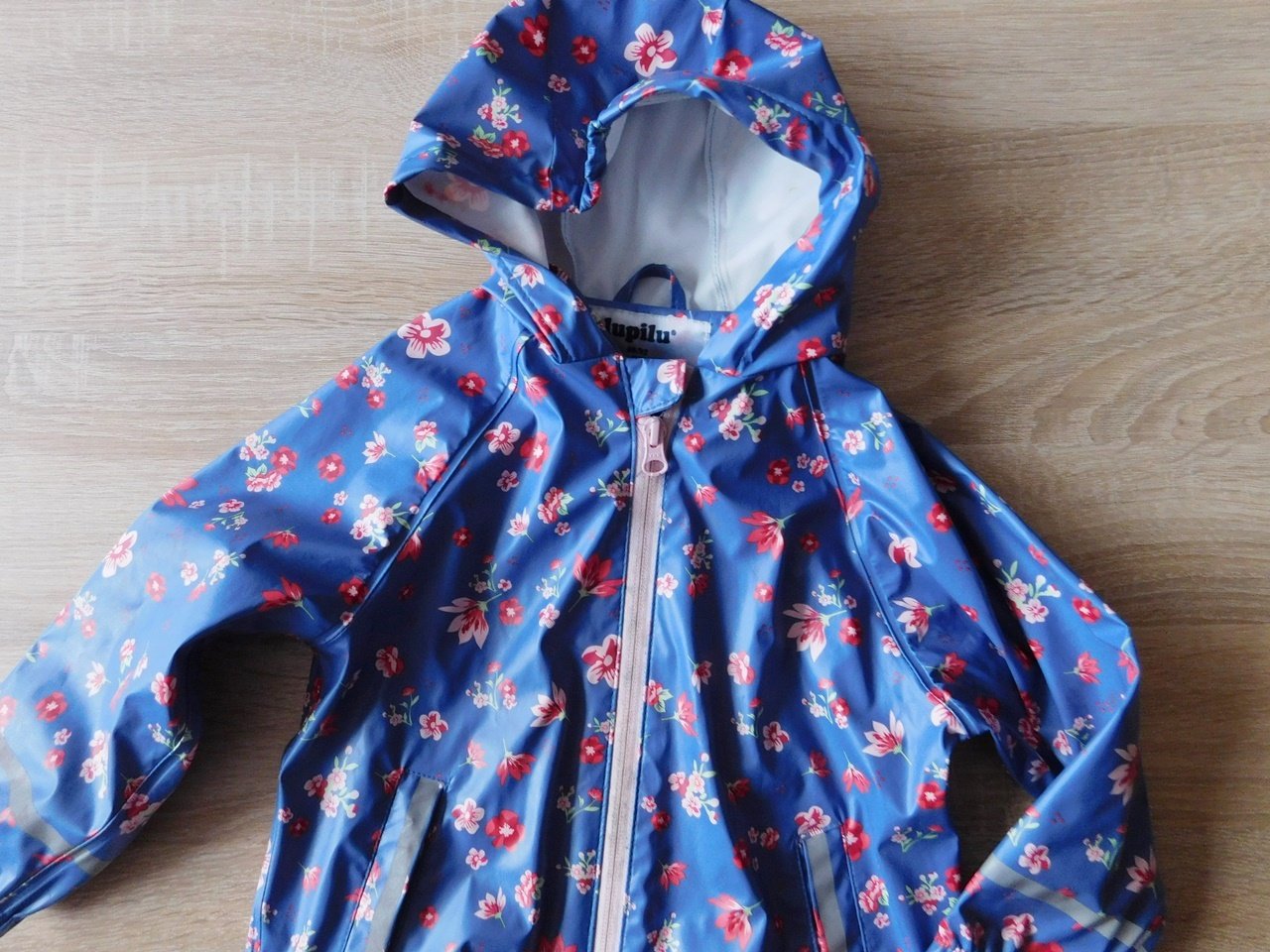 motiv s kytičkami,pogumovaná,nezateplená,kapucka,kapsy,zapínání na zip,reflexní prvky,d.41cm,š.33cm,ruk.od krku 37cm,vhodná k běžnému nošení,do města,na turistiku