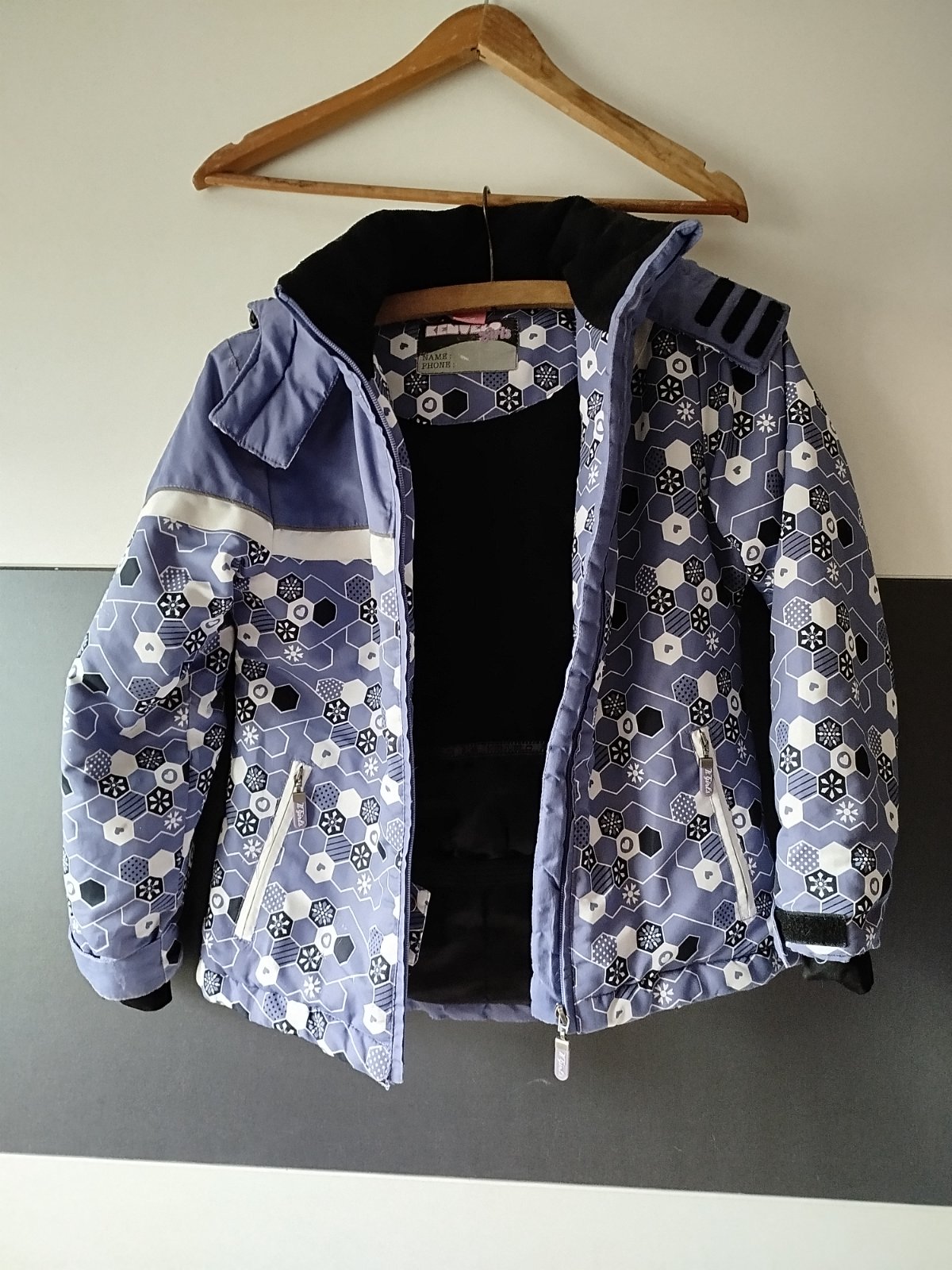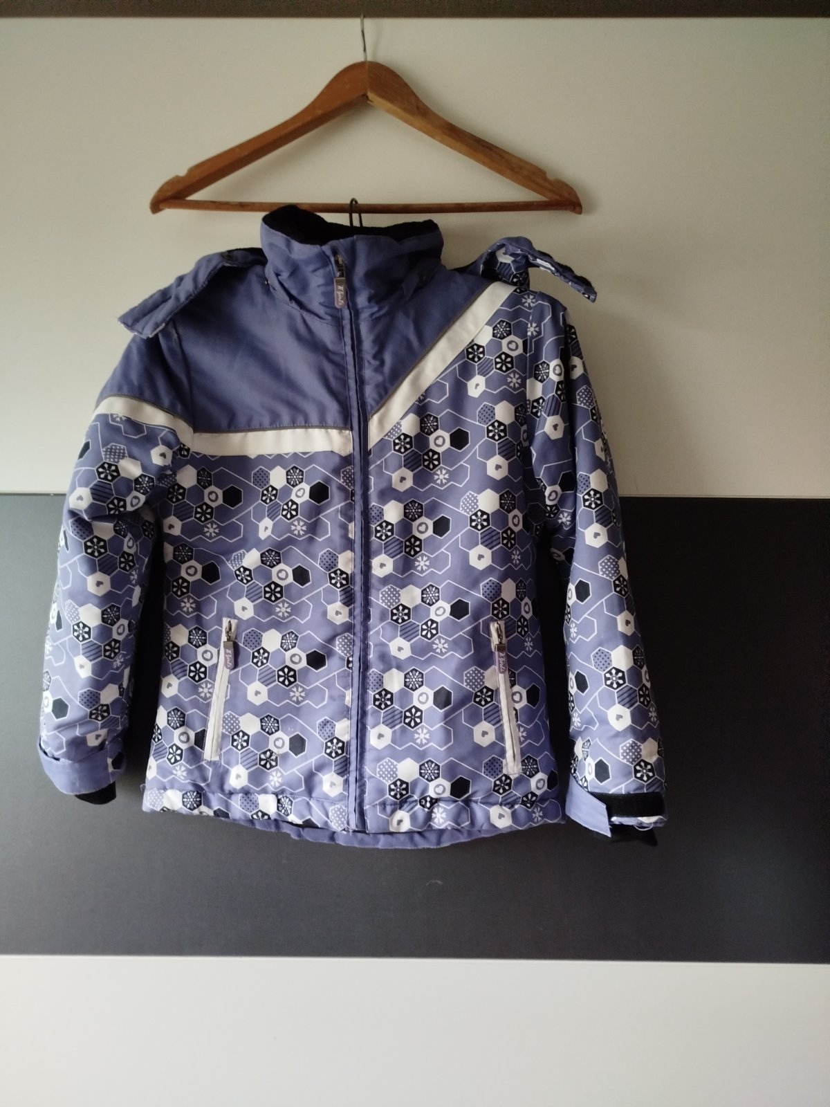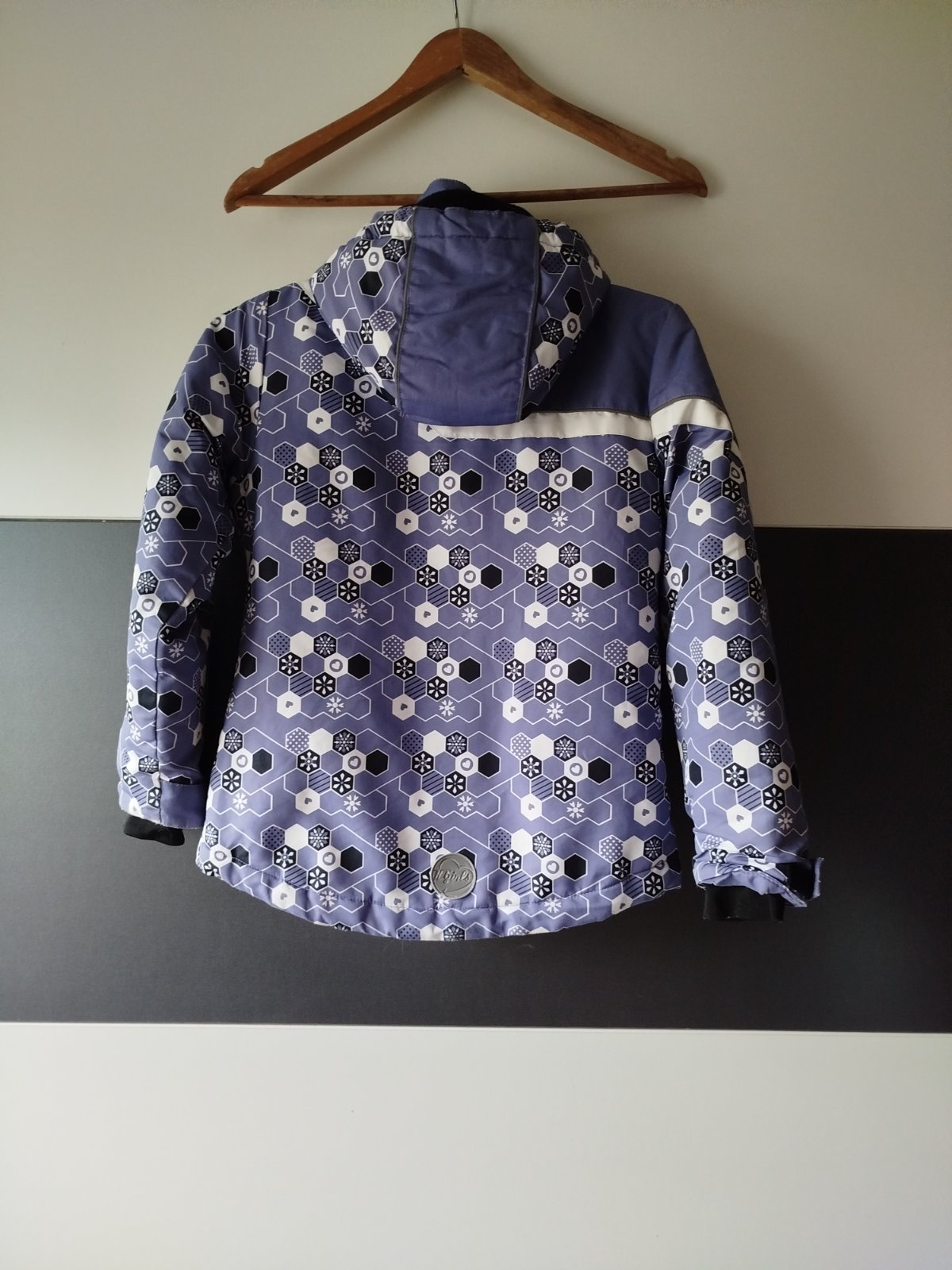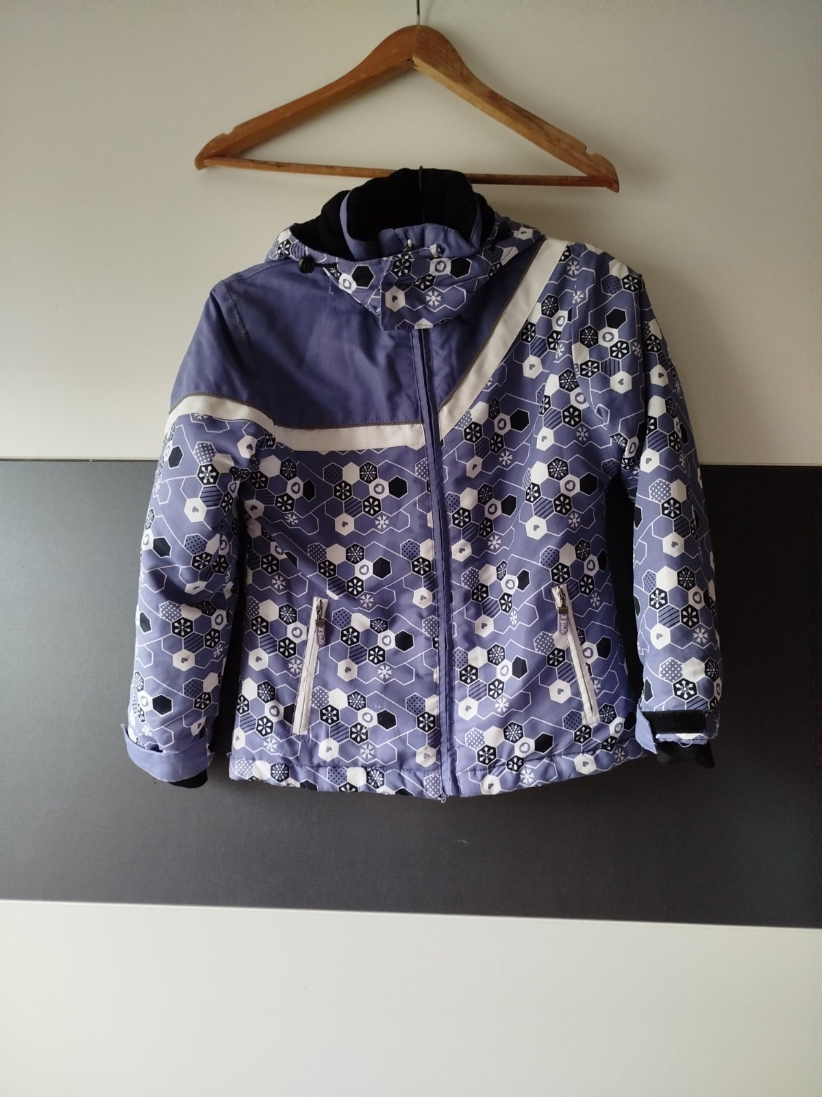 Délka přední díl 54cm, zadní 59cm, šířka 45cm, rukáv od ramene 51cm, kapuce odepínací, rukávy se dají stáhnout suchým zipem, je teplá, bohužel dole u lemu poničená viz poslední foto, vhodná na lítačku, jinak není zničená